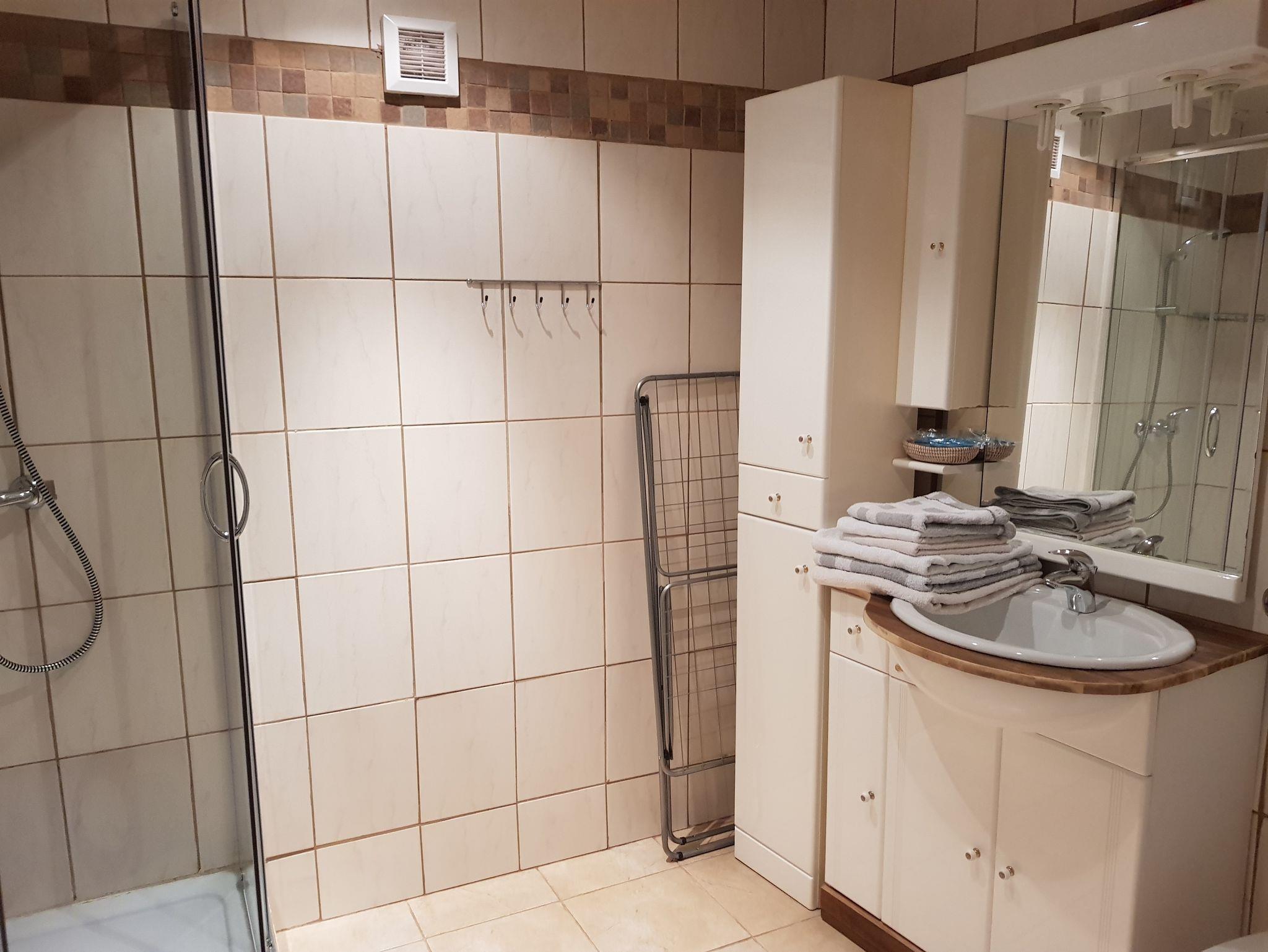 Im Badezimmer mit Dusche sind Pflegeartikel wie Duschgel, Seife und natürlich auch ein Föhn verfügbar. Ausreichend Handtücher, Hausschuhe und ab 3 Tagen Aufenthalt auch Bademäntel gehören mit zu unserer Standard-Ausstattung.