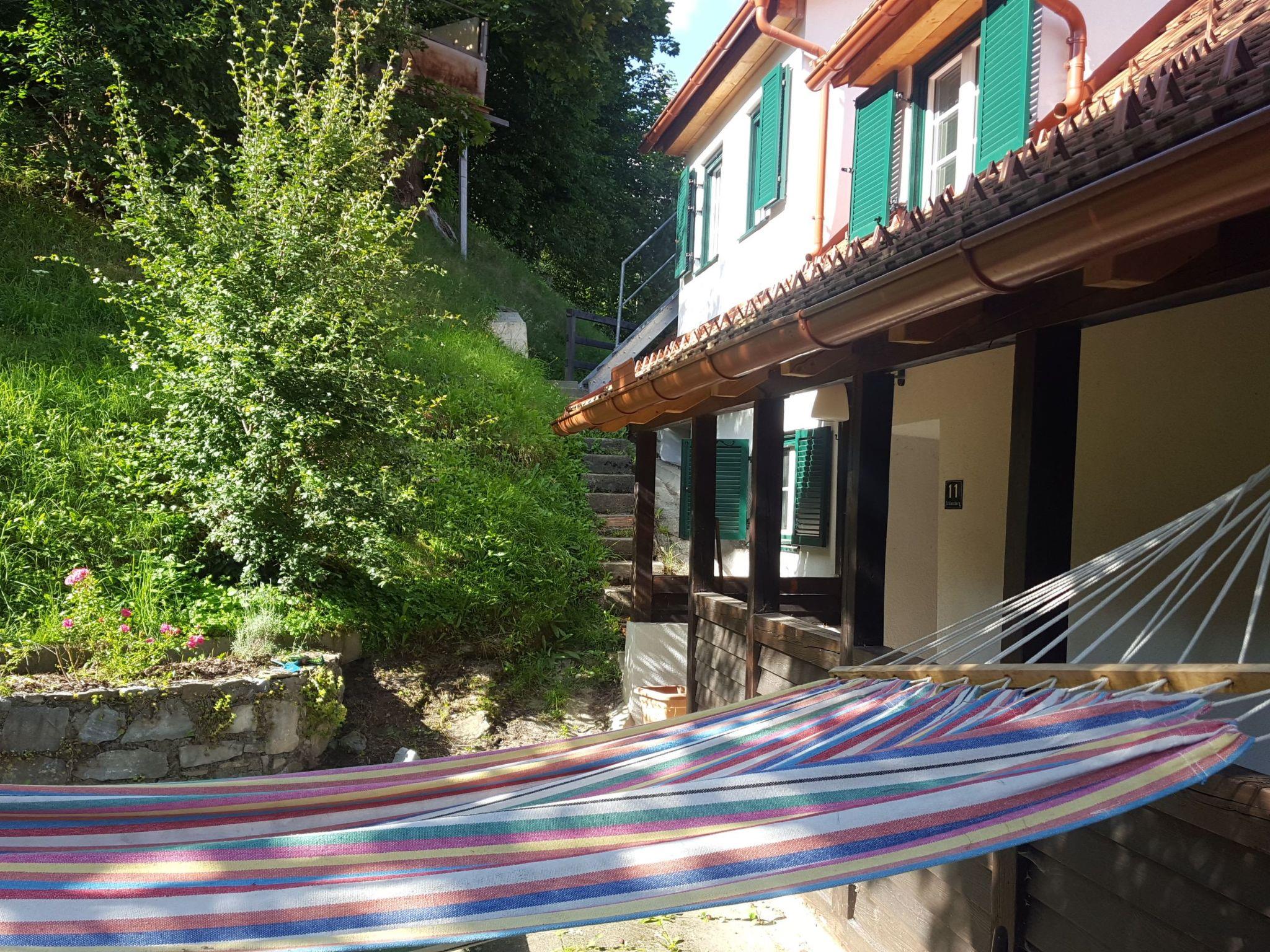 Panorama sauna in the outdoor area with sunbathing terrace, rock shower in summer and cold water connection; "Salettl" with table and 8 cosy seats, Weber gas barbecue and hammock. There is a large car park as well as a high-quality professional giant trampoline and a swing under the old apple tree.