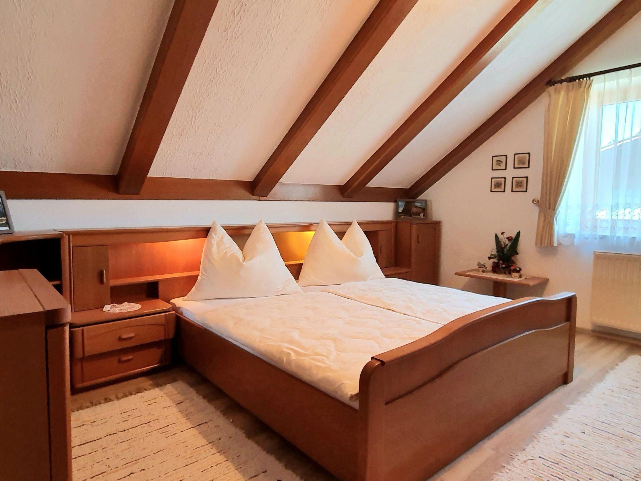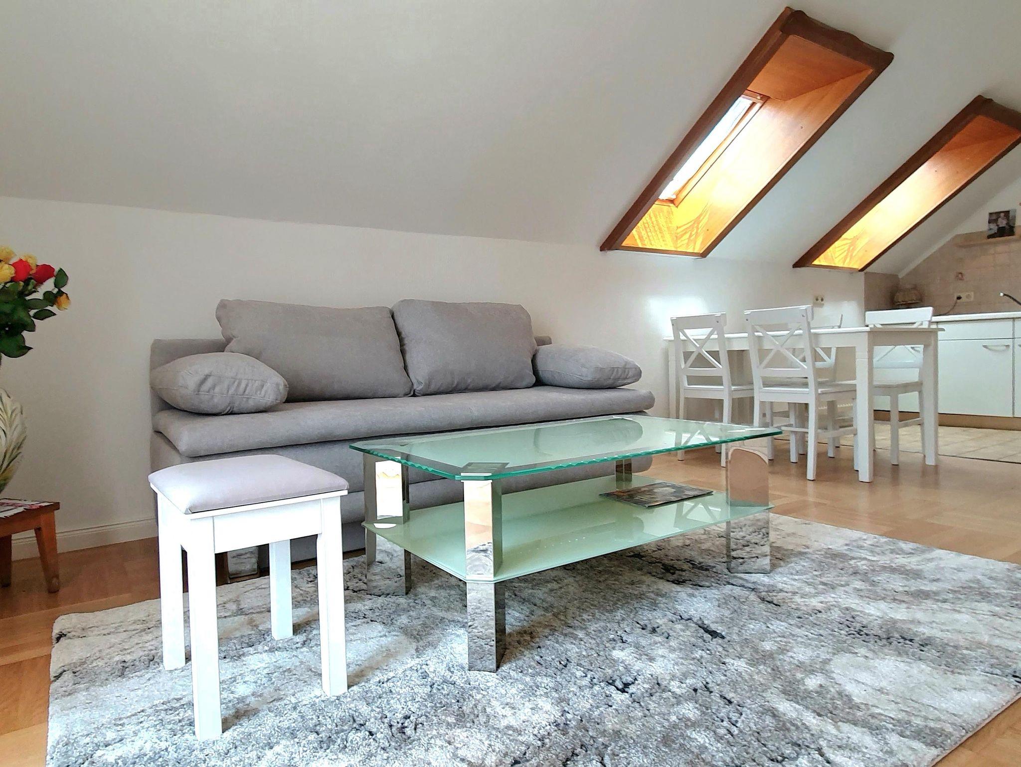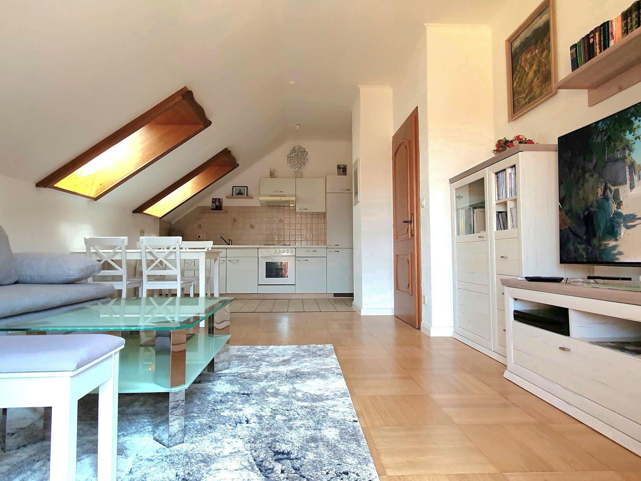 In unserer Ferienwohnung im Dachgeschoß auf 73 m² Wohnfläche mit einem Schlafzimmerzimmer und einer Wohnküche mit einem Schlafsofa haben bis zu 4 Personen Platz.