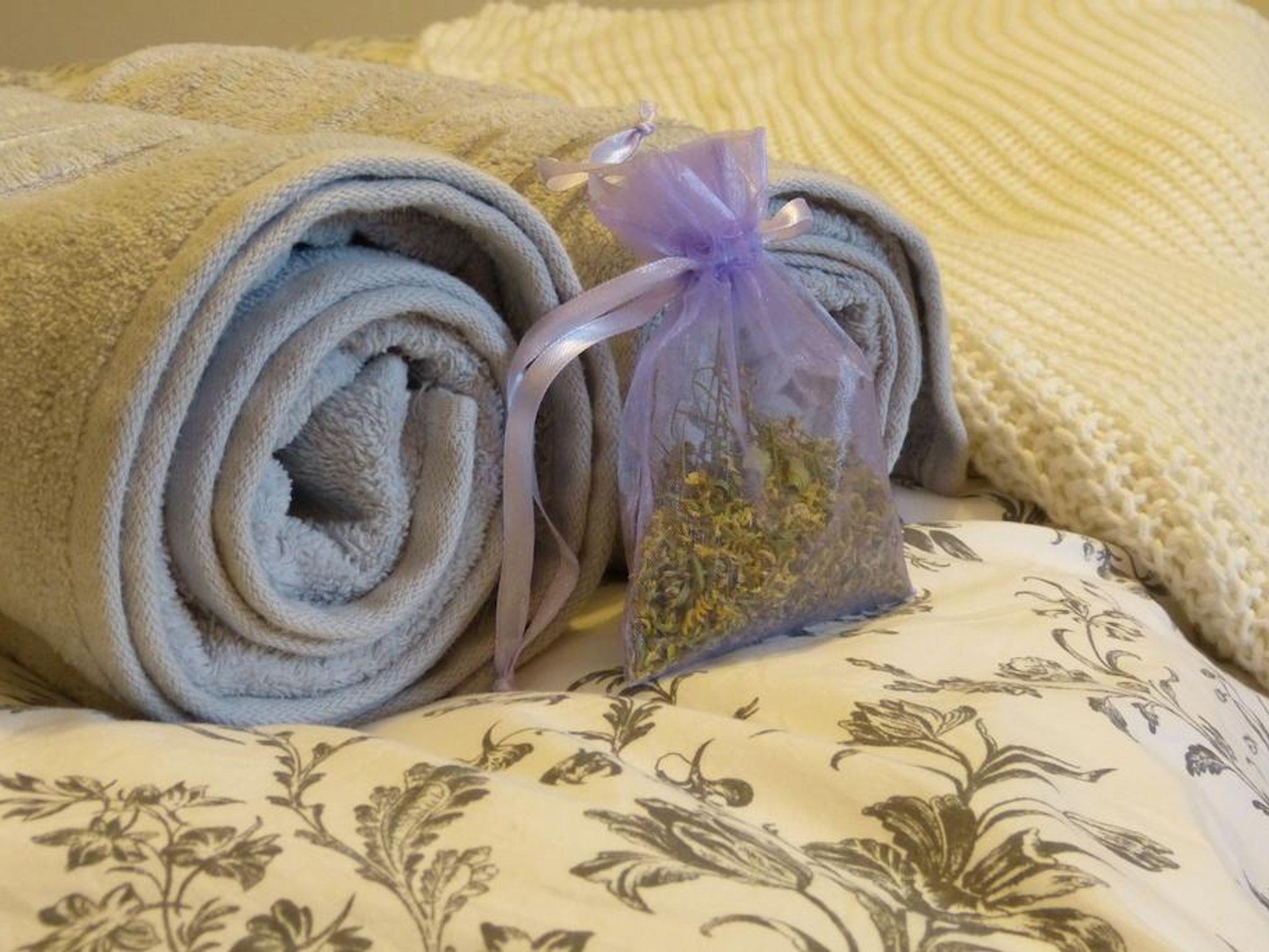 … im Raum weisen schon auf den Zimmernamen hin. Der alte Schrank aus Großmutters Zeiten, der Vollholzboden und die moderne, lila Glaswand im Badezimmer zeigen die gelungene Verbindung von Altem und Neuem.