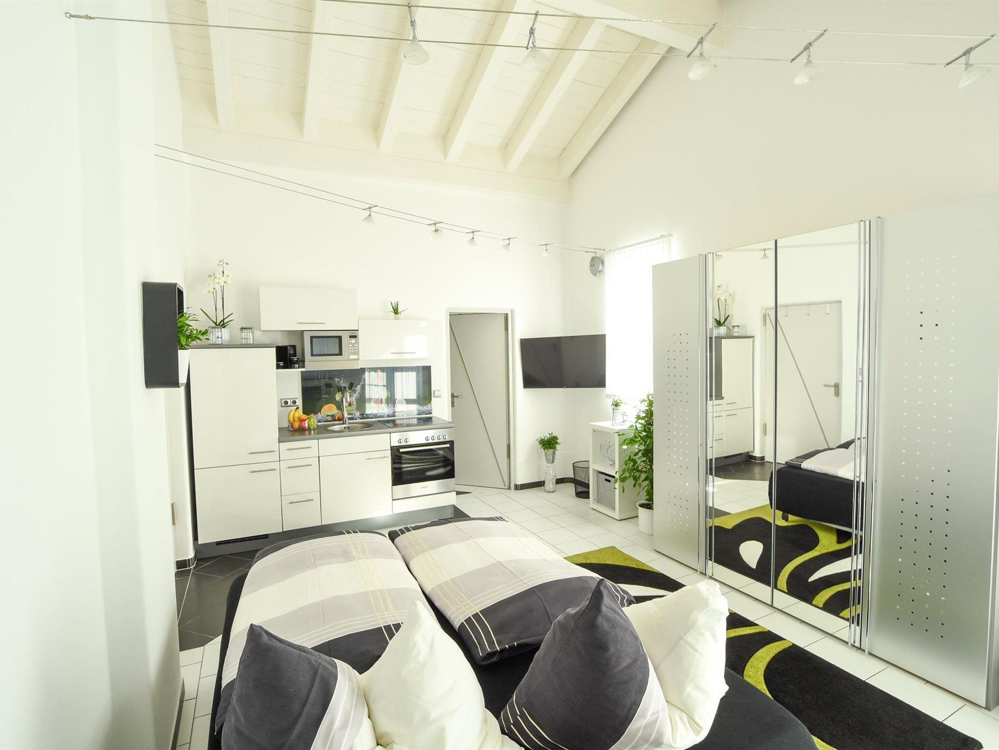 Wohn-Schlafraum mit Esstisch, Küche u. Schlafcouch, Badezimmer (WC/Badewanne/Waschmaschine) Sat-TV,W-Lan,Dachterrasse, Autoabstellplatz.