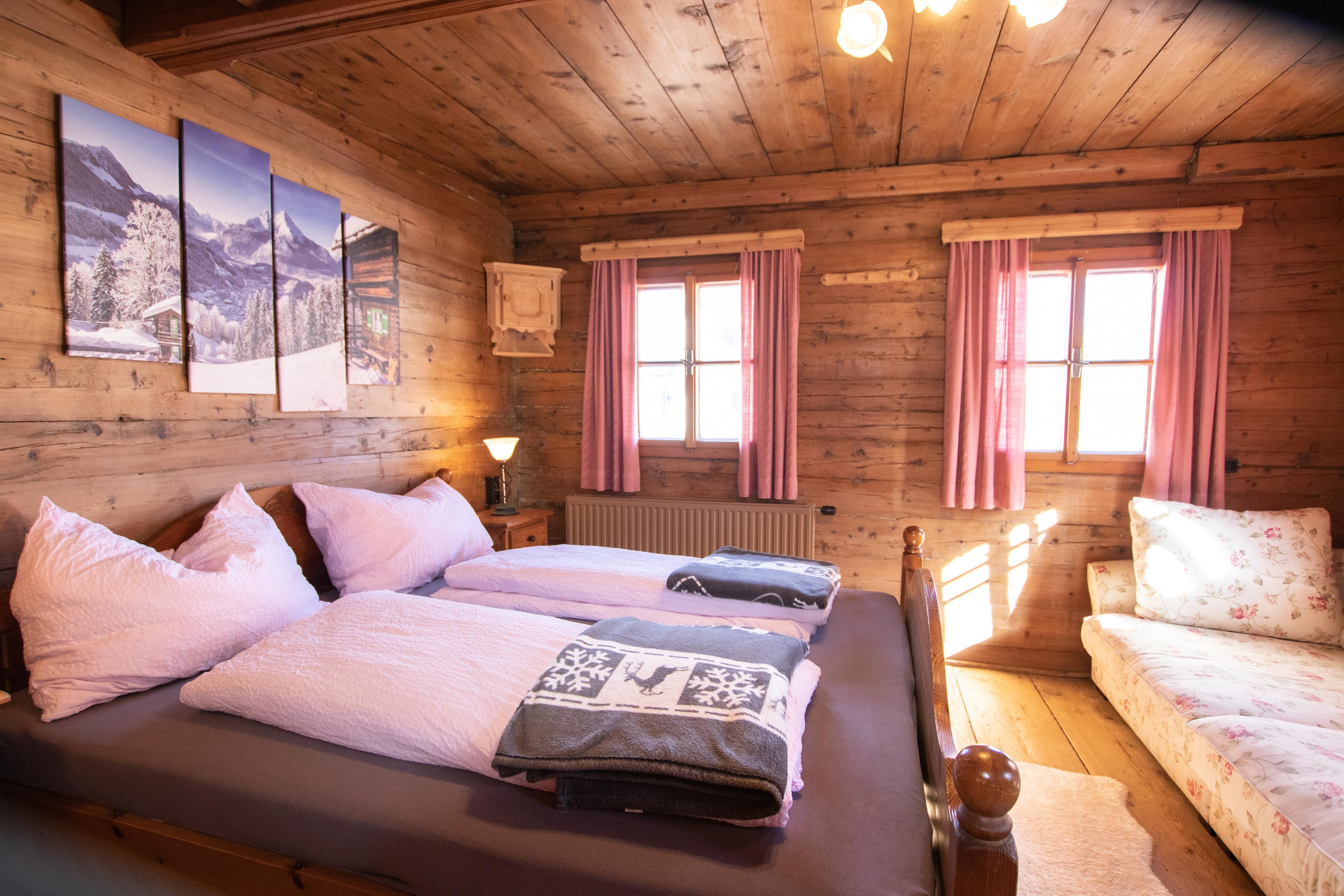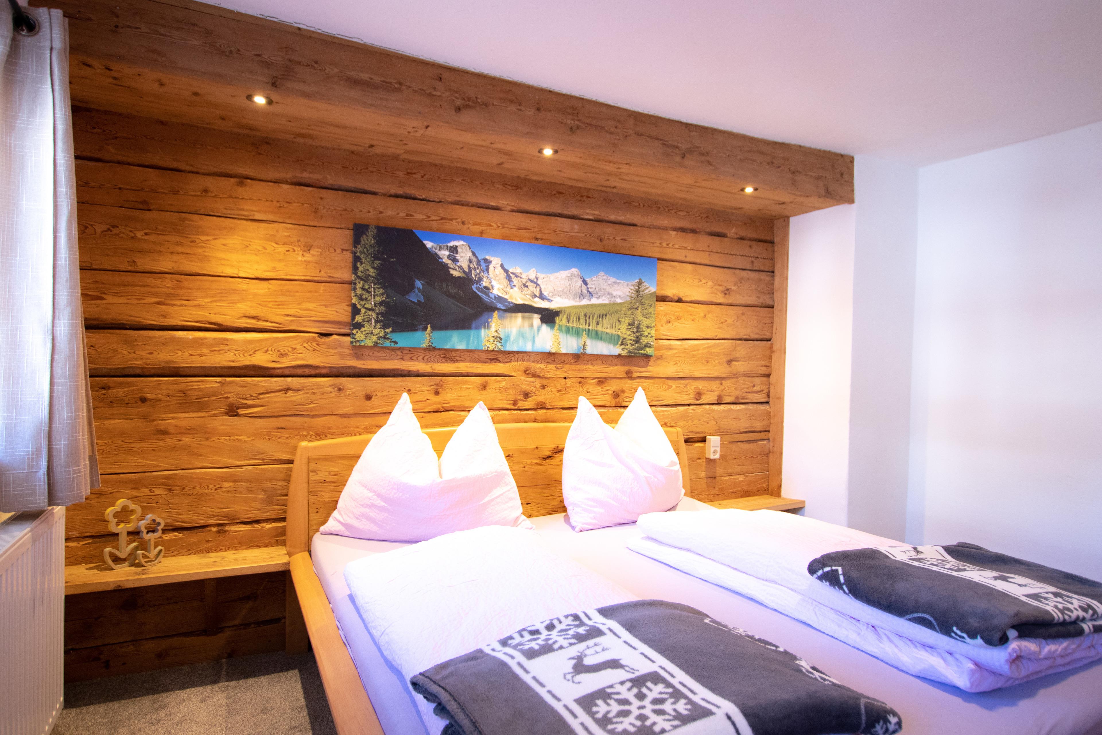 In die 1 Etage mit 1 Doppelzimmer, 1 Doppelzimmer mit Doppelbett und Bettcouch. Dusche/WC, gelangen Sie über eine schmale Holztreppe im Treppenhaus.