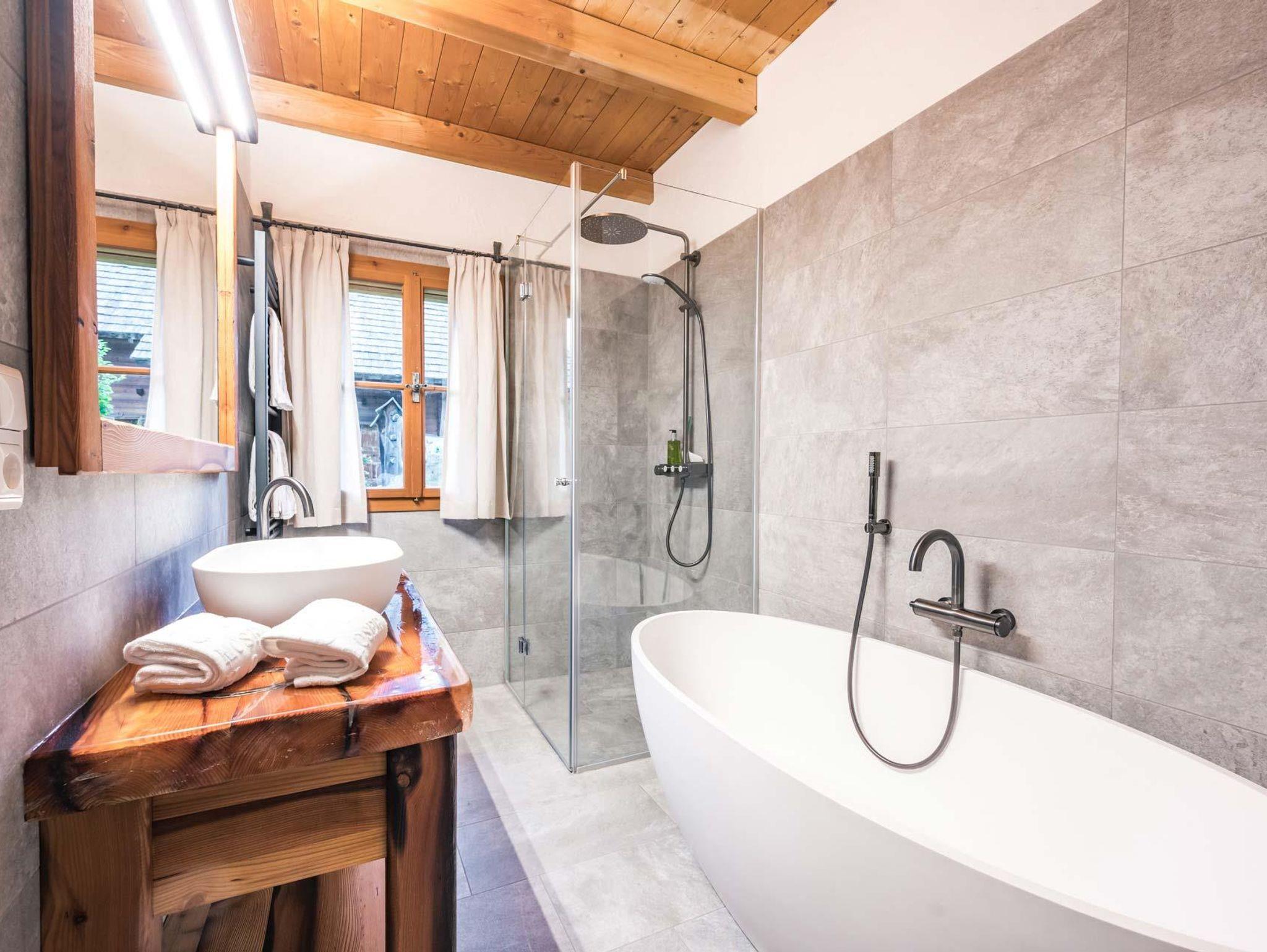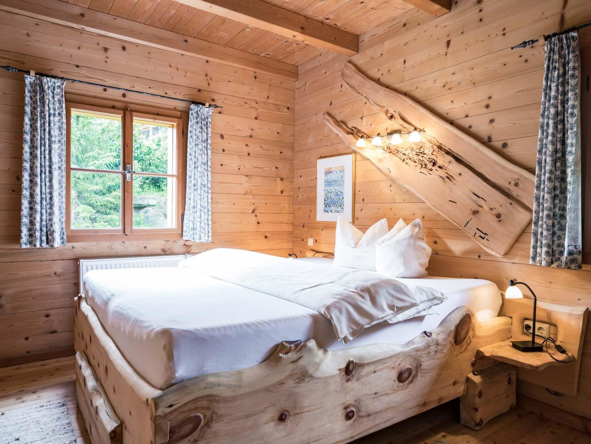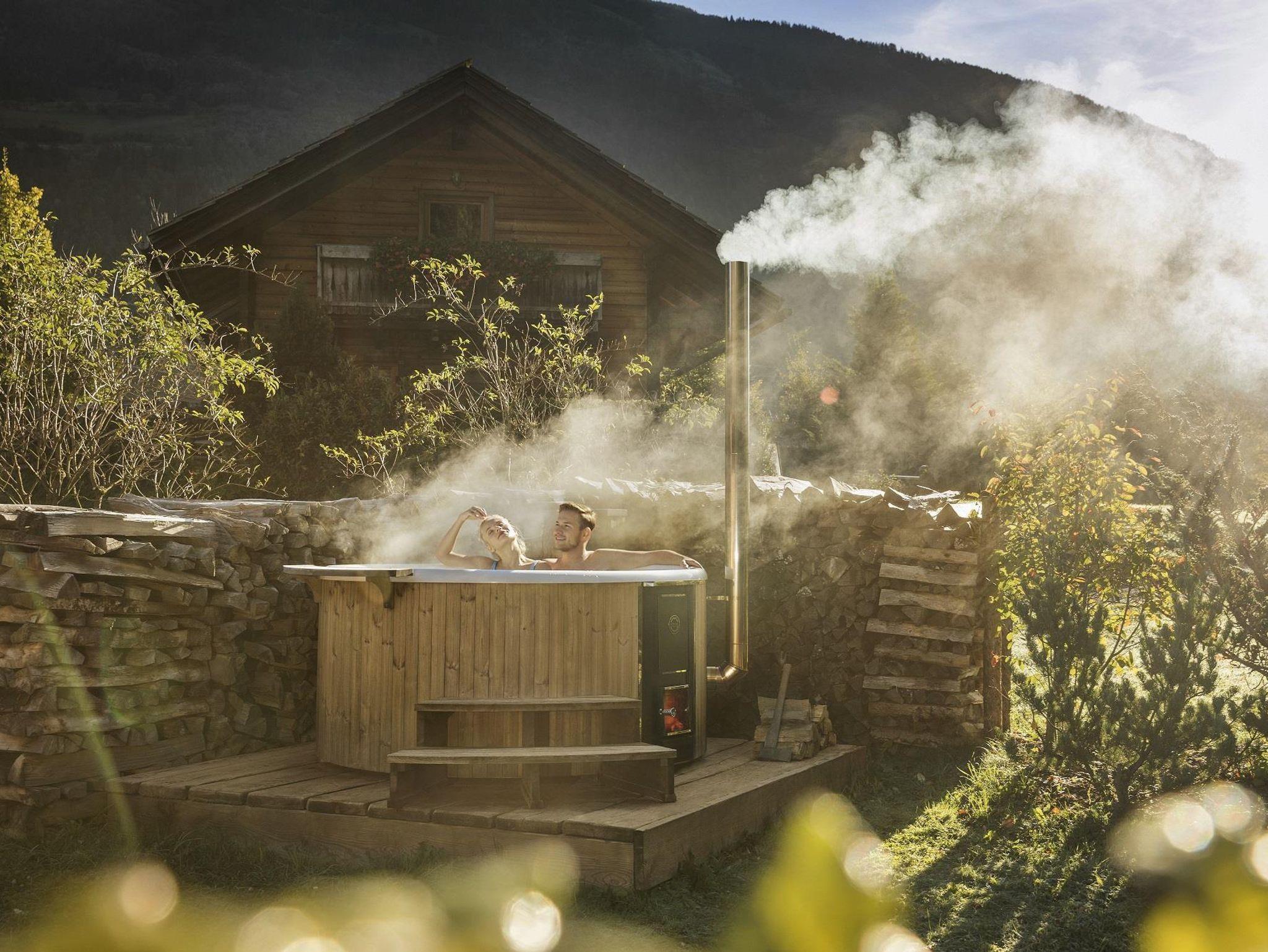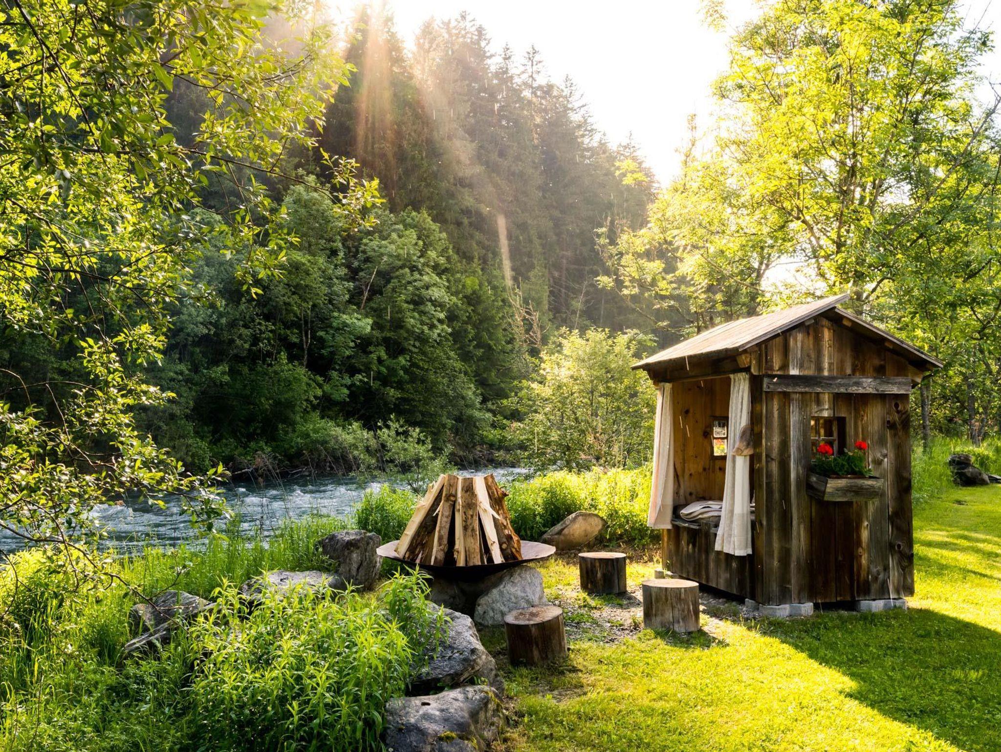 Eines der beiden Schlafzimmer im Obergeschoss hat einen zusätzlichen Wohnbereich. Eine große möblierte Terrasse mit Grill und einzigartigem Ausblick auf den Badeteich und den Wildwasserfluss, sowie eine eigene Liegewiese mit einem privaten Hot Tub und einer privaten Sauna mit Ruhebereich für romantisch entspannende Stunden laden zu einem gemütlichen Aufenthalt ein.