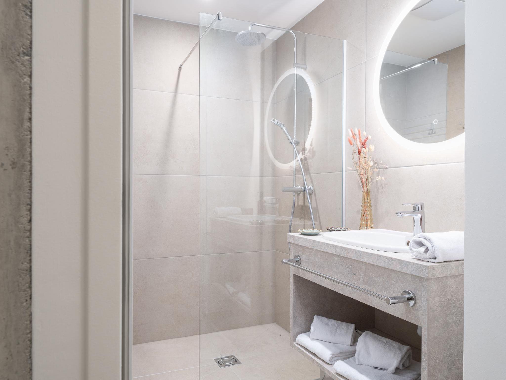 The apartments are beautiful and clean, perfectly equipped. There is a ski storage room in the house with boots heater, very useful. Parking garage is under the building, very convenient to reach the room, parking spots are spacious.