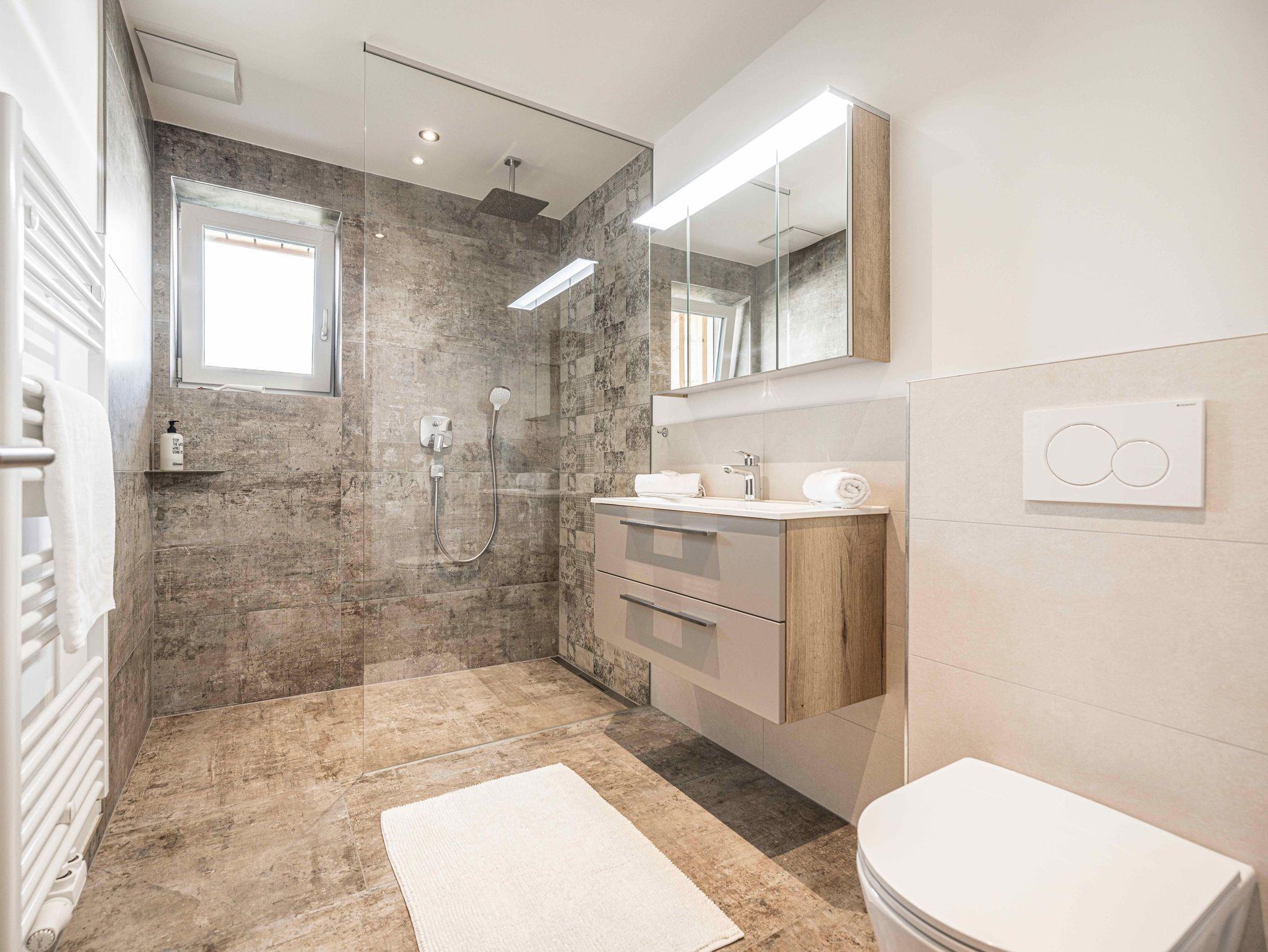 Das moderne Badezimmer verfügt über eine Regendusche, Waschtisch mit Spiegel, WC, Föhn und Handtücher.
