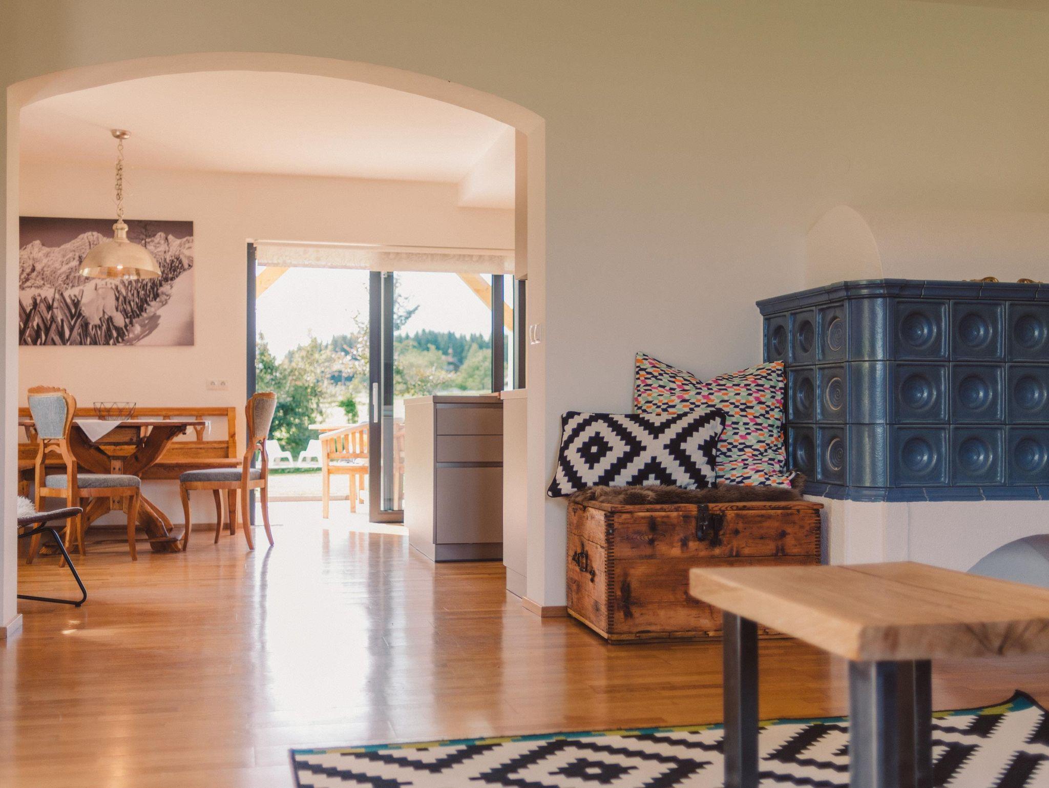 Der Stil ergibt sich aus der Geschichte des Hauses, eine gelungene Mischung aus Moderne und steirischem Bauernstand, mit hohen Räumen, großen Fenstern. Einzelne Kästen und Truhen sind aus dem 19. Jahrhundert und prägen den stimmungsvollen Charakter.