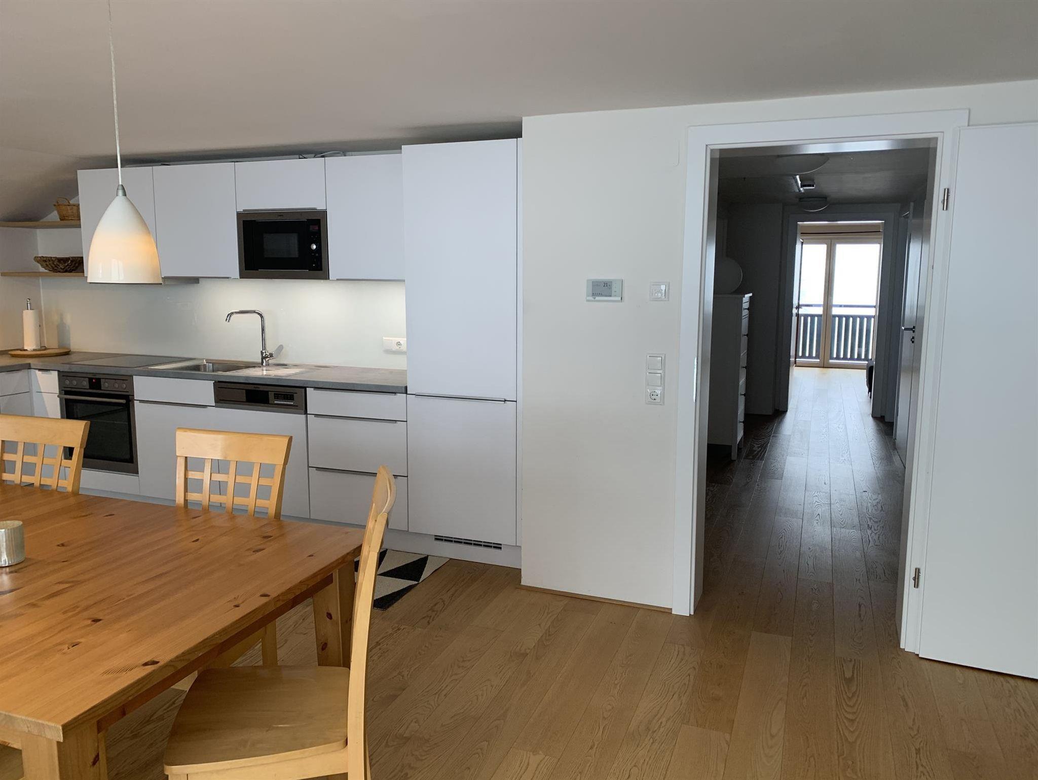 Das Appartement befindet sich im 2.Stock in einem Betriebsgebäude und verfügt über einen grosszügigen Eingangsbereich mit offener Treppe, über die man zu der Wohnung mit 3 geräumigen Schlafzimmer (2 davon mit Balkon), 1 großes Bad mit Dusche, Badewanne, WC, plus ein separates WC und einem gemütlicher Wohnbereich gelangt. Die extra großer Küche ist das Herz des Appartements. Von dort kommt man auf die schöne, große und sonnige Terrasse mit Blick auf das Fellhorn.