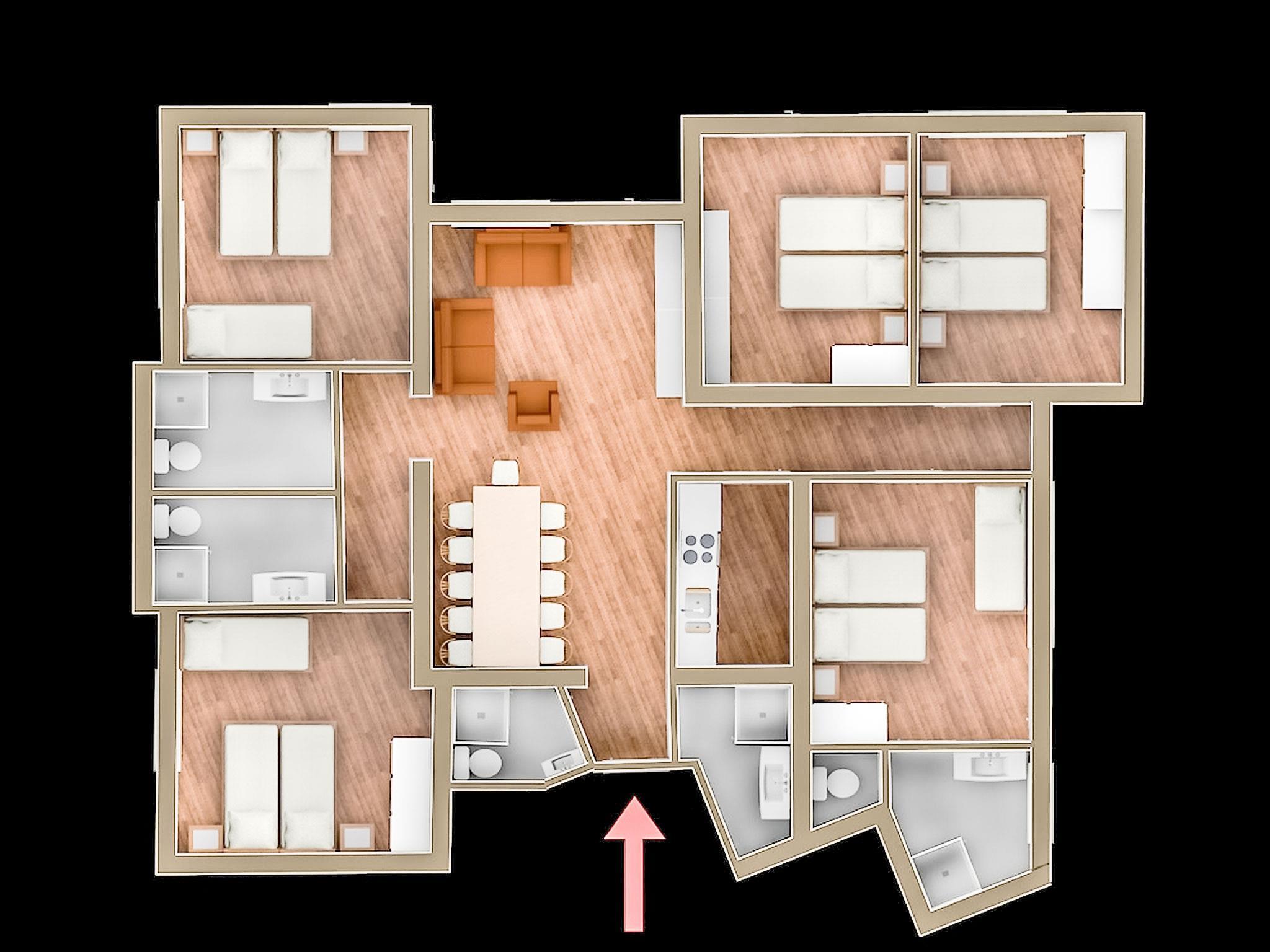 6-room apartment 136 m2, on the upper ground floor. Spacious, tasteful furnishings: 3 double bedrooms, each room with cable TV (flat screen). 2 rooms, each room with 1 bed, 1 double bed and cable TV (flat screen). Living/dining room with satellite TV (flat screen). Open kitchen (oven, dishwasher, 4 ceramic glass hob hotplates, microwave, electric coffee machine). 4 showers/WC, sep. WC, double hand-basin. Comfortable furnishings in the country house style. 2 balconies, large terrace 25 m2. Marvellous panoramic view of the ski run and the resort. Facilities: telephone, safe, hair dryer. Internet (WiFi, free). Parking (4 cars). Please note: non-smokers only. Smoke alarm. All beds are box spring beds and can optionally be configured as double or single beds. When there are less than the maximum number of guests staying at the property, not all of the housing units will be available for use.