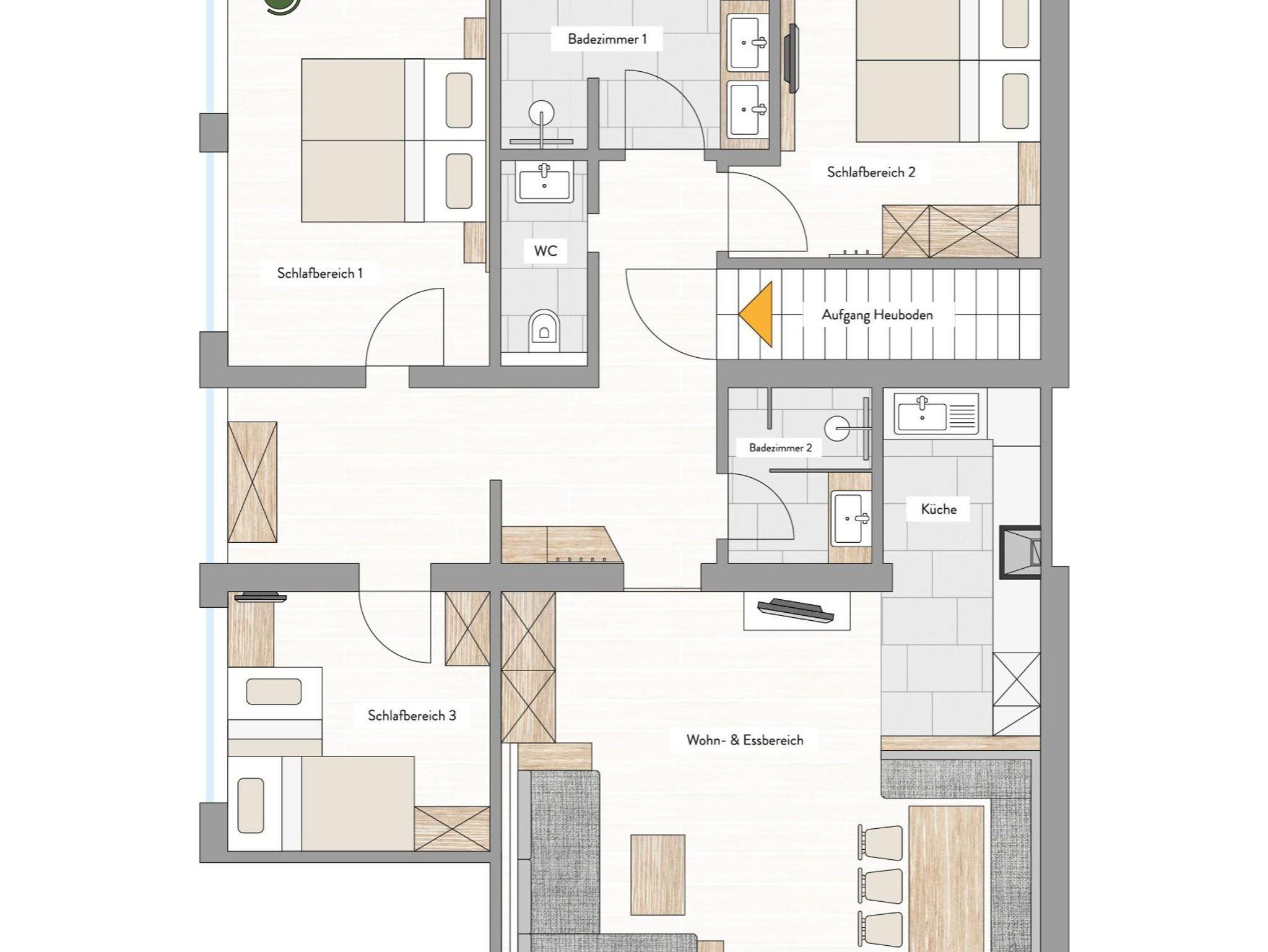 Unser komfortables und großzügiges ausgestattetes Appartement (ca. 97m² für 5-8 Pers.) verfügt über 3 Schlafzimmer + 1 Wohnschlafraum mit Schlafcouch, vollausgestattete Küche, 2 Bäder mit Dusche (1x mit WC), plus zusätzliches separates WC, 4x Kabel-TV, W-LAN, Telefon, Vorraum und 2 Balkone.