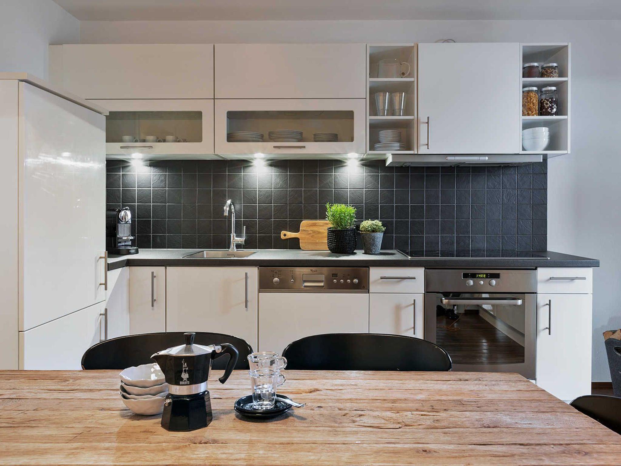 • Voll ausgestattete Küche mit Esstisch, Geschirrspüler, Geschirrtücher, E-Herd und Backrohr, Toaster, Wasserkocher, Nespresso-Kaffeemaschine (inkl. einer Packung Nespresso-Kapseln), Filterkaffeemaschine