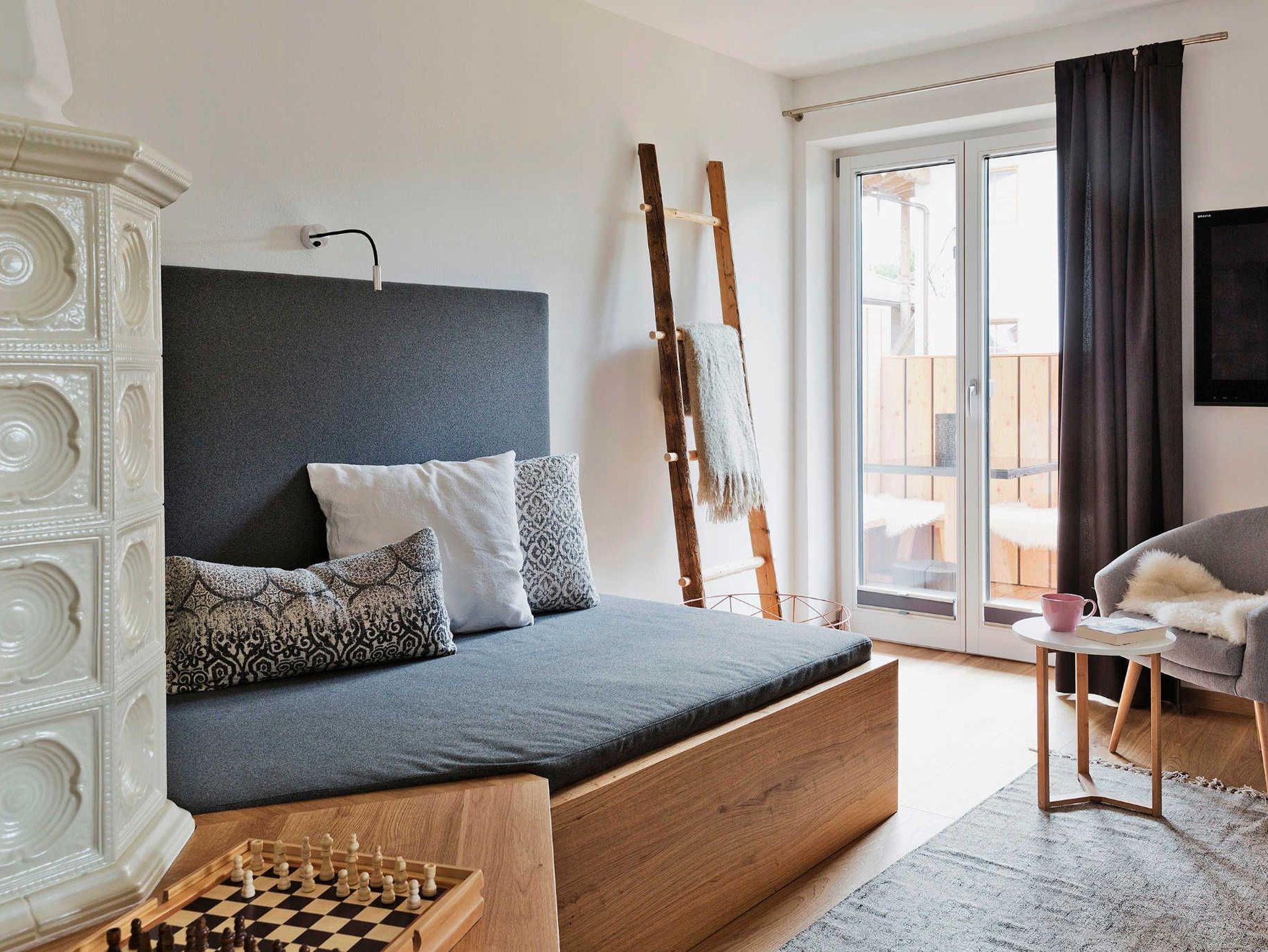• Ein gemütliches Wohnzimmer mit Kachelofen und kuscheligem Diwan