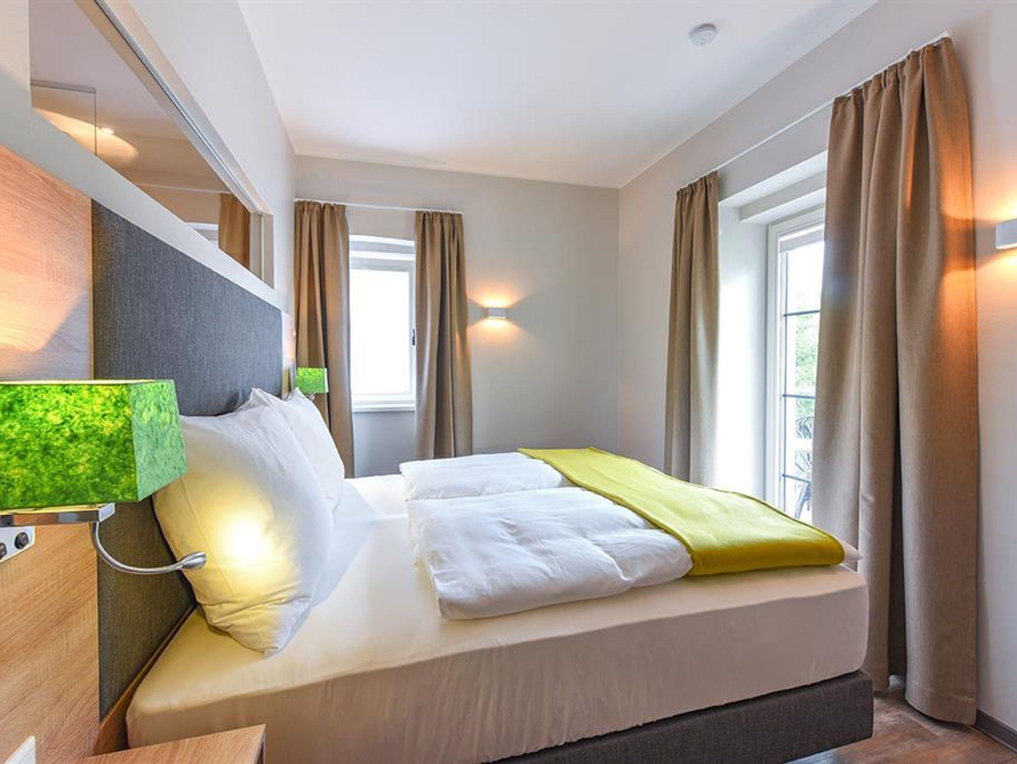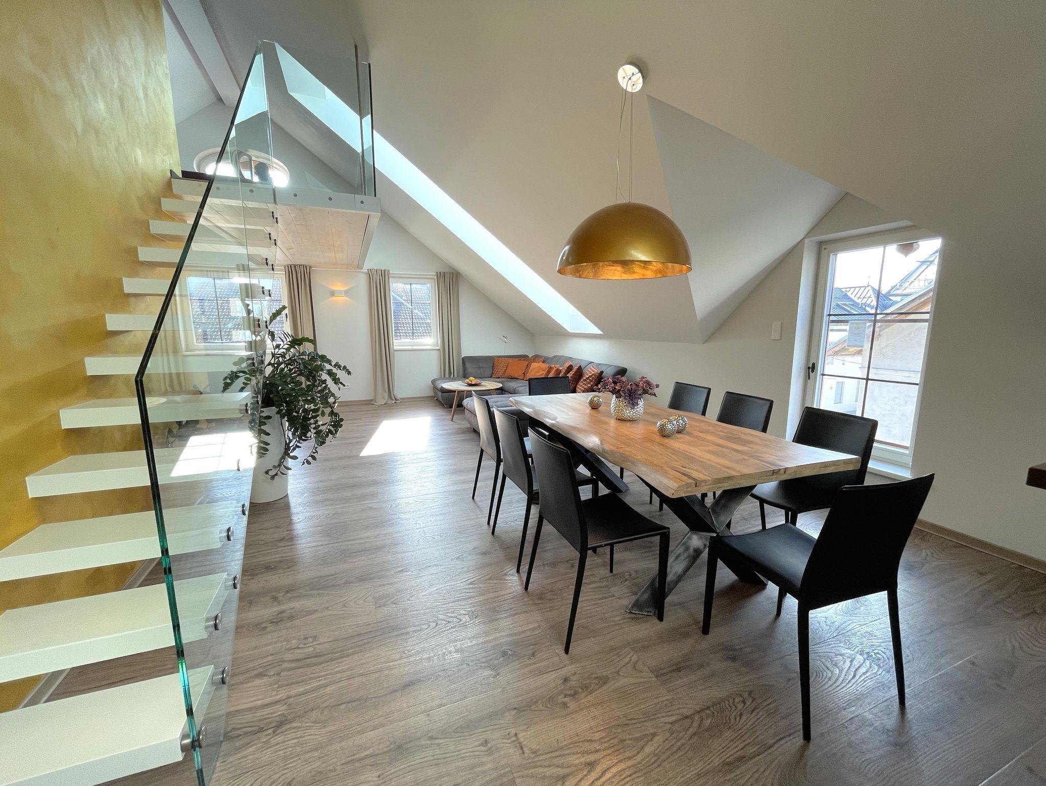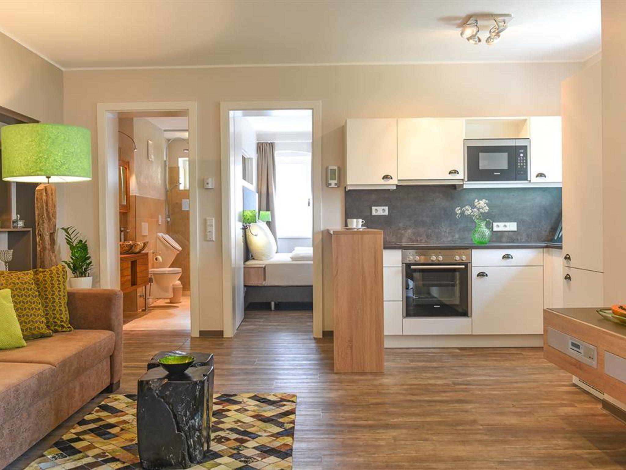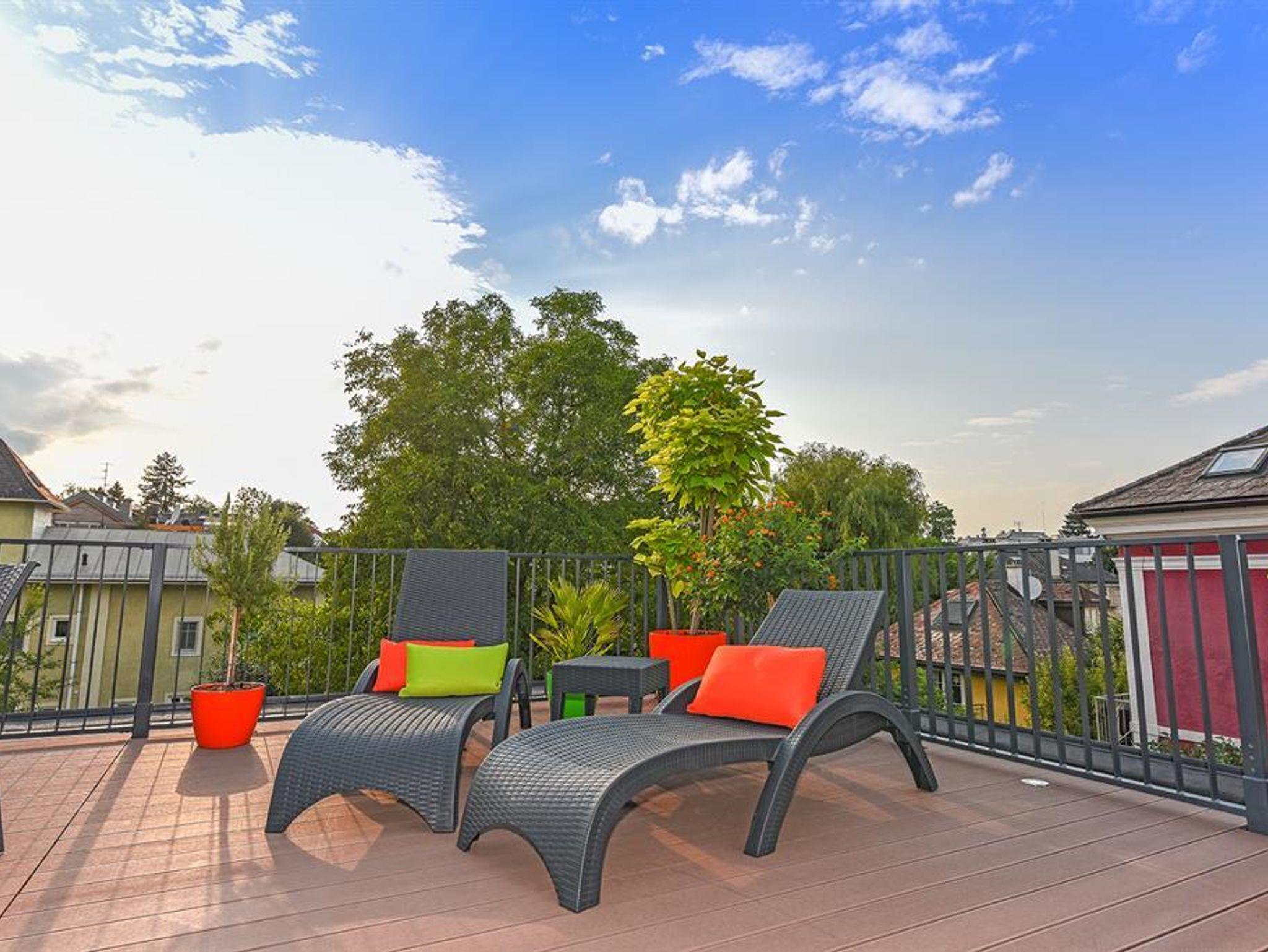 Ferienwohnung Mirabell Auf ca. 50 m² bietet die Ferienwohnung Mirabell ein ganz besonders elegantes Wohnerlebnis. Die Wohnung befindet sich im neu renovierten Altbau der Villa und ist mit edlen Möbeln und exklusiven Materialien eingerichtet. In der Ferienwohnung finden Sie eine geräumige und gemütliche Wohnküche, sowie ein Schlafzimmer mit Doppelbett und ein Badezimmer mit Dusche, WC und Pissoir. Für eine zusätzliche Person kann die hochwertige, ausziehbare Hotelcouch im Wohnzimmer zu einem Zusatzbett umgebaut werden. Das hat die Ferienwohnung zu bieten ca. 50 m² für 2-4 Personen 1 Schlafzimmer mit Luxus-Boxspring-Doppelbetten gemütliche Wohnküche mit hochwertiger, ausziehbarer Hotelcouch für 2 Personen Entertainmentcenter mit HIFI-Anlage und DVD & Blu-ray Player UHD Flat TV im internationalen Sendern über Satellit (Astra) komplett ausgestattete Küche Badezimmer mit Dusche, WC mit Pissoir, Haarfön, zuschaltbare Infrarotheizung und Handtüchern Safe teilweise Gartenzugang oder Terrasse Benützung der allgemein zugänglichen, sonnigen 70 m² großen Dachterrasse mit Liegestühlen und Lounge-Möbeln kostenloses W-Lan kostenloser Parkplatz Die Küchenausstattung im Detail WMF Töpfe Berndorf Besteck Design Porzellan Nespresso Kaffeemaschine Melitta Toaster, Kaffeemaschine, Stabmixer und Wasserkocher Siemens Küchengeräte - wie beispielsweise Herd, Geschirrspüler, Mikrowelle, Hochkühlschrank mit Tiefkühlfach etc. Babystuhl und Flaschenwärmer