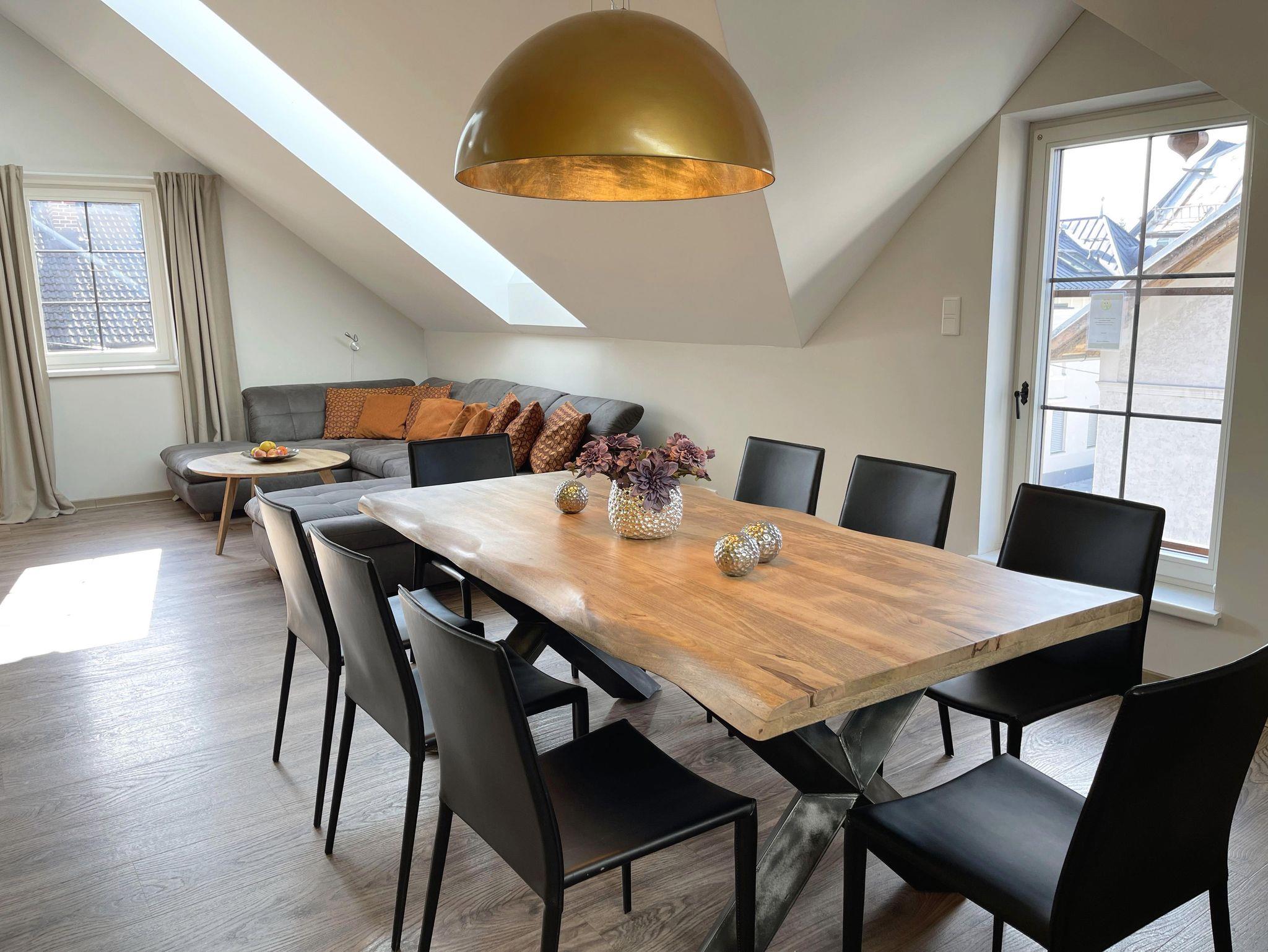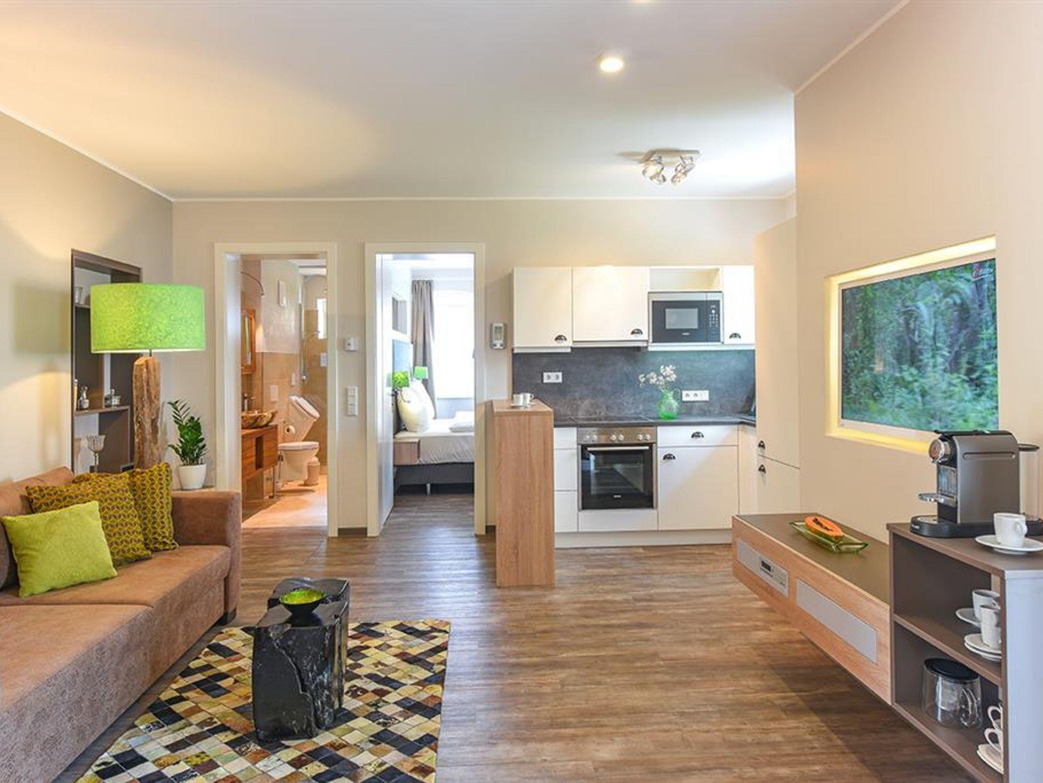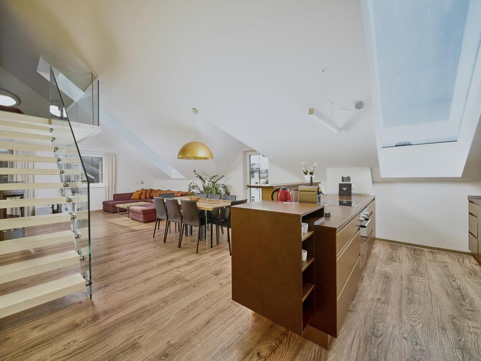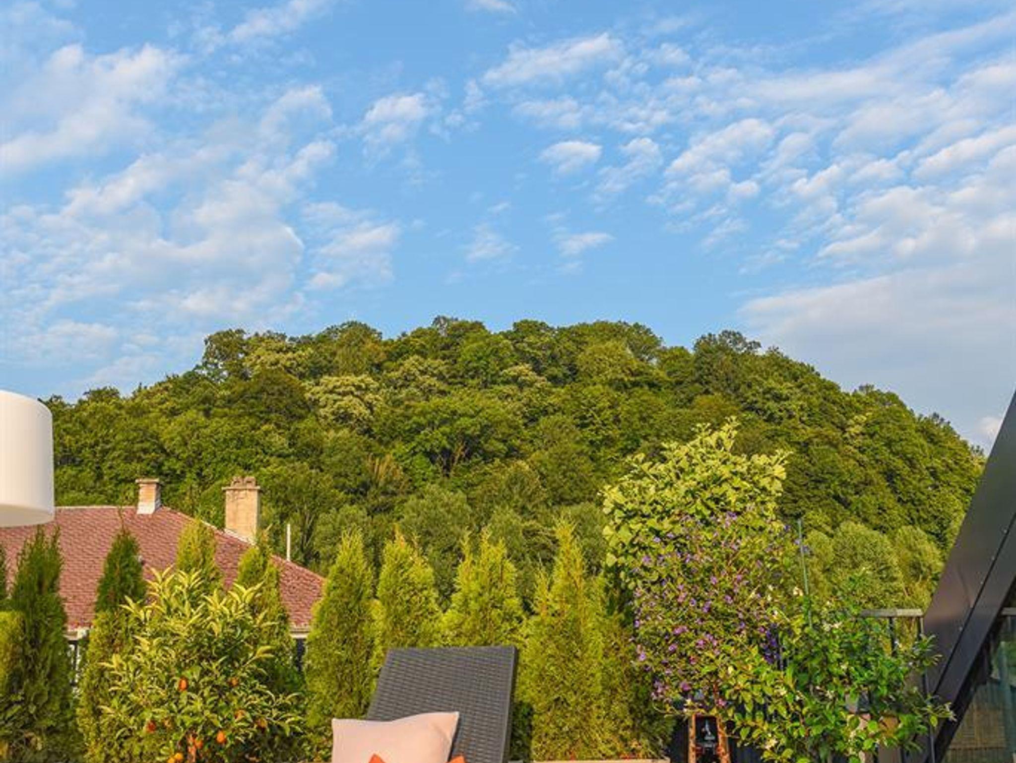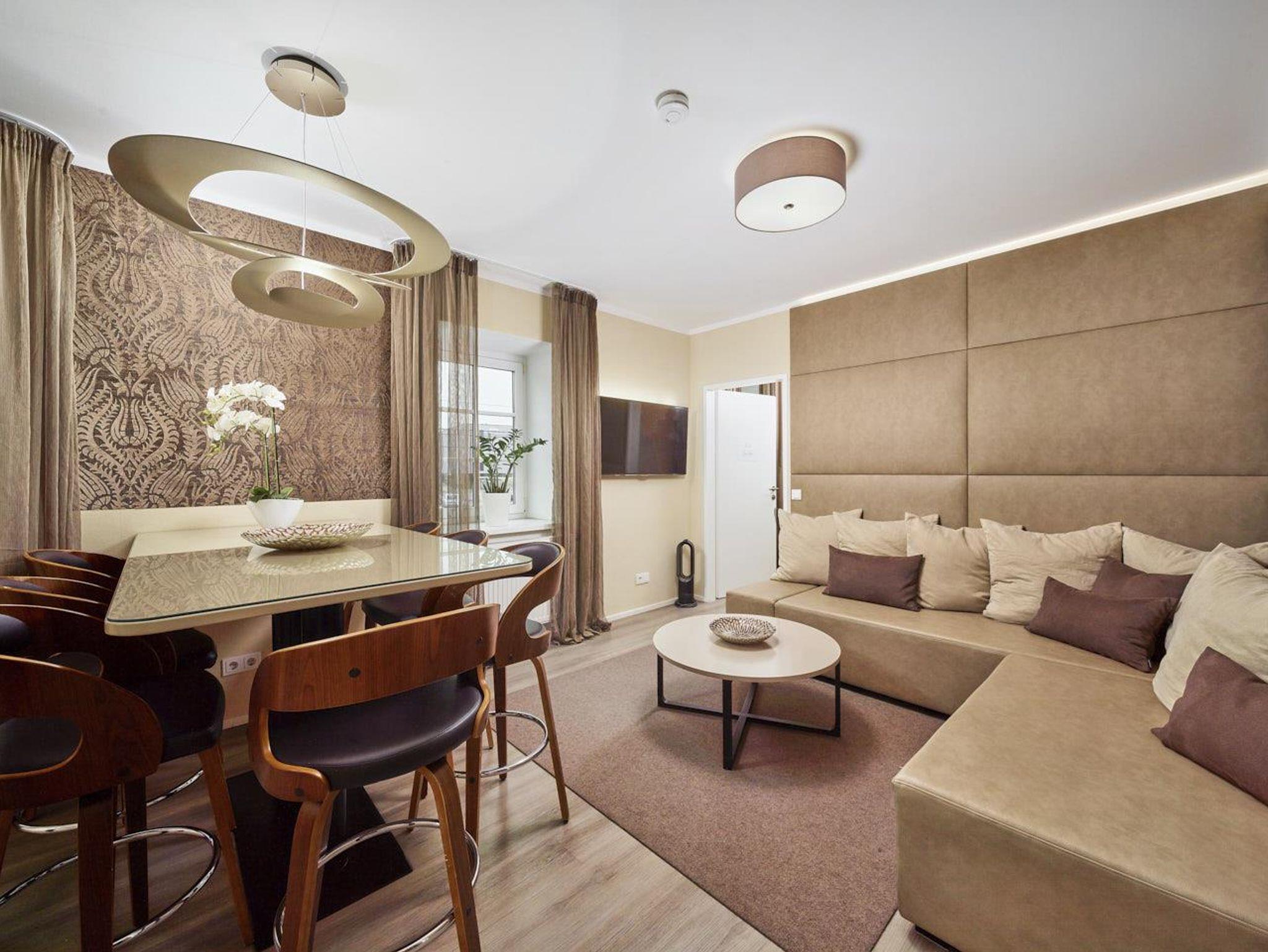 Ferienwohnung Mirabell Auf ca. 50 m² bietet die Ferienwohnung Mirabell ein ganz besonders elegantes Wohnerlebnis. Die Wohnung befindet sich im neu renovierten Altbau der Villa und ist mit edlen Möbeln und exklusiven Materialien eingerichtet. In der Ferienwohnung finden Sie eine geräumige und gemütliche Wohnküche, sowie ein Schlafzimmer mit Doppelbett und ein Badezimmer mit Dusche, WC und Pissoir. Für eine zusätzliche Person kann die hochwertige, ausziehbare Hotelcouch im Wohnzimmer zu einem Zusatzbett umgebaut werden. Das hat die Ferienwohnung zu bieten ca. 50 m² für 2-4 Personen 1 Schlafzimmer mit Luxus-Boxspring-Doppelbetten gemütliche Wohnküche mit hochwertiger, ausziehbarer Hotelcouch für 2 Personen Entertainmentcenter mit HIFI-Anlage und DVD & Blu-ray Player UHD Flat TV im internationalen Sendern über Satellit (Astra) komplett ausgestattete Küche Badezimmer mit Dusche, WC mit Pissoir, Haarfön, zuschaltbare Infrarotheizung und Handtüchern Safe teilweise Gartenzugang oder Terrasse Benützung der allgemein zugänglichen, sonnigen 70 m² großen Dachterrasse mit Liegestühlen und Lounge-Möbeln kostenloses W-Lan kostenloser Parkplatz Die Küchenausstattung im Detail WMF Töpfe Berndorf Besteck Design Porzellan Nespresso Kaffeemaschine Melitta Toaster, Kaffeemaschine, Stabmixer und Wasserkocher Siemens Küchengeräte - wie beispielsweise Herd, Geschirrspüler, Mikrowelle, Hochkühlschrank mit Tiefkühlfach etc. Babystuhl und Flaschenwärmer