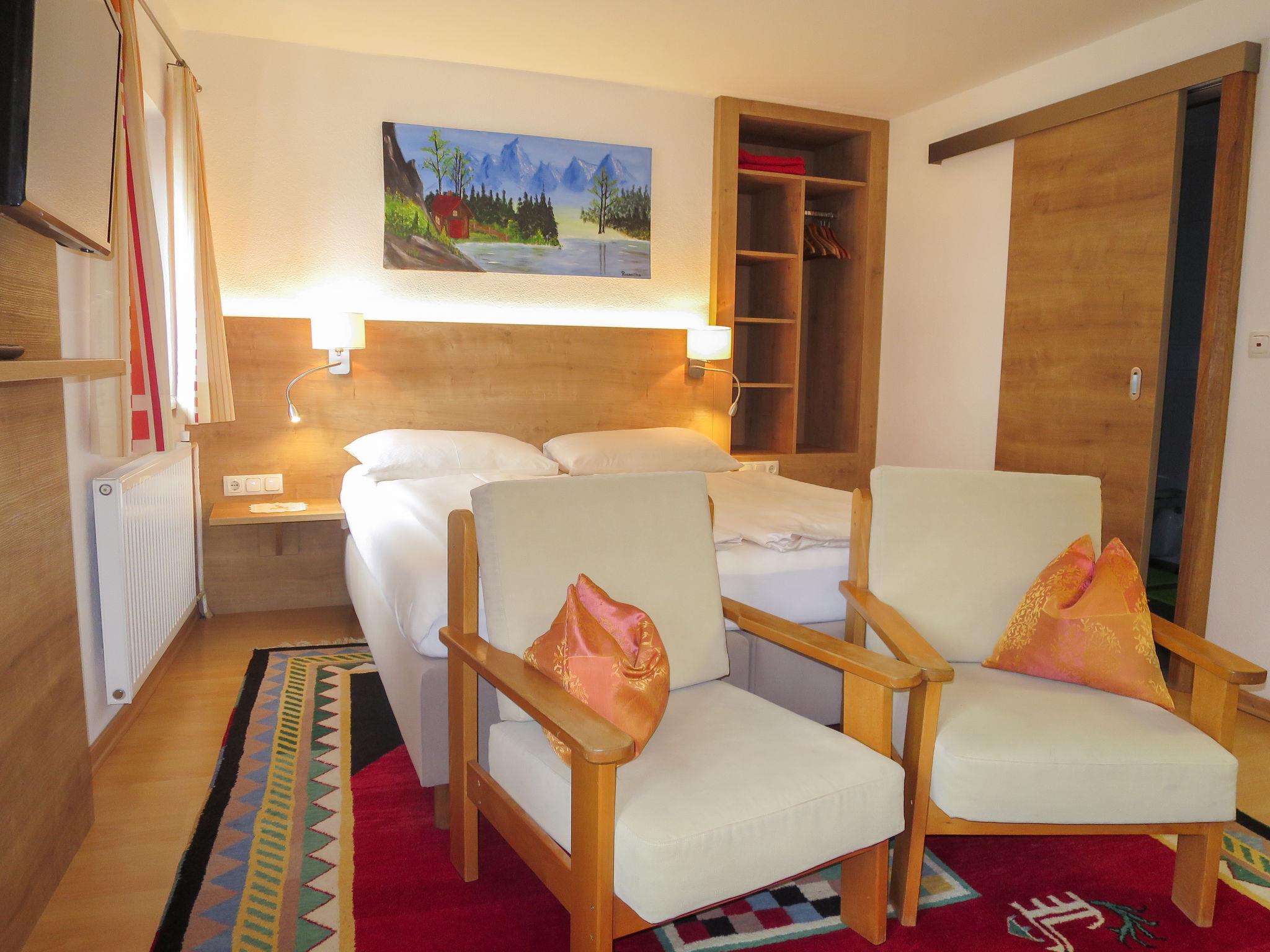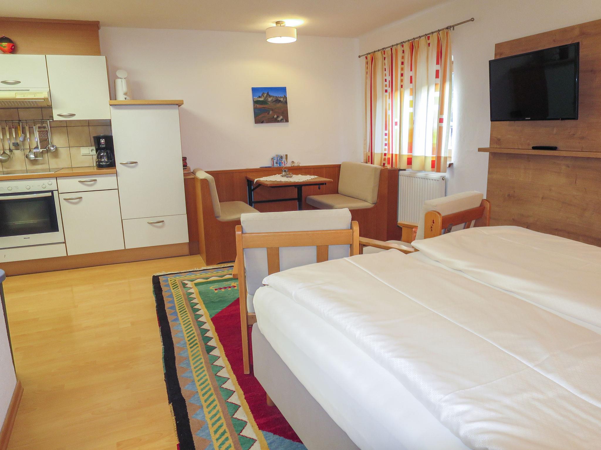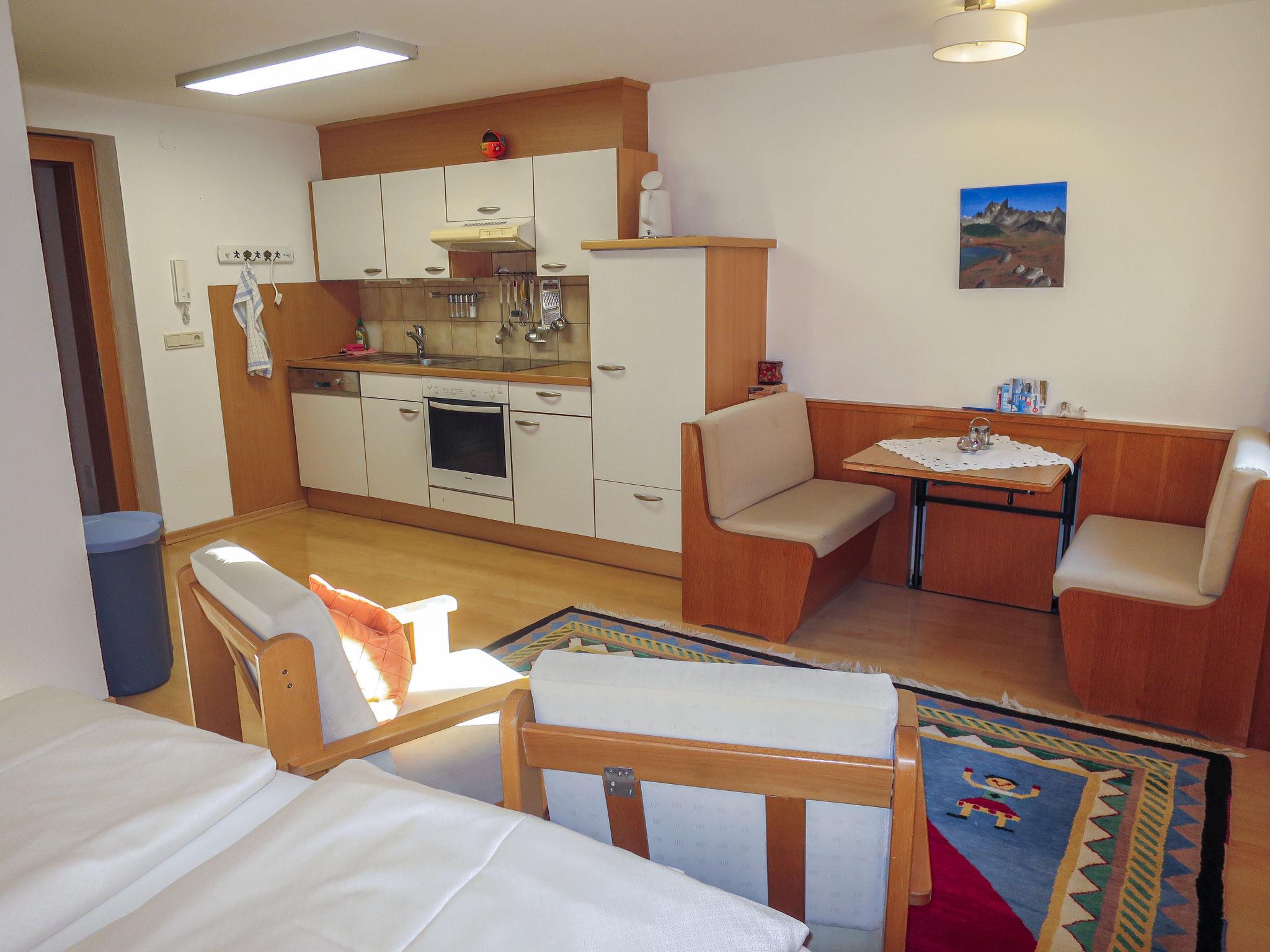 "Hof am Schönbach", 1-room apartment 30 m2 on 1st floor. Cosy furnishings: living/sleeping room with 1 double bed (160 cm), dining table, cable TV and radio. Open kitchen (oven, dishwasher, 4 ceramic glass hob hotplates, kettle, electric coffee machine). Shower/WC. Heating. Facilities: baby cot. Internet (WiFi, free). Please note: non-smokers only. Maximum 1 pet/ dog allowed. The flat has a separate entrance hall.