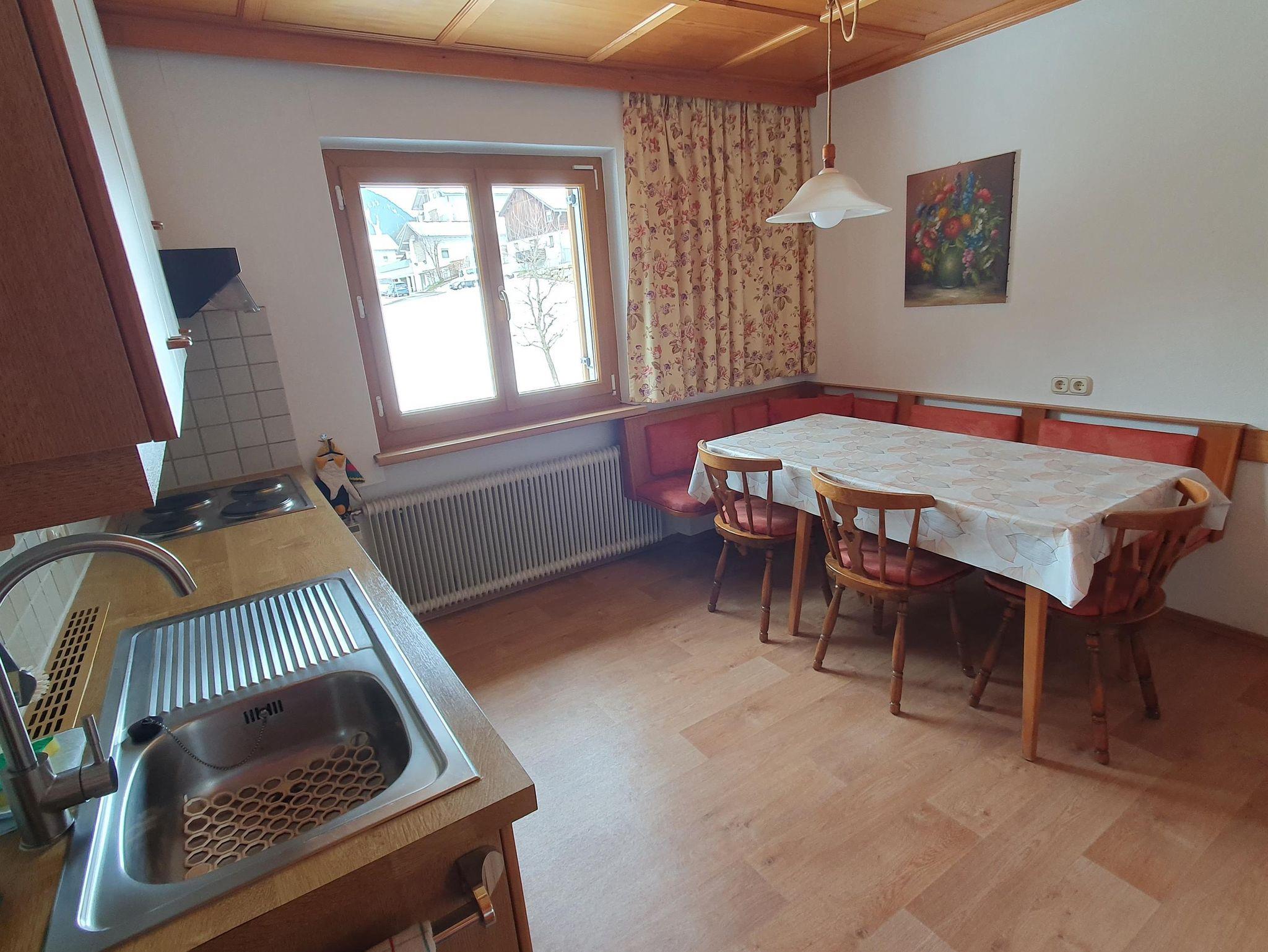 Gemütliche Ferienwohnung mit ca 75m² im 1 OG. Wohnküche mit folgender Ausstattug: Tisch mit Eckbank und separate Liege. 4-Platten-Herd mit Backrohr, Kaffeemaschine, Teekocher, Kühlschrank,