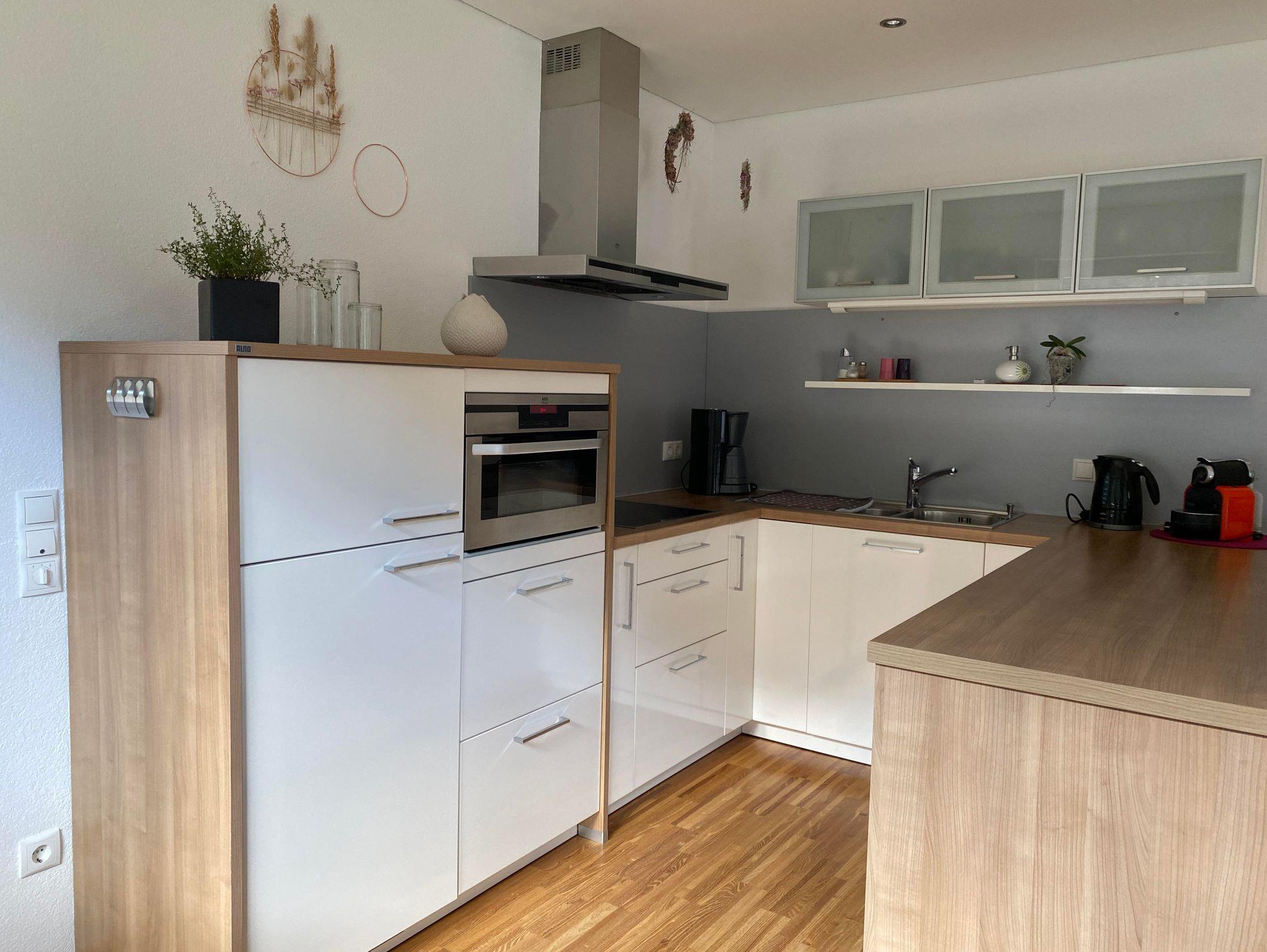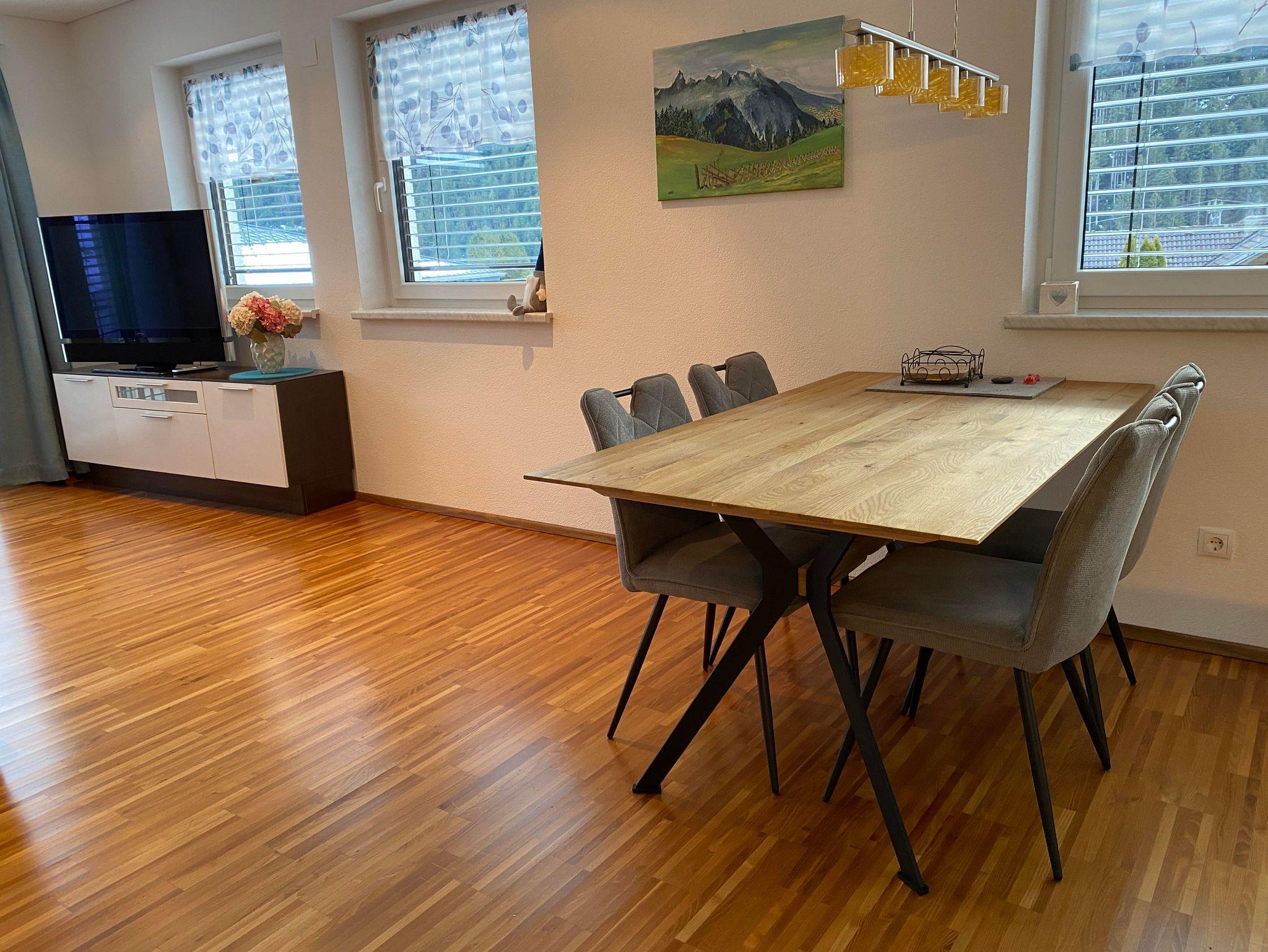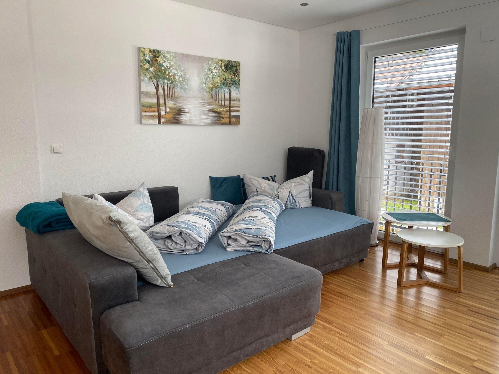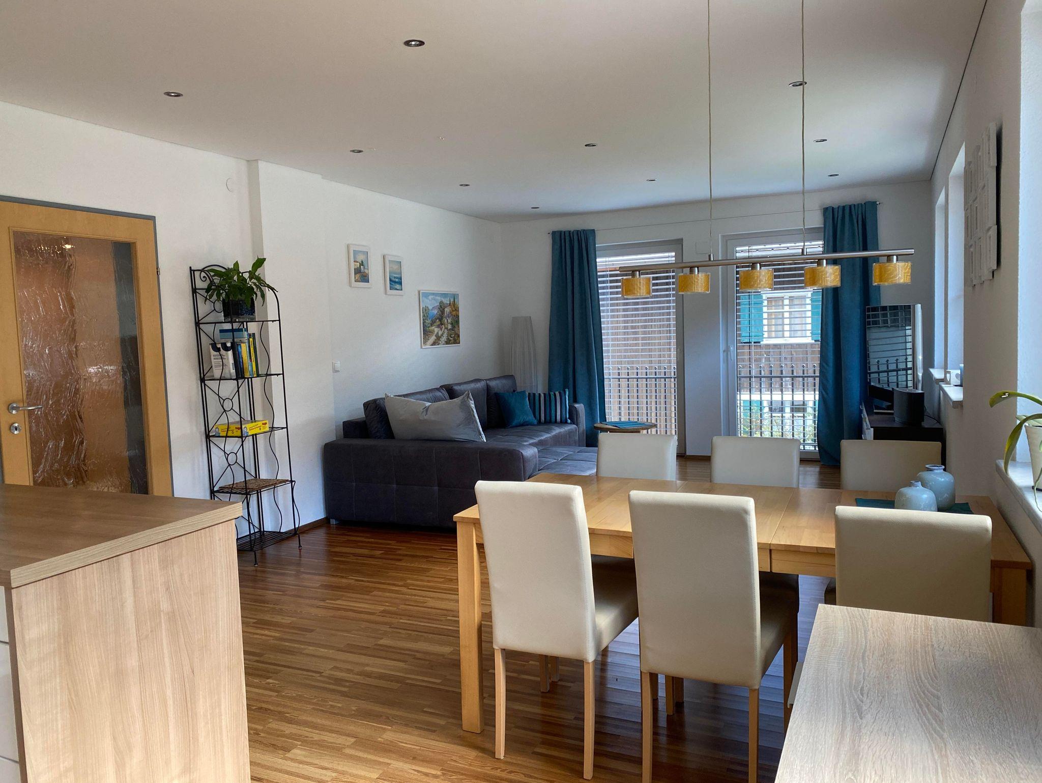 Sonnige Terrasse, 65m² Wohnfläche, ein Schlafzimmer, großes Ausziehsofa im Wohnraum, Dusche/WC, komplett ausgetattete Küche, Abstellraum (auch für Ski und Skischuhe)