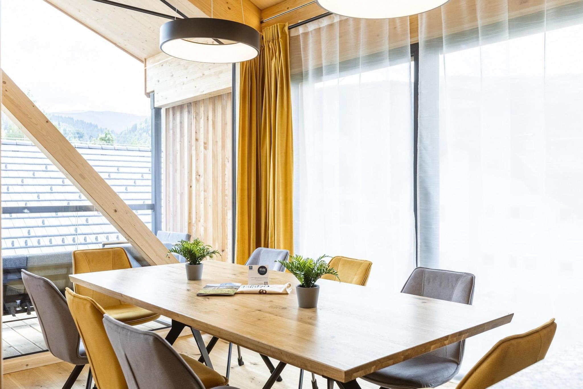 "Løft din alpine ferie i denne utsøkte toppleiligheten på 117 m², som tilbyr en eksepsjonell blanding av luksus og komfort for opptil 8 gjester. Denne stilige toppleiligheten har en perfekt beliggenhet bare noen få meter fra Kreischberg-gondolheisen, og lover et uforglemmelig opphold med fantastisk utsikt og førsteklasses fasiliteter. Toppleiligheten har fire vakkert møblerte soverom, hvert utstyrt med en myk dobbeltseng med springmadrass, som sikrer avslappende netter for alle gjester. To moderne bad med forfriskende regndusj og et separat gjestetoalett gir god komfort og privatliv. Slapp av i den romslige stuen, som inkluderer en koselig sittegruppe og en flatskjerm-TV, ideelt for avslapning etter en dag med eventyr. Herfra har du tilgang til balkongen for å nyte en fantastisk utsikt over Kreischberg, noe som forbedrer din avslapningsopplevelse. Det moderne kjøkkenet er en kokkes fryd, fullt utstyrt med bestikk av høy kvalitet, kokekar, keramisk koketopp, stekeovn, mikrobølgeovn, kjøleskap med fryseboks og oppvaskmaskin. Ytterligere fasiliteter inkluderer vannkoker, brødrister og en Nespresso-kaffemaskin. Et lite startsett med oppvaskmaskintablett, oppvaskmiddel, svamp, søppelsekker, rengjøringsmidler, og et kjøkkenhåndkle sørger for en smidig start på oppholdet ditt. Høydepunktet i toppleiligheten er det luksuriøse private spa-området, med en finsk badstue og et innbydende utendørs badekar. Disse fasilitetene gir den perfekte muligheten for velvære og avslapning, noe som gjør oppholdet ditt virkelig spesielt. Gratis Wi-Fi er tilgjengelig i hele toppleiligheten, og MurauCard (sommer) gir ytterligere lokale fordeler og aktiviteter.