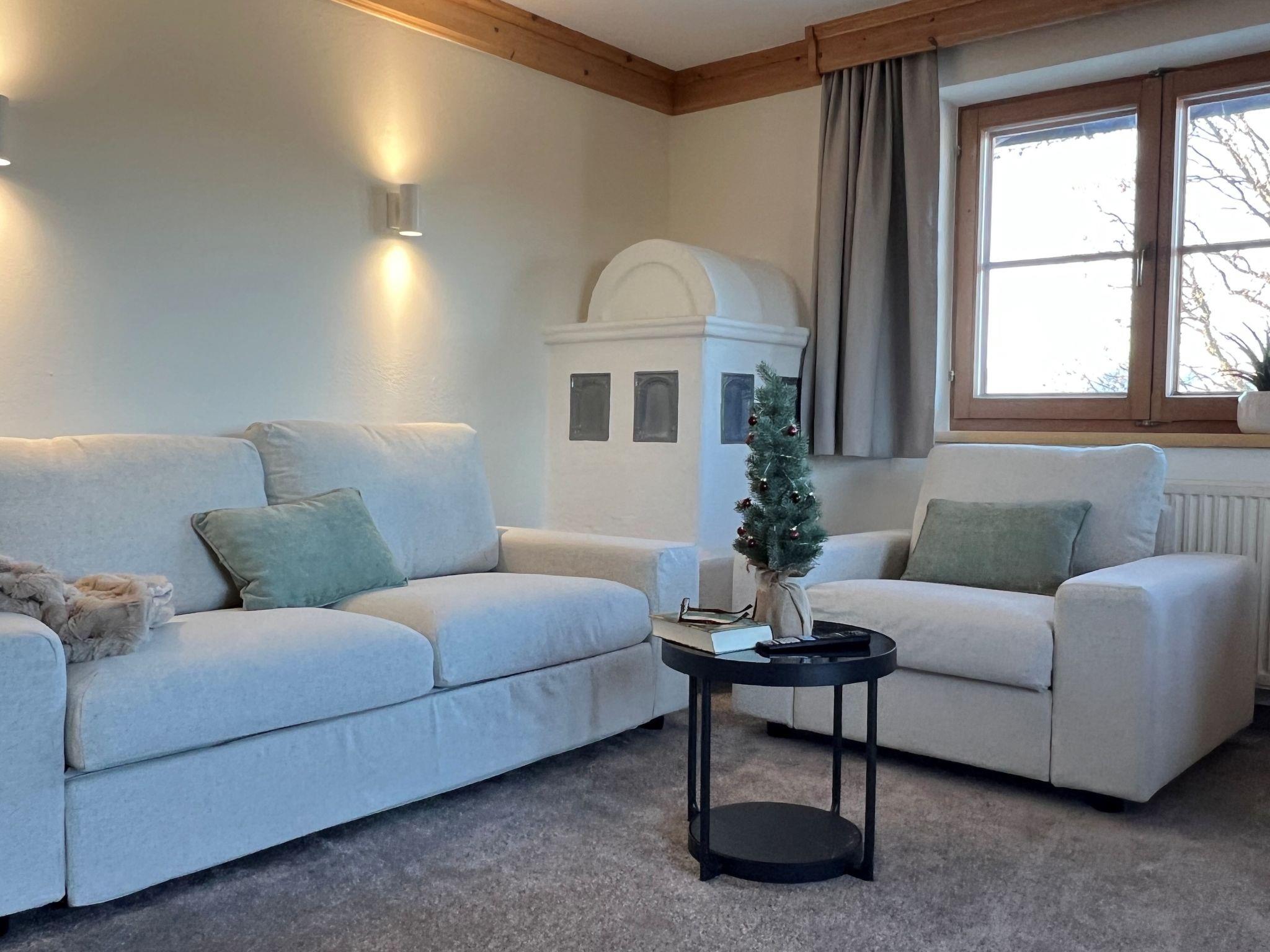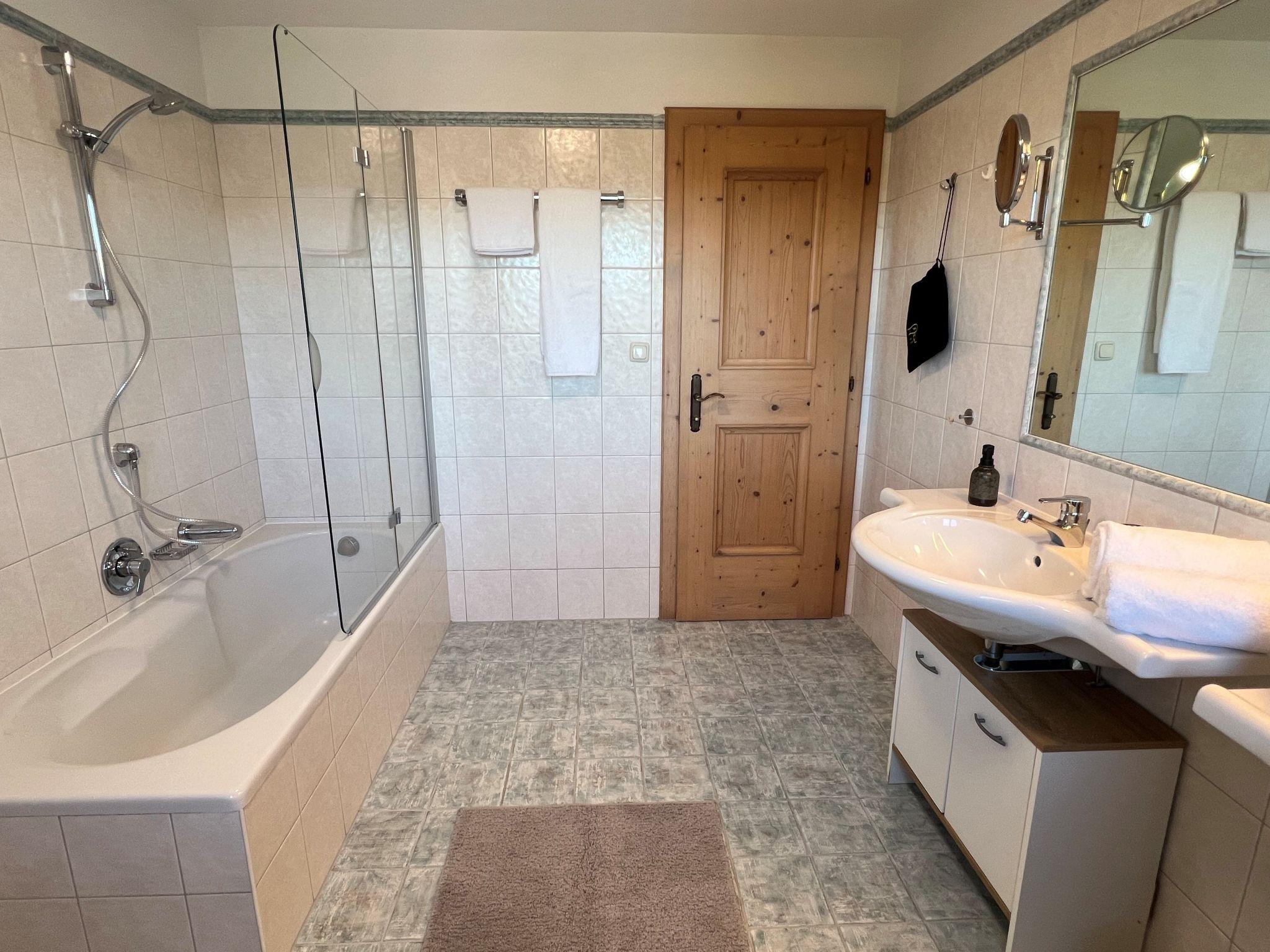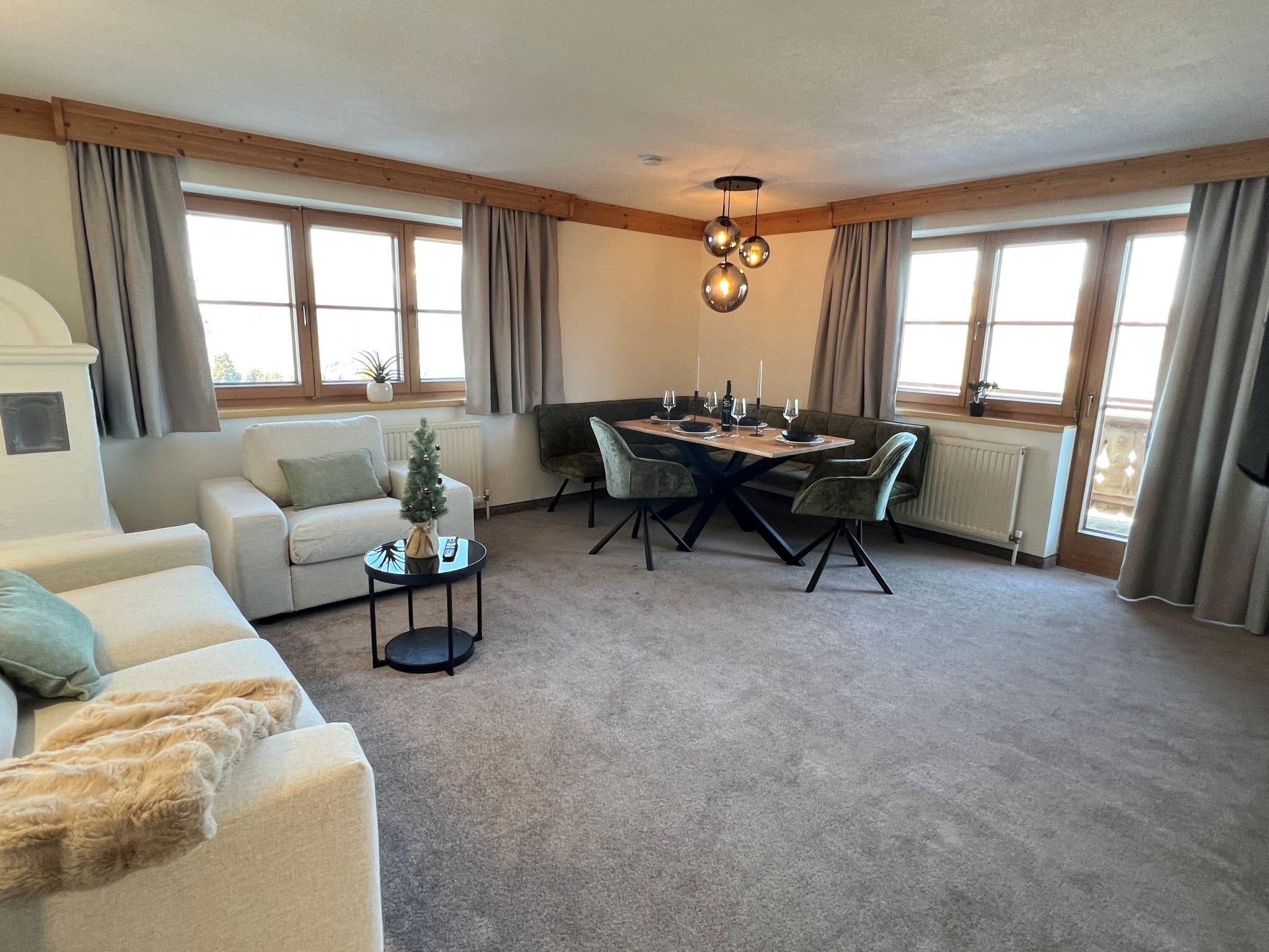 "Wilder Kaiser", 3-room apartment 76 m2 on 1st floor. Cosy furnishings: 1 room with 1 double bed (180 cm, length 200 cm). Exit to the balcony. 1 children's room with 2 pull-out beds (2 x 80 cm, length 200 cm). Exit to the balcony. Living room with 1 double sofabed (140 cm, length 200 cm), TV and flat screen. Exit to the balcony. Open kitchen (oven, 4 ceramic glass hob hotplates, toaster, kettle, electric coffee machine) with dining table. Sep. WC, bath or shower/WC, double hand-basin. Balcony. Balcony furniture. Very beautiful panoramic view of the mountains. Facilities: Internet (WiFi, free). Please note: non-smokers only. Maximum 1 pet/ dog allowed. Smoke alarm.