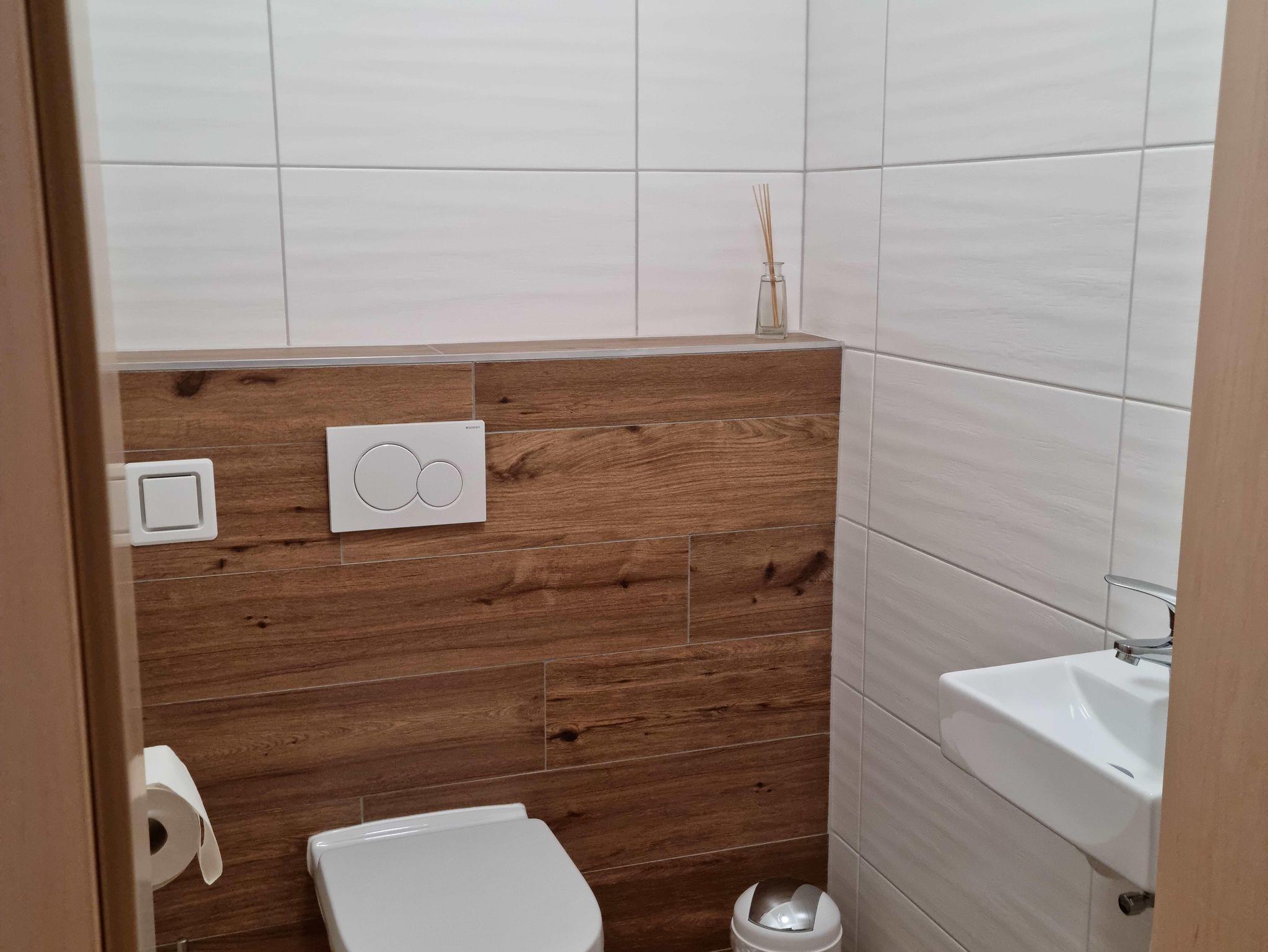 Das neu errichtete Appartement verfügt über eine Wohnküche, zwei große Schlafzimmer, eine Wohnküche, ein Badezimmer mit Badewanne und einer geräumigen ebenerdigen Dusche und einem Waschbecken mit Spiegelschrank. Das WC ist getrennt. Bei einem Schlafzimmer gibt es einen Balkon mit Sitzgelegenheit. Von der Wohnküche gelangen Sie auf einen schönen großen Balkon mit Sitzgelegenheit. Hier können Sie die Nachmittagssonne mit Blick in den Garten bis zum Sonnenuntergang genießen.