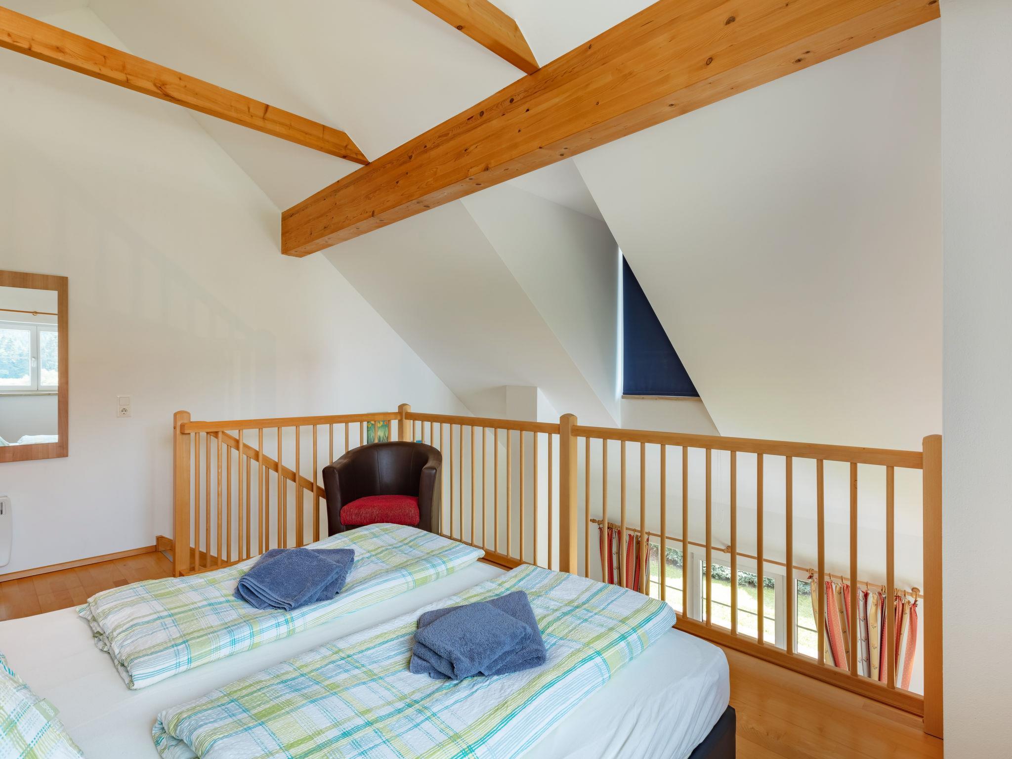 "Top 6", 3-room maisonette 65 m2 on 2 levels, on the upper floor. Partly with sloping ceilings, comfortable and cosy furnishings: entrance hall. Living/sleeping room with 1 double sofabed (160 cm), Scandinavian wood stove, dining table, satellite TV, flat screen and DVD. Exit to the balcony. 1 double bedroom with shower. Open kitchen (oven, dishwasher, 4 ceramic glass hob hotplates, electric coffee machine). Sep. WC. Top floor: gallery with 1 double bed and bath/WC. Parquet floors. Balcony. Balcony furniture. Beautiful panoramic view of the ski run and the countryside. Facilities: washing machine, dryer. Internet (WiFi, free). Garage space n 6 (1 car). Please note: non-smokers only. In the sleeping gallery is also a cupboard. Instead of an enclosed bedroom, some sleeping areas are located in an open-plan area (gallery, alcove, etc.). 50508-002506-2020