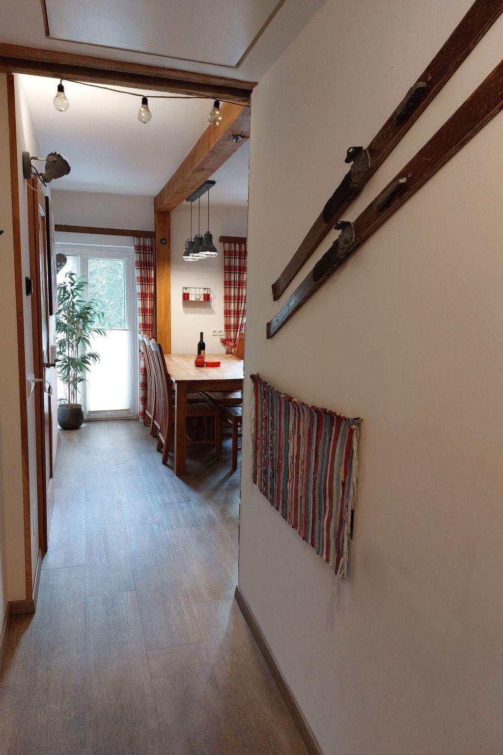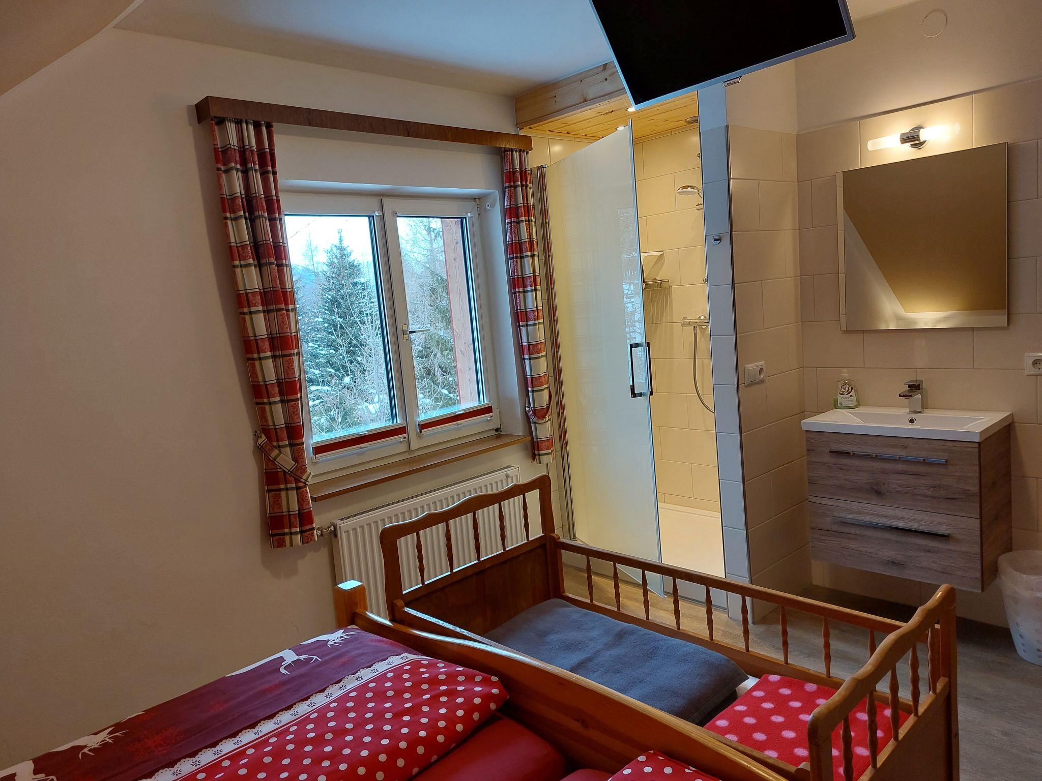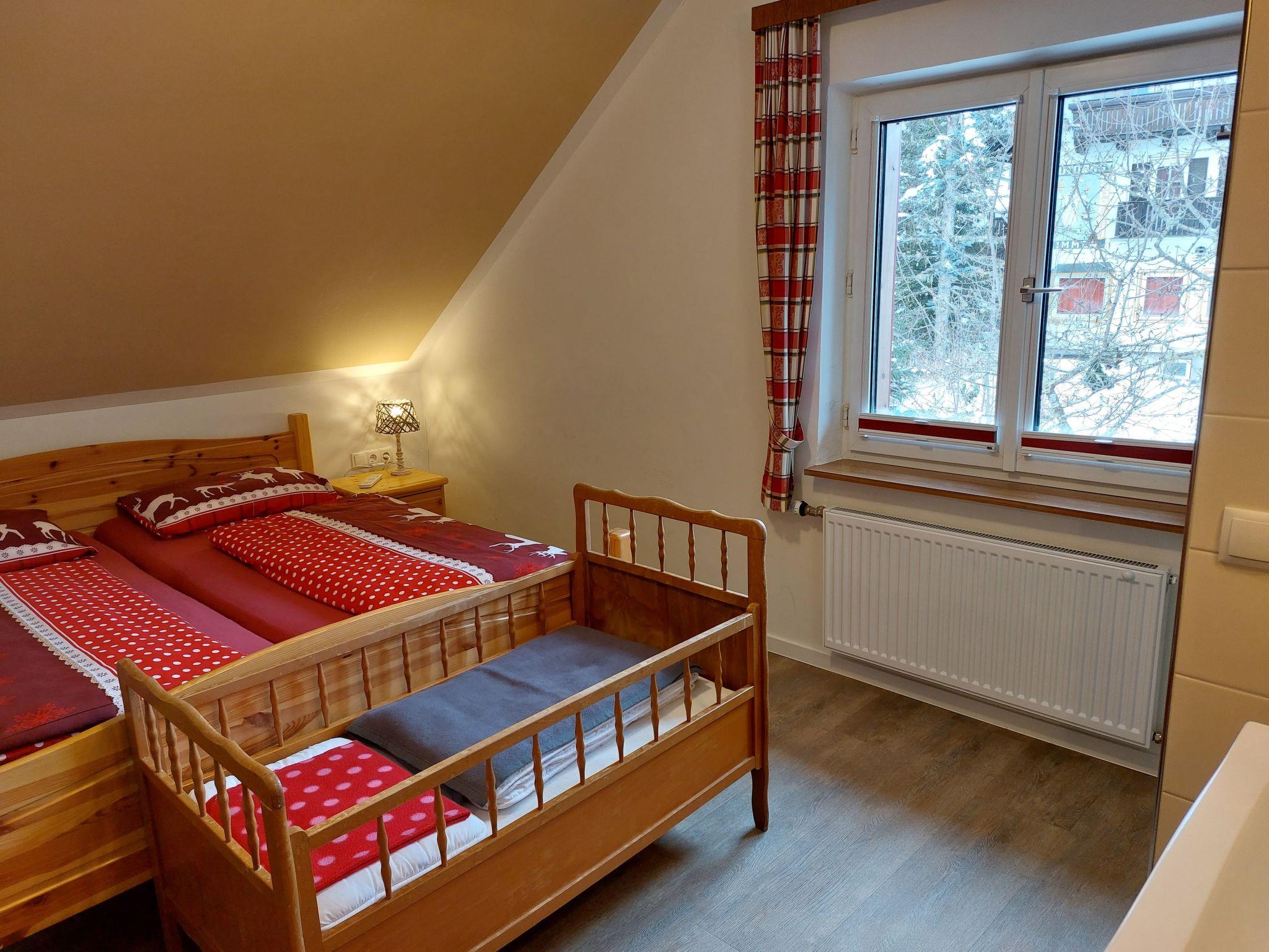 The holiday flat on the top floor is equipped with everything you need for a relaxing stay: a living room with satellite TV and balcony, a fully equipped kitchen with microwave, dishwasher, kettle and a Senseo coffee machine. There is also a double room with bunk beds, two further double rooms with satellite TV, two bathrooms (shower/WC) and an anteroom. Underfloor heating and a ski and ski boot drying facility in the house provide additional comfort.