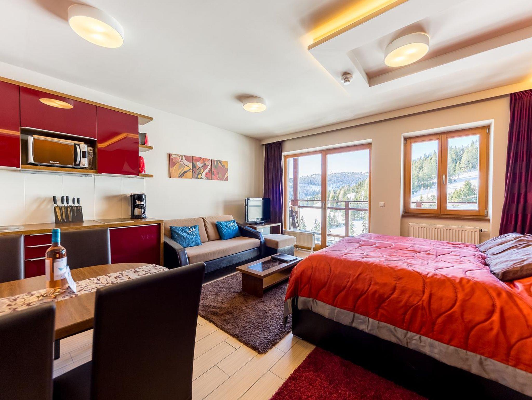 Direkt im Skigebiet In den drei Häusern vom 4+ Sterne Sissi Park erwarten Sie 22 einladende, exklusiv eingerichtete Appartements und zusätzlich 2 Zweibettzimmer und 1 Dreibettzimmer. Sie können das wundervolle Panorama der malerischen Gebirgslandschaft von Ihrer eigenen, südlich liegenden Terrasse genießen. Fast alle unserer Appartements haben eine Sauna im Badezimmer. Jedes Appartement ist mit einem für Internetbenutzung geeigneten LCD TV Gerät ausgestattet. Wifi ist in allen Räumen kostenlos verfügbar. Genießen Sie die gesunde, Pollenfreie Alpenluft, auf einer Höhe von 1650 M. Verpflegung: Frühstück, Abendessen und á la carte kann in unserem Restaurant in Anspruch genommen werden. Die Frühstücksbrötchen werden im Hause frisch gebacken. Rezeption: Bei Fragen wenden Sie sich bitte an unsere Rezeption. Sie können Deutsch, Englisch, oder Ungarisch informiert werden. Internet/TV: Jedes Appartement ist mit einem TV (Deutsch, Englisch und Ungarische Kanäle) ausgestattet. Kostenloses W-LAN im jeden Appartement! Baby Zubehör: Kinderbett und Bettwäsche, Wanne, Hochstuhl, Wickeltisch. Bitte sagen Sie uns noch vor Ankuft Bescheid falls Sie etwas von diesen Sachen benötigen! Parken: Kostenloses Parken vor den Appartements. Alle Appartements sind Nichtraucher-Appartements, Haustiere sind nicht erlaubt.