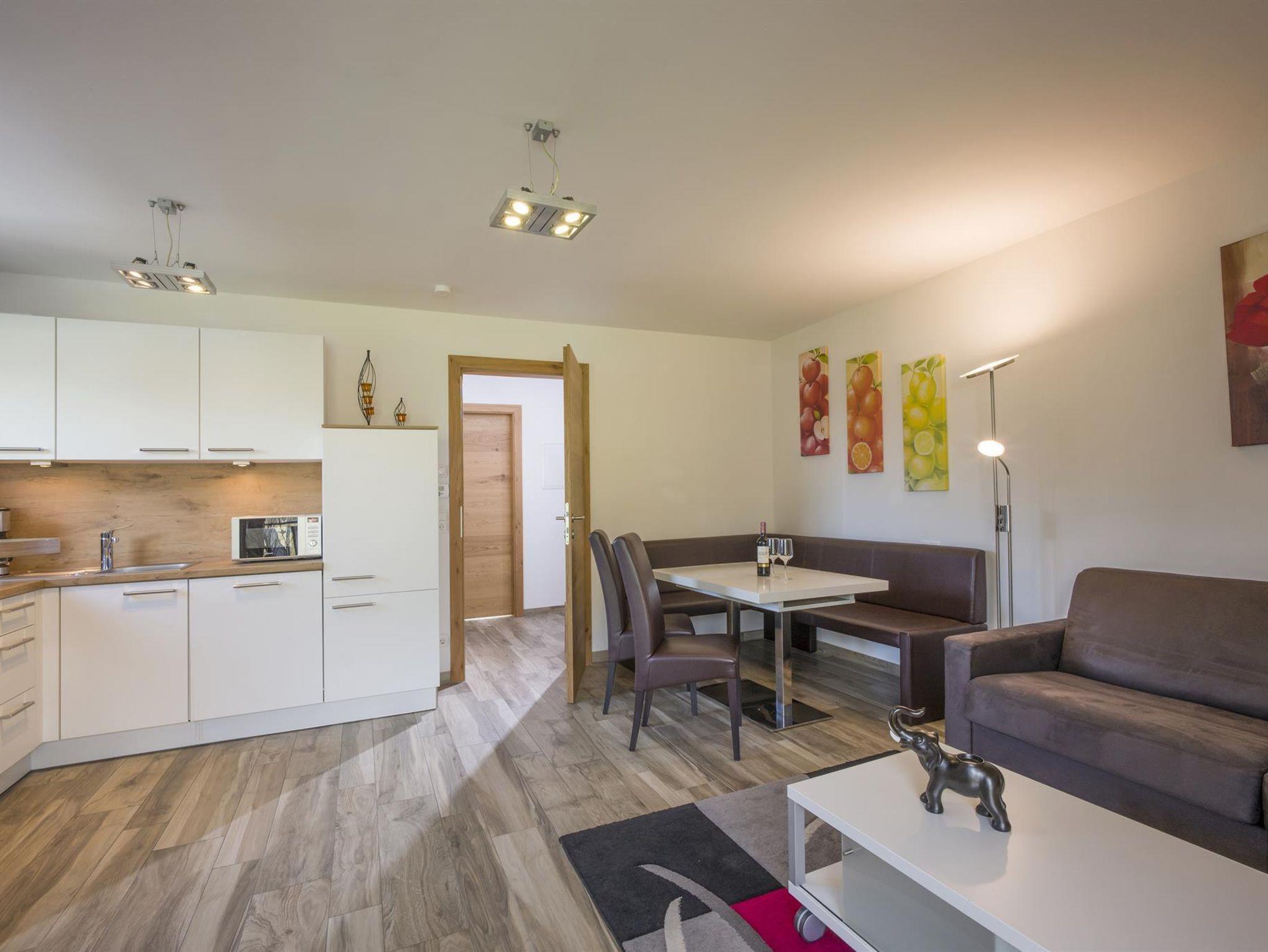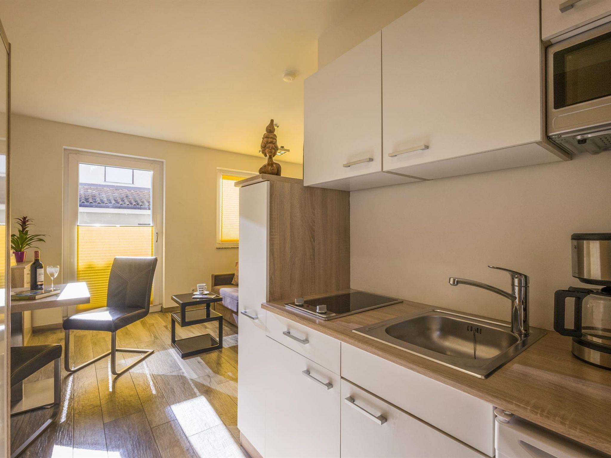 Die Ferienwohnungen sind modern eingerichtet mit Fliesenböden im Holzdekor, Fußbodenheizung und komfortabler Wohnraumlüftung. Die Einrichtung ist hochwertig und aufeinander abgestimmt. Alle Einheiten verfügen über voll ausgestattete Küchen mit Essgeschirr und Küchenutensilien.
