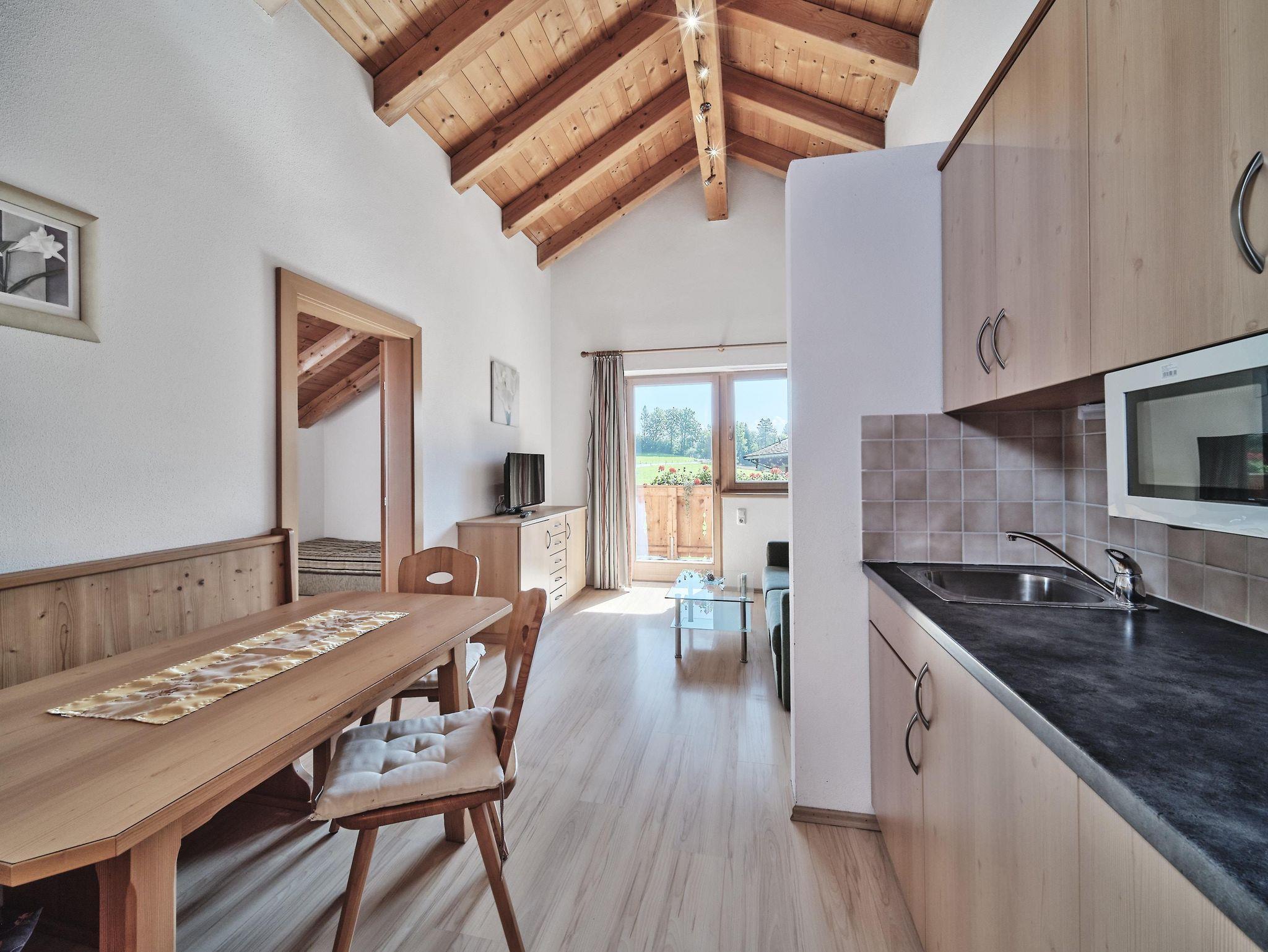 Studio mit Doppelbett, 1 Einzelbett und 1 Doppelcouch ca. 49 m², Bettwäsche, Sitzgruppe und Wohnlandschaft, Küchenzeile, Bettdecken & Polster für Allergiker, Flat-SAT-TV mit Radio, W-LAN, Laminatboden, Dusche/WC, Handtücher, Handtuchtrockner, Haartrockner, Toilettenartikel, Kosmetikspiegel, Bodenheizung, Safe. Für 2-5 Gäste geeignet. Bergpanorama Wilder Kaiser, Ostseite mit Terrasse.