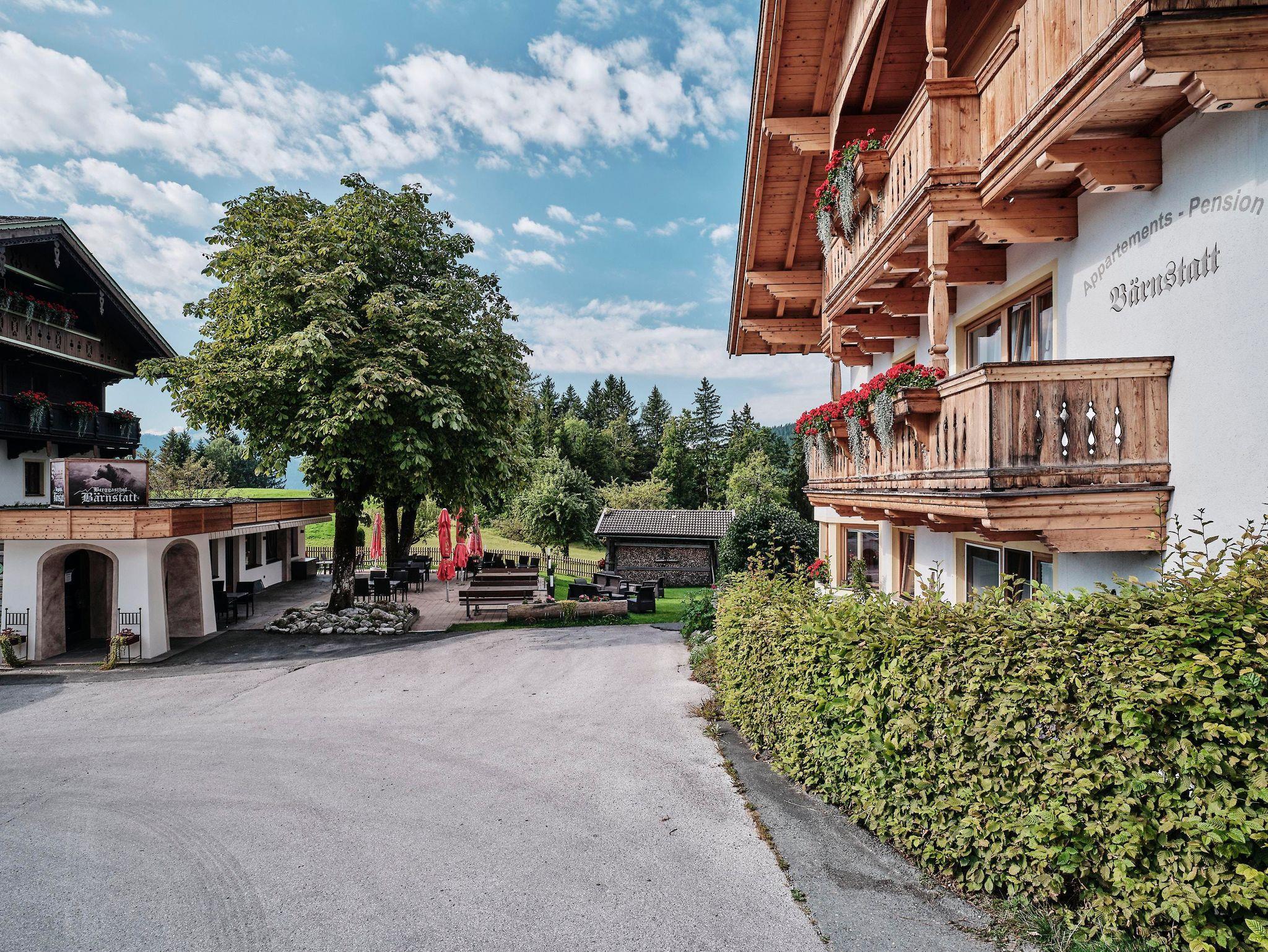 Studio mit Doppelbett, 1 Einzelbett und 1 Doppelcouch ca. 54 m², Bettwäsche, Sitzgruppe und Wohnlandschaft, Küchenzeile, Bettdecken & Polster für Allergiker, Flat-SAT-TV mit Radio, W-LAN, Laminatboden, Dusche/WC, Handtücher, Handtuchtrockner, Haartrockner, Toilettenartikel, Kosmetikspiegel, Bodenheizung, Safe. Für 2-5 Gäste geeignet. Bergpanorama Wilder Kaiser, Südseite mit Terrasse.