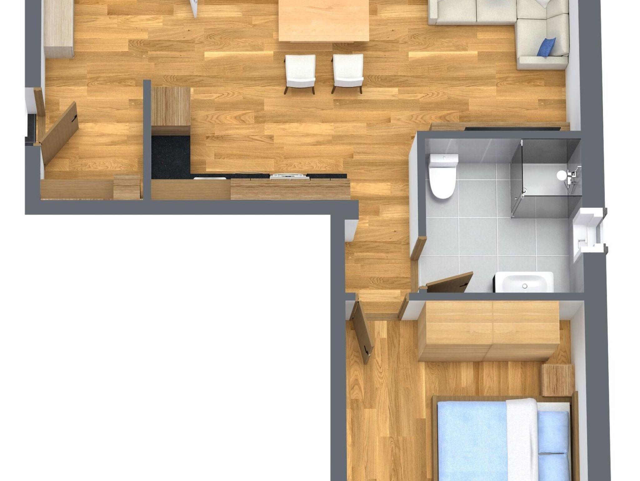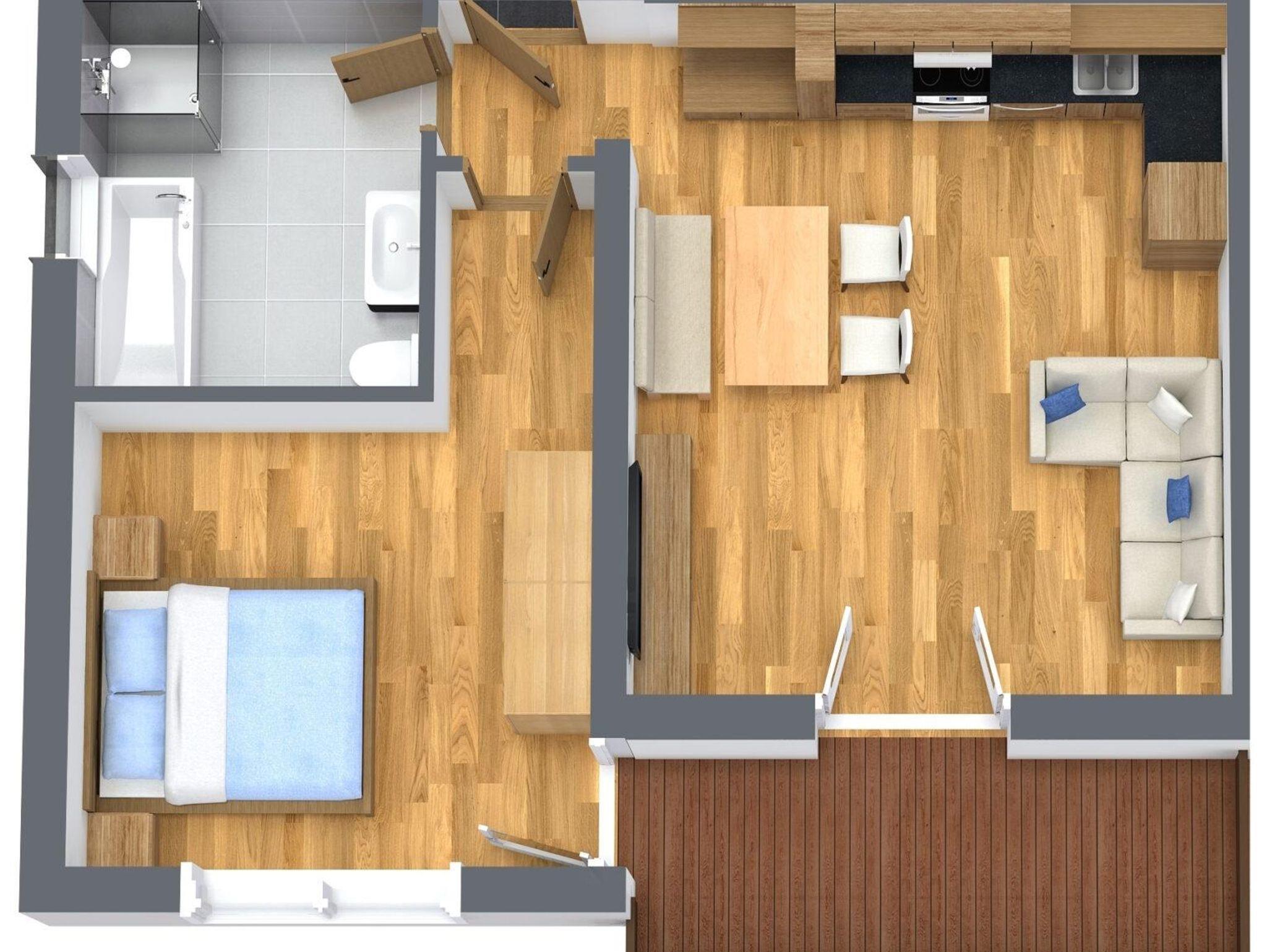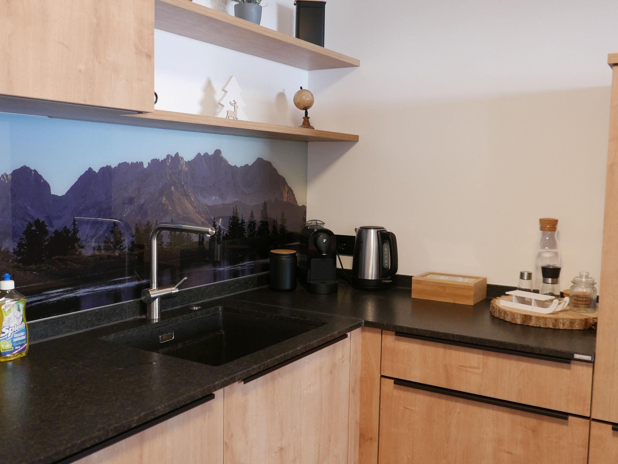 Genießen Sie den großzügigen Wohnbereich mit einer stilvollen Landhausküche, ideal für gesellige Abende. Die bequeme Couch lässt sich im Handumdrehen zu einem Doppelbett ausziehen. Vom Wohnbereich gelangen Sie auf den Balkon, von dem aus Sie den malerischen Blick auf den Brandstadl genießen können.