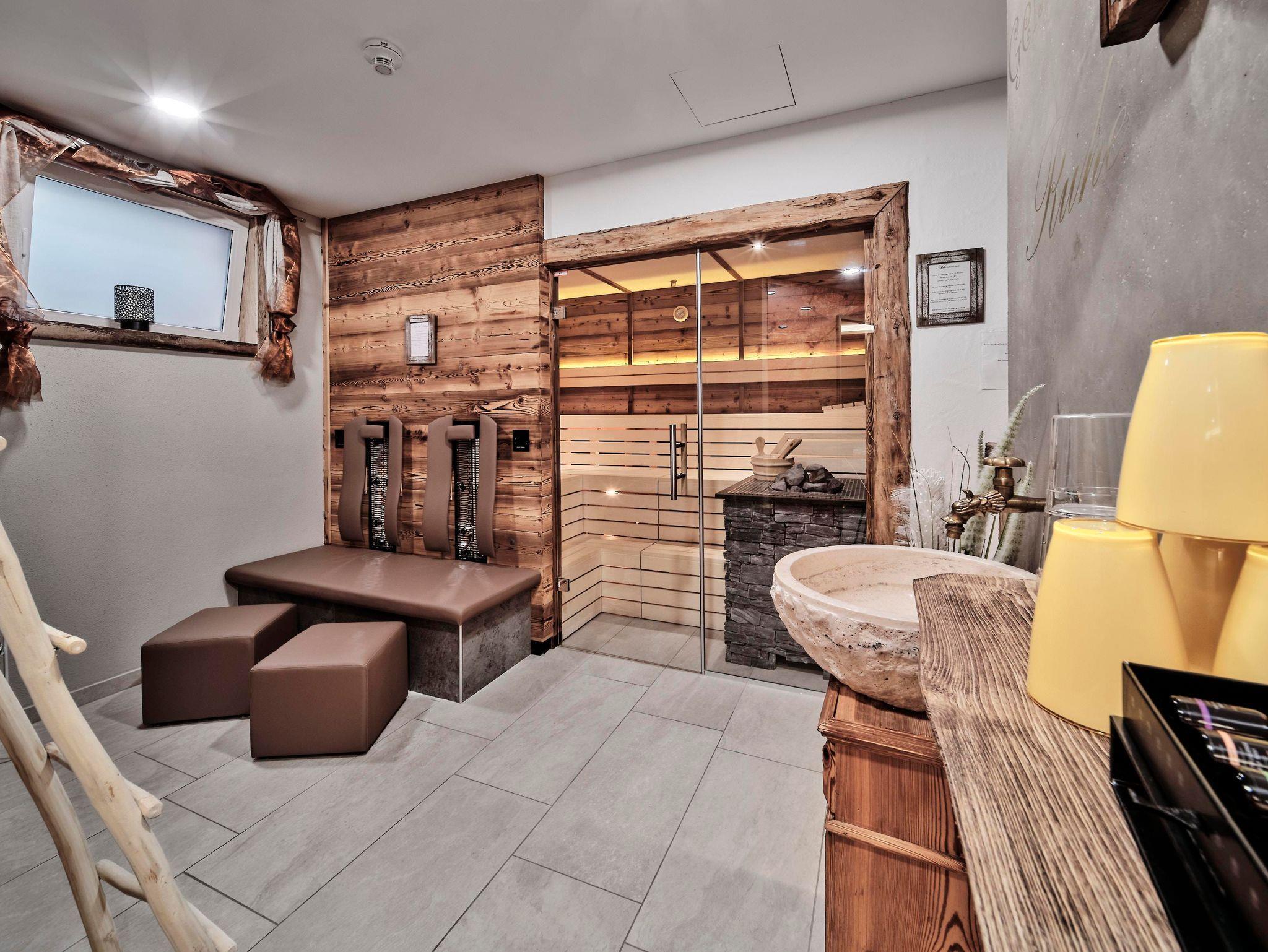 Saunalandschaft mit Almsauna, Kristalldampfbad, Infrarotlounge, Erlebnisduschen, Ruheraum und Tee-Eck (täglich von 15:00 Uhr - 18:30 Uhr).