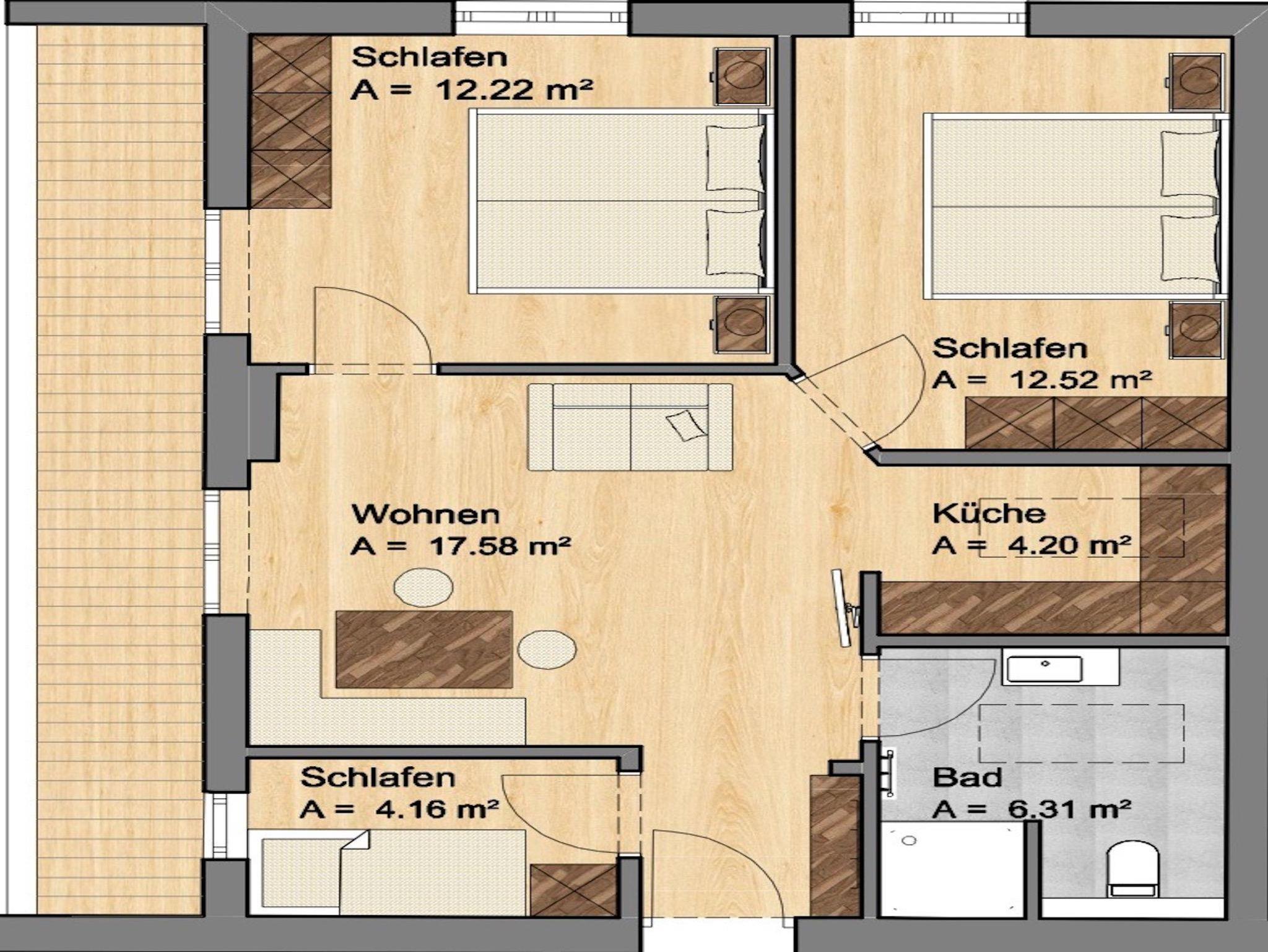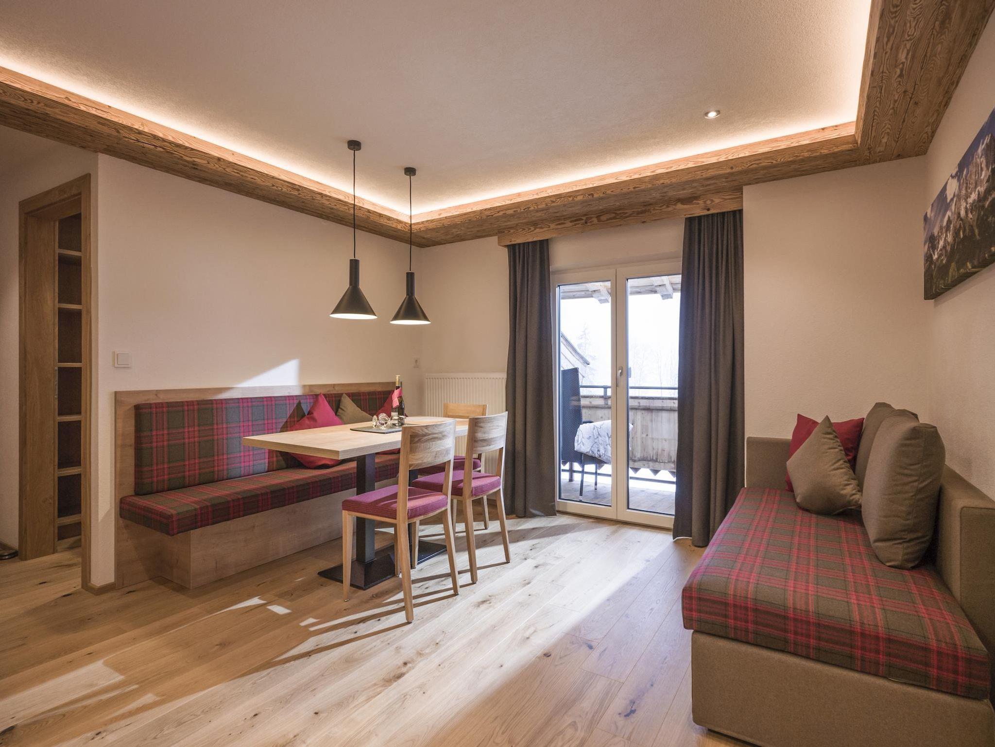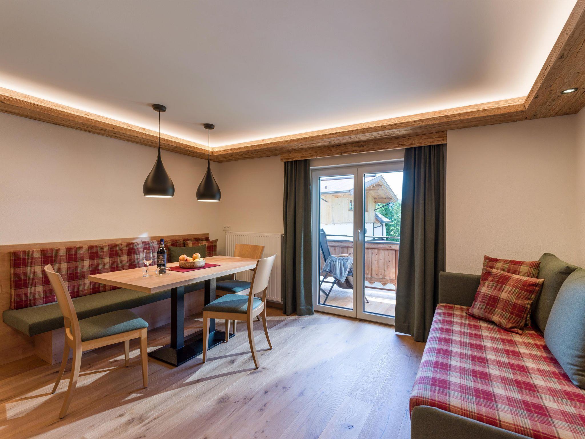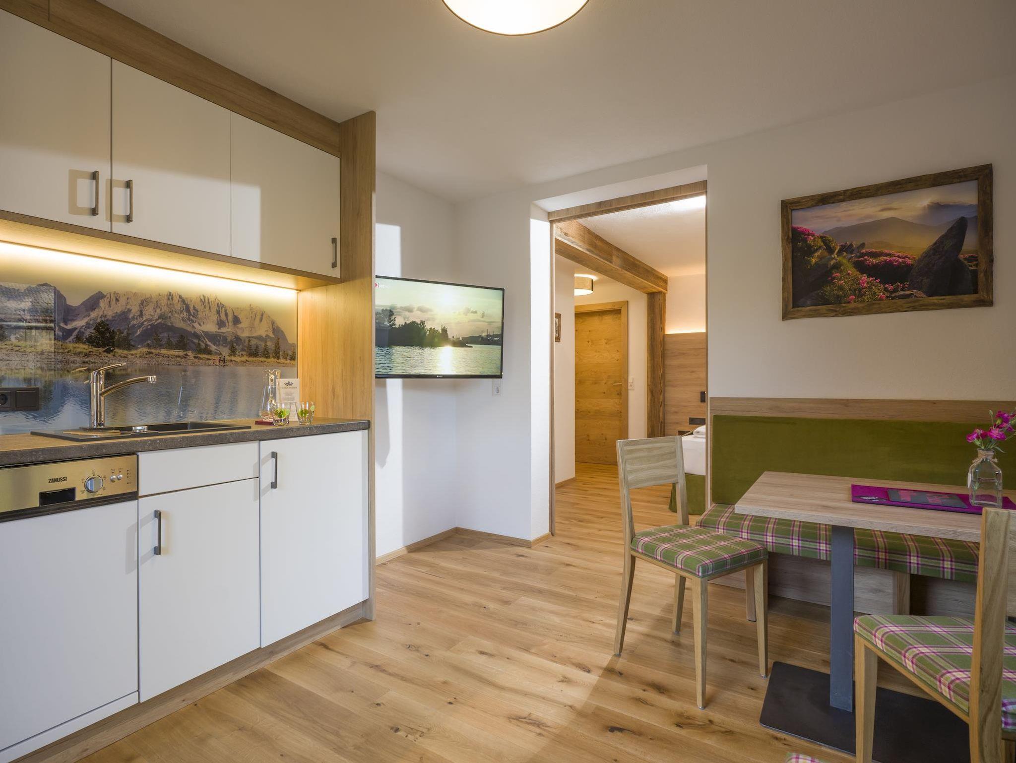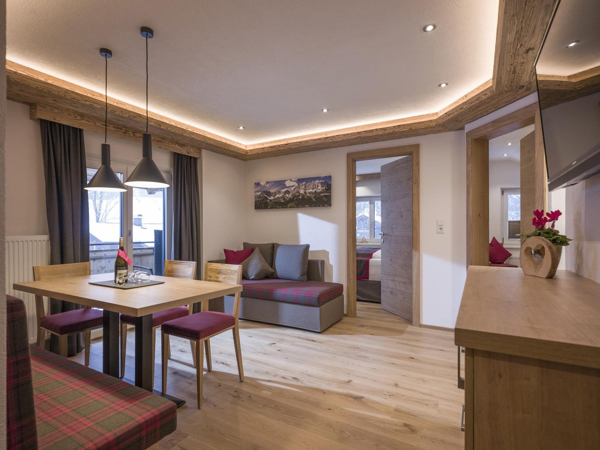 Unser 57qm großes Appartment Alpenrose für 2 - 5 Personen, verfügt über drei getrennte Schlafräume, welche mit Boxspringbetten in Komforthöhe ausgestattet sind. Es erwartet Sie ein gemütlicher Wohnraum mit Essbereich & Couch, sowie ein westlich ausgelegter Balkon. Die Küche ist vollausgestattet mit Geschirrspüler, Elektroherd und Backrohr.