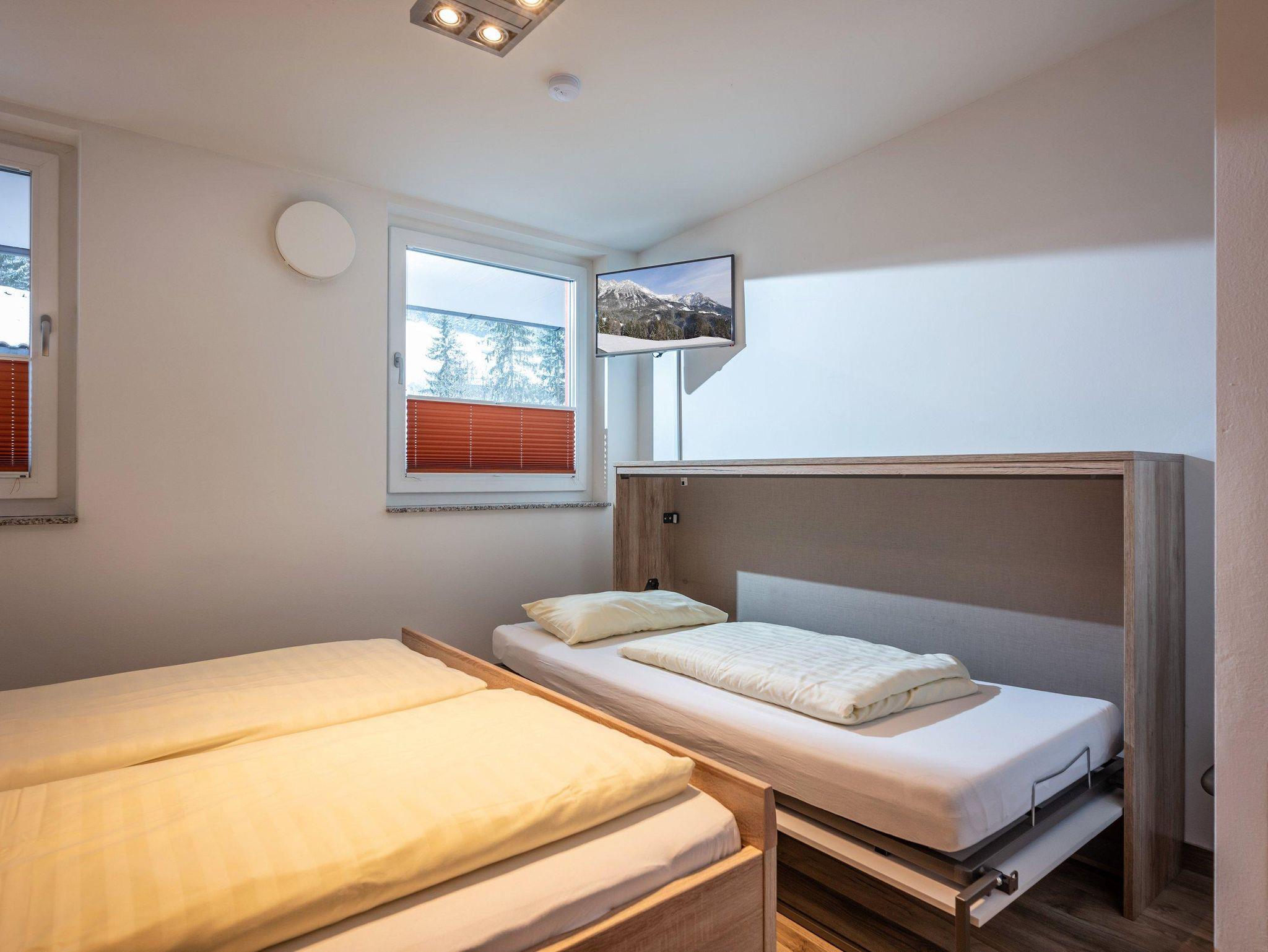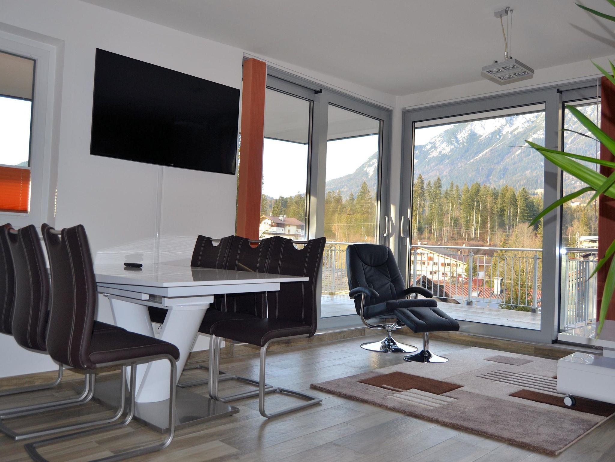 Das luxuriöse 104-qm Panorama Penthouse-Appartement für 6-8 Gäste bietet 2 Schlafzimmer mit Doppelbett und optionalem Einzelbett. Im Wohnbereich mit Panoramaverglasung befindet sich eine Doppelschlafcouch. Die Einbauküche ist voll ausgestattet mit Spülmaschine, Ess- und Kochgeschirr sowie einer offenen Bartheke. Eine riesige Dachterrasse erlaubt großartige Blicke auf den Wilden Kaiser. Badezimmer und extra Toilette. Die Wohnung kann mit dem separat buchbaren Studio-Appartement kombiniert werden.