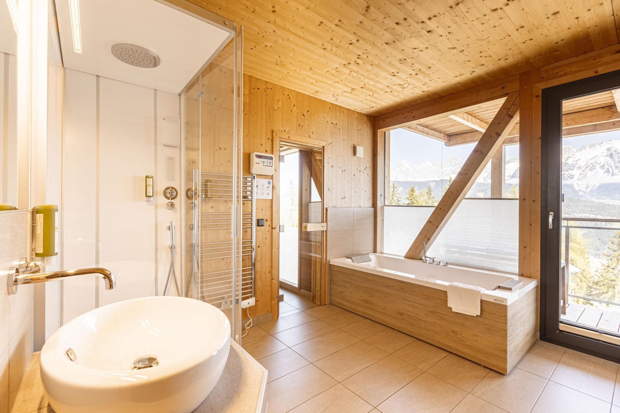 Ski-in ski-out Chalet Reiteralm ligger i hjertet av de østerrikske Alpene i en høyde av ca. 1200 meter, bokstavelig talt mellom skibakkene. Hyttene har unik arkitektur og en fasad med panoramabilder, og gir en fantastisk utsikt over Dachstein-massivet. Boligen er delt på to etasjer. I første etasje finner du inngangen med garderobe og en trapp som fører til første etasje. Her finner du ytterligere tre soverom med eikegulv. De to soverommene på forsiden har en vakker panoramautsikt og tilgang til terrassen. Ett soverom har et luksuriøst bad med regndusj, toalett og en designer servant. I første etasje er det også et eget velværeområde med to-personers boblebad, infrarød sauna og regndusj. I første etasje finner du en romslig stue med åpen kjøkkenløsning, sittegruppe og spisestue. På grunn av de karakteristiske panoramavinduene kan du nyte en fantastisk og flott utsikt. Det skråtaket og de store, solide takbjelker gir en romslig følelse. Fra stuen har du tilgang til den store overbygde balkongen, som er innrammet av glasspaneler. I denne etasjen finner du også et fjerde soverom og et luksuriøst bad med regndusj, toalett og designer servant. Schladming-Dachstein er kjent for de mange utmerkede restaurantene på pister. I Pichl er det en rekke sjarmerende barer og "Stubes", og for de som ønsker å ha den gammeldags "apres-ski" -opplevelsen, er Schladming rett rundt hjørnet. Selvfølgelig er denne hytta ikke bare tiltalende om vinteren, men absolutt verdt et besøk i sommer også. I tillegg til det store antall tur- og terrengsyklingstilbud, er det en mengde severdigheter i umiddelbar nærhet. Salzburg kan nås med en times kjøretur. De som elsker å spille golf, kan utfordre seg på de nærliggende golfbanene i Haus im Enntal eller Radstadt. På sistnevnte kan du ta Birdie Jet gondolen og ta en sving på en altitu