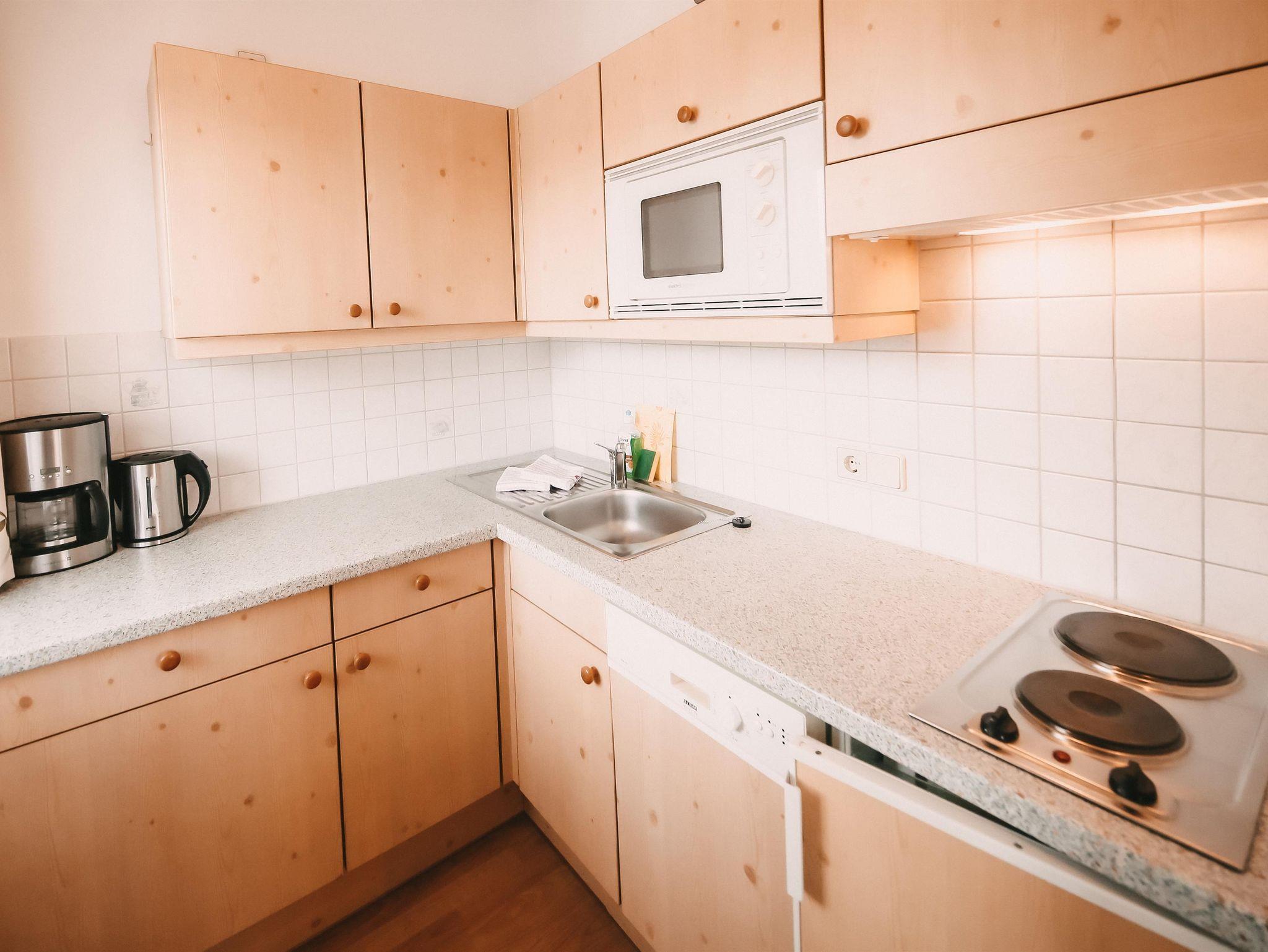 Die Küche ist ausgestattet mit Mikrowelle, Kochfeld, Geschirrspüler, Wasserkocher. Auch eine Kaffeemaschine steht bereit. Das Badezimmer ist vom WC getrennt und jeder Raum hat sein eigenes Kabel - TV Gerät.