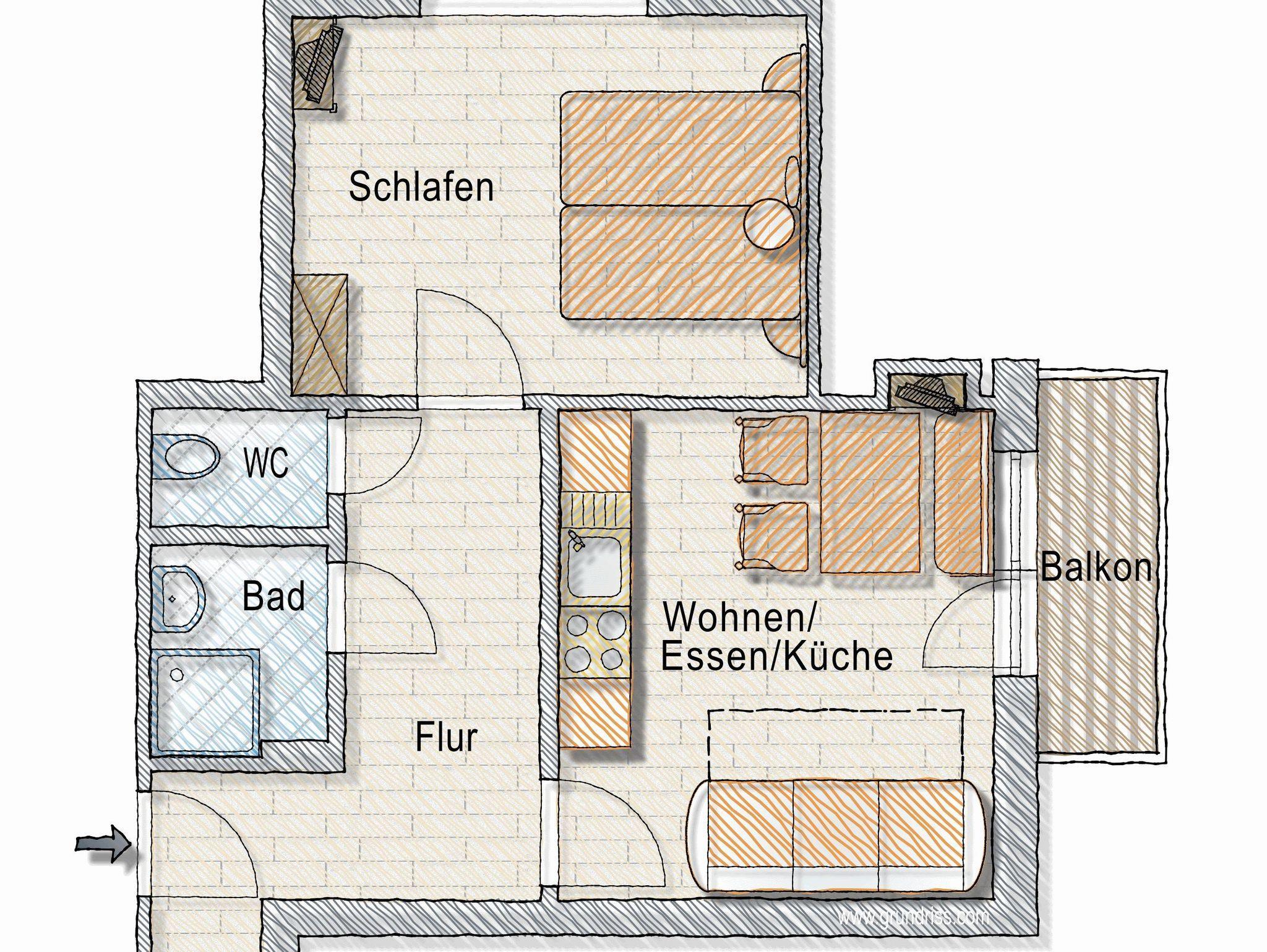 Appartement im Appartementhaus mit einem Doppelzimmer und einem Schlafsofa für zwei Personen in der Wohnküche. Der Ausblick vom Balkon nach Westen zeigt täglich die schönsten Sonnenuntergänge über den Bergen.