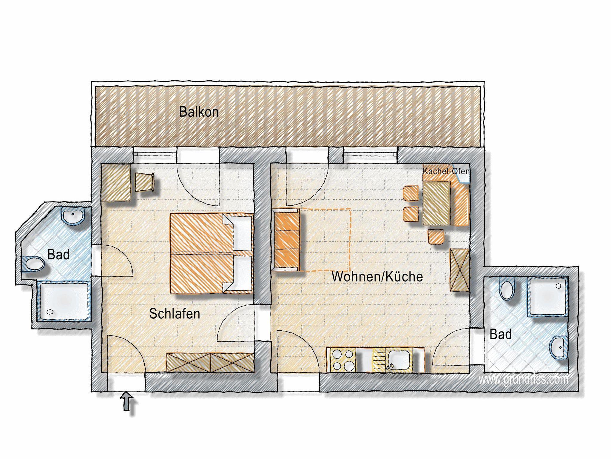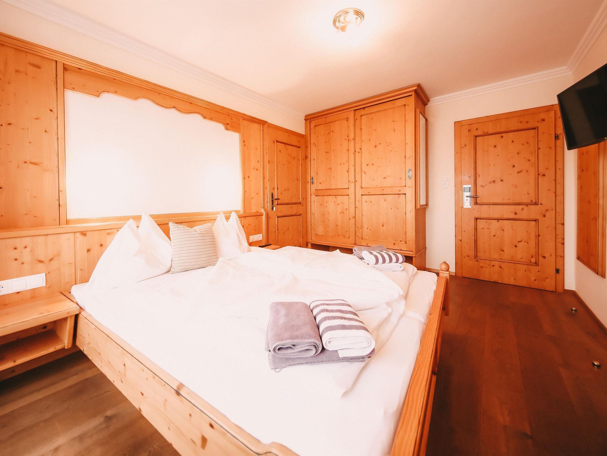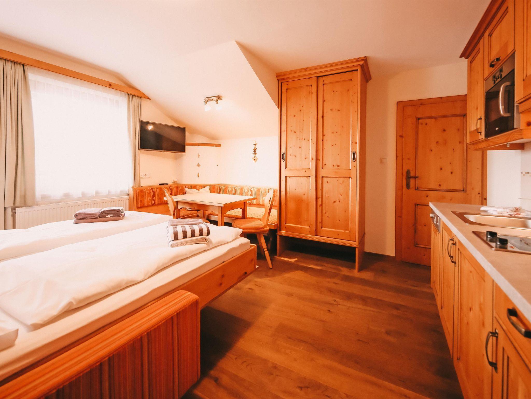 Appartement im Stammhaus mit einem Doppelzimmer und einem vollwertigem Klappbett für zwei Personen in der Wohnküche.