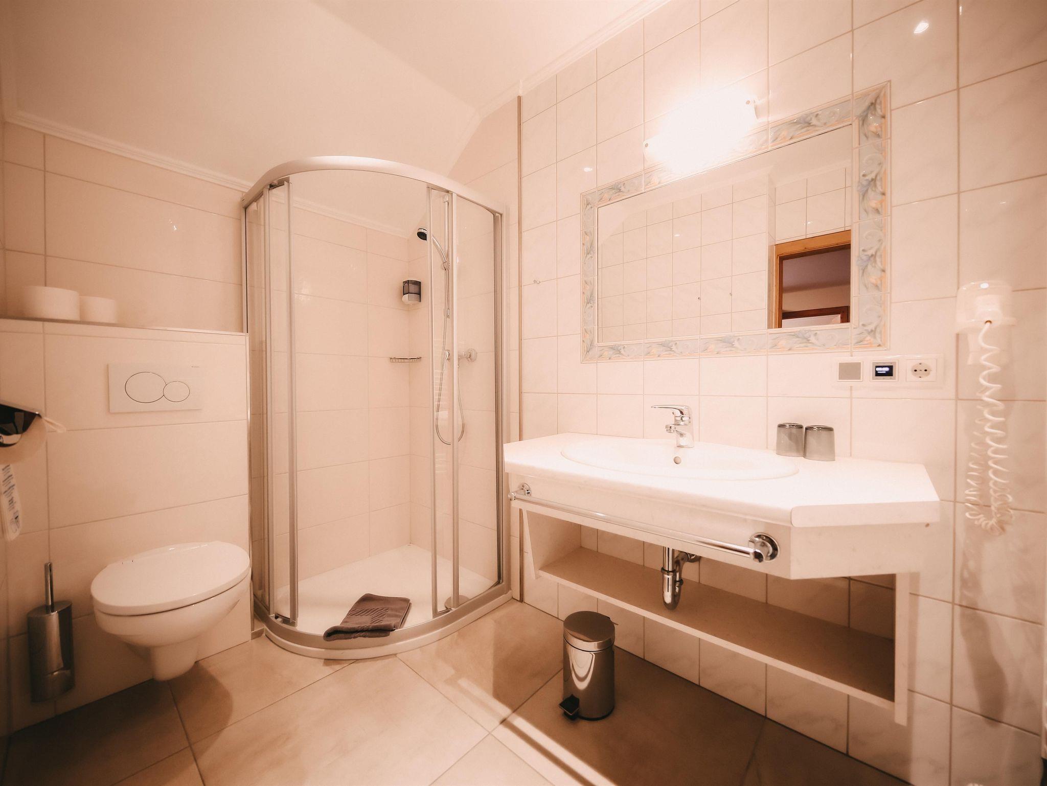 Zwei separate Badezimmer mit Dusche und WC. Ausblick vom Balkon nach Westen mit Dachstein Panorama.