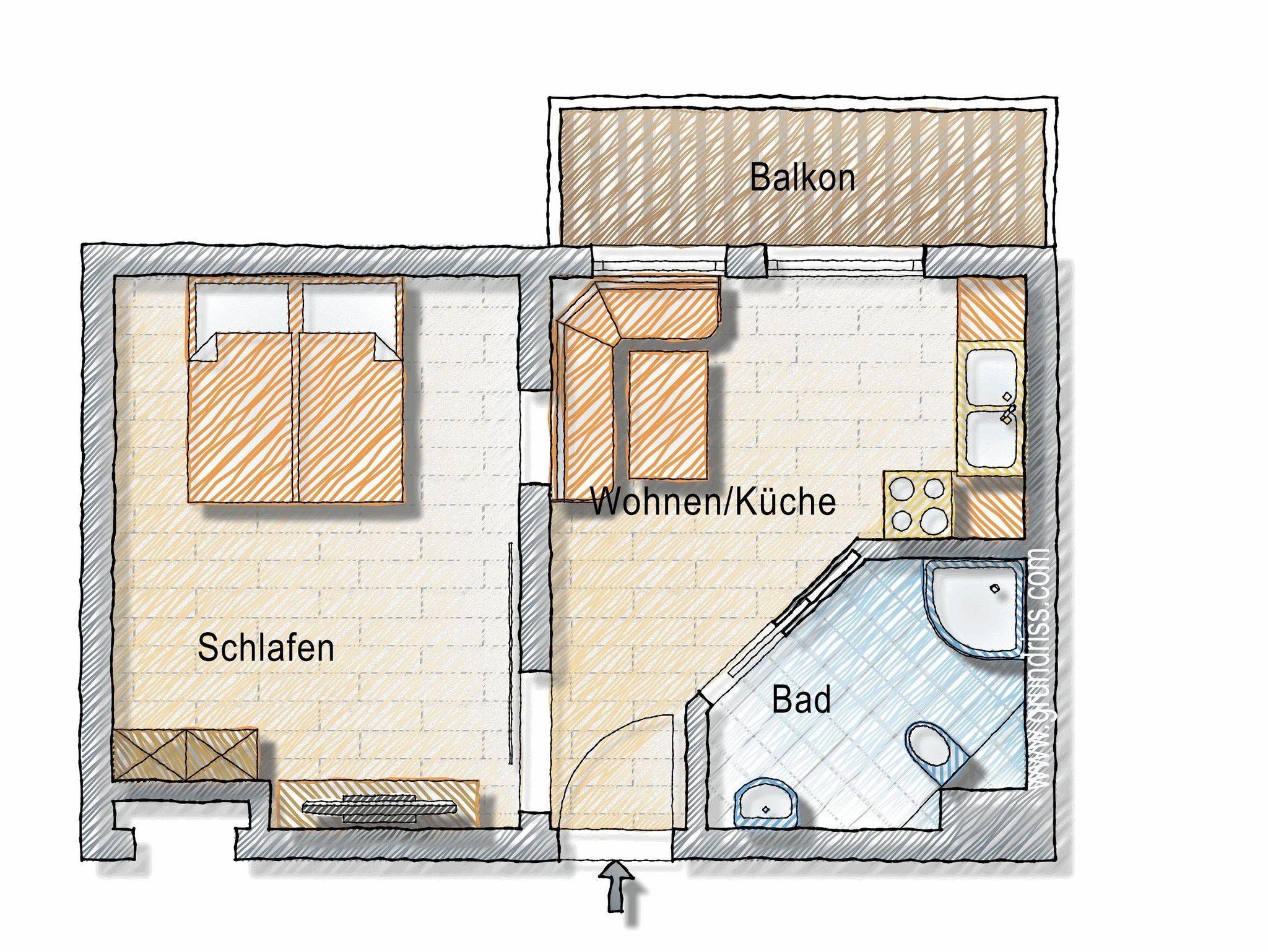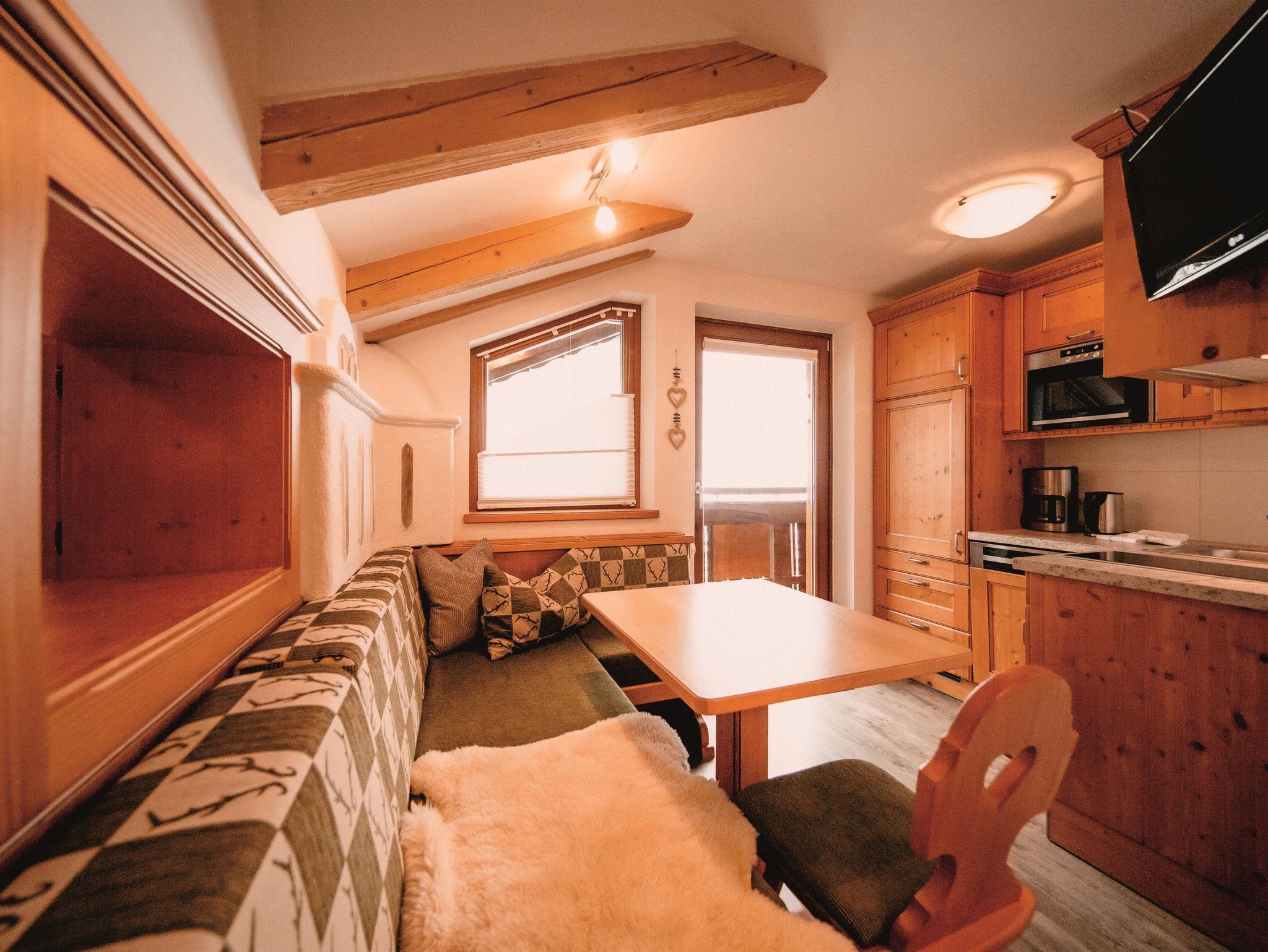 kleines Appartement im Stammhaus mit Doppelzimmer, einer gemütlichen Küche mit Esstisch und Kachelofen. Der Balkon nach Süden lässt die Morgensonne durch die Räume fluten.
