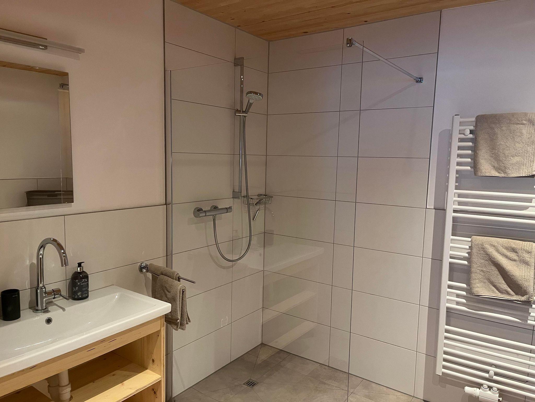 • Badezimmer mit Dusche, Handtuchtrockner und zusätzlichem separaten WC