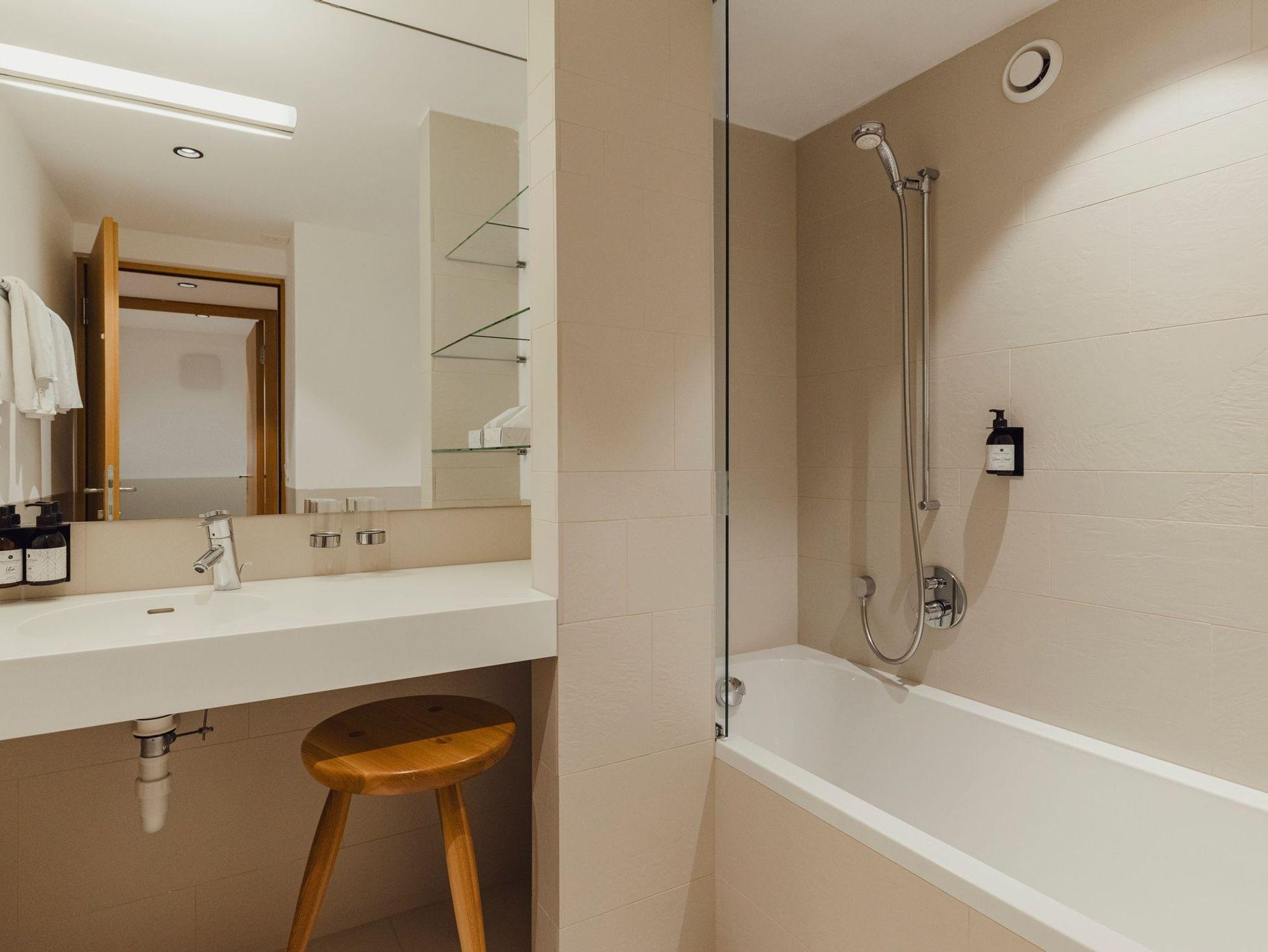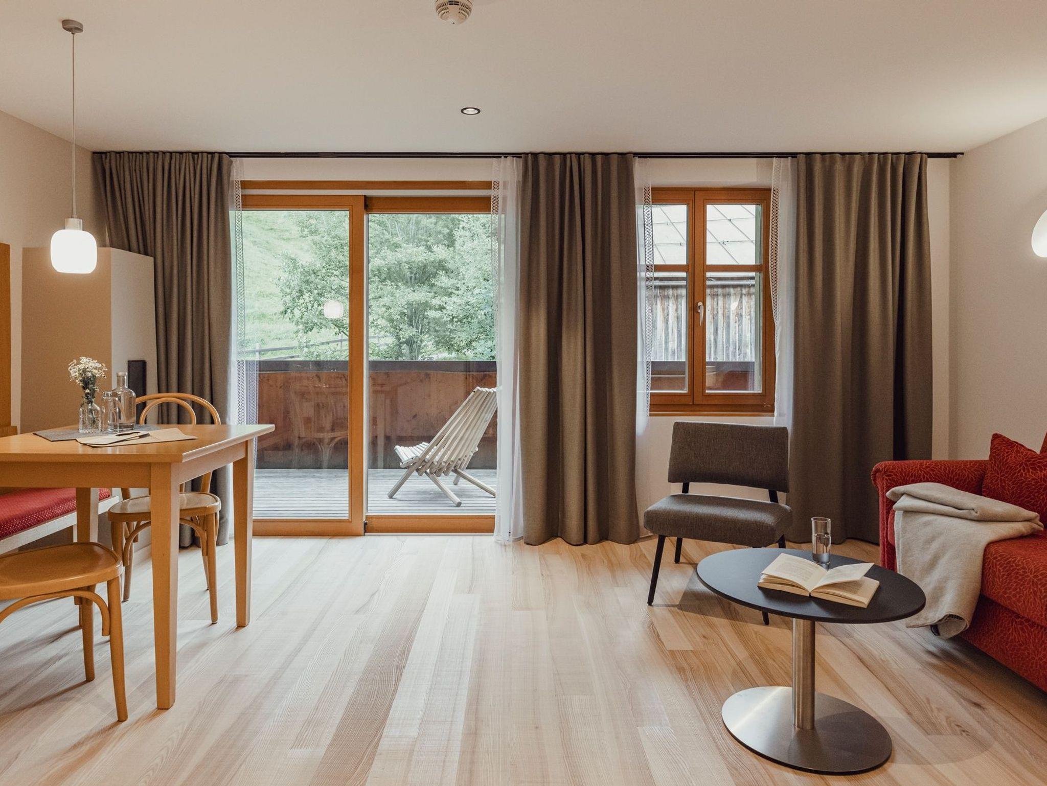 Ca. 43m² große Suite im zeitgenössischen Bregenzerwälderstil. Getrenntes Wohn- und Schlafzimmer. Badezimmer mit Badewanne, separates WC. Wohnzimmer mit Sitzecke, Couch und Lehmofen. Balkon, TV, Safe, Telefon, Wifi.