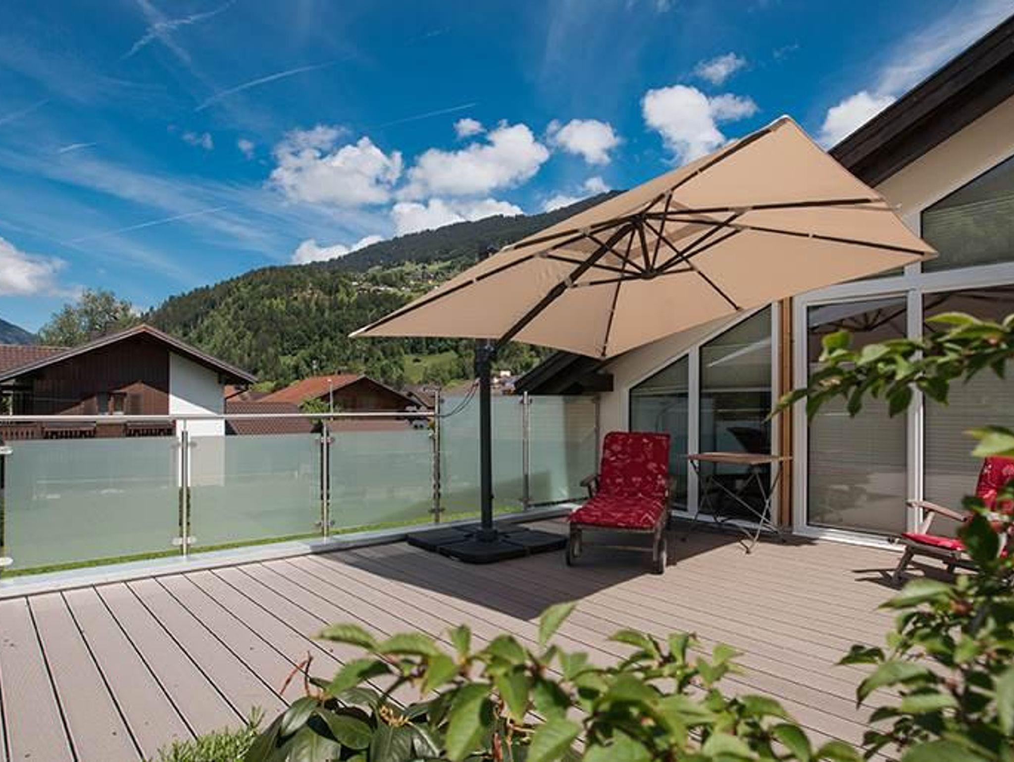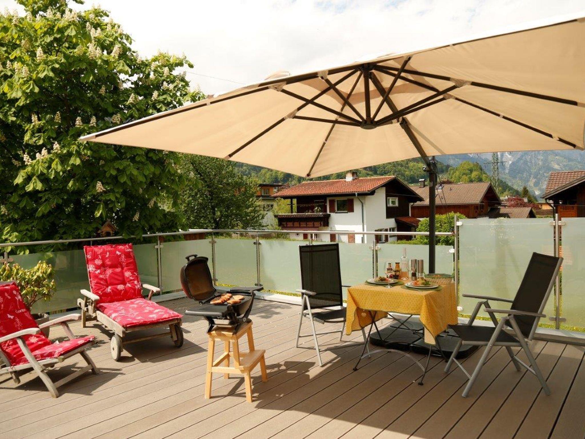 Die 35 m2 Terrasse gibt euch einen 290o Rundblick auf das die umliegenden Berge des Montafons, Rätikon,