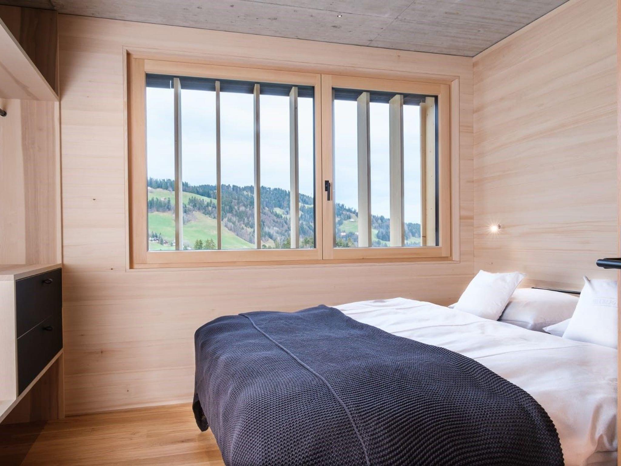 70 m² große Wohnung im 1.Obergeschoß mit 2 Schlafzimmern. Die 17 m² große Ostterrasse lässt sie den Sonnenaufgang genießen mit Blick über den Bregenzerwald und in die Bergwelt. Boxspringbetten 180x200 cm, hochwertige Schlafcouch im Wohnbereich 150x200 cm Eigene private Sauna, Dusche, WC separat, TV, Esstisch mit Sitzbank