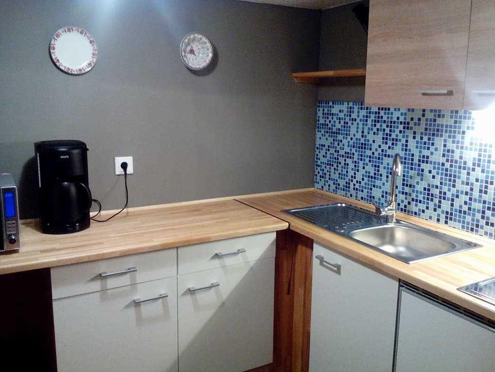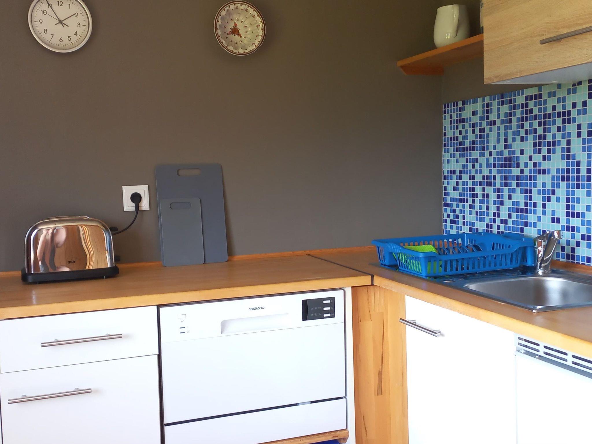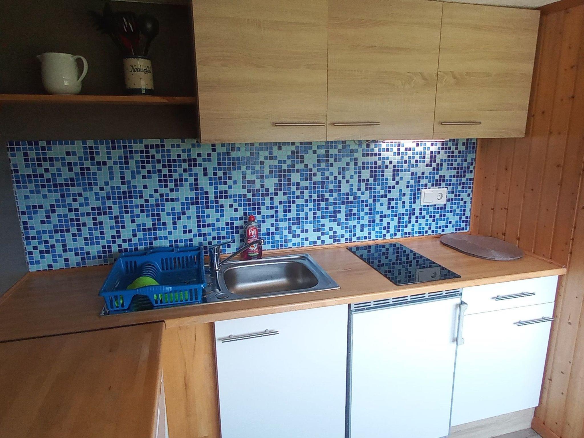 Die Küche ist mit zwei Kochplatten, Spüle, Kühlschrank mit Gefrierfach und ausreichend Geschirr, Besteck und Töpfen ausgestattet. Es stehen Ihnen außerdem eine Kaffeemaschine, ein Toaster und ein Wasserkocher zur Verfügung.