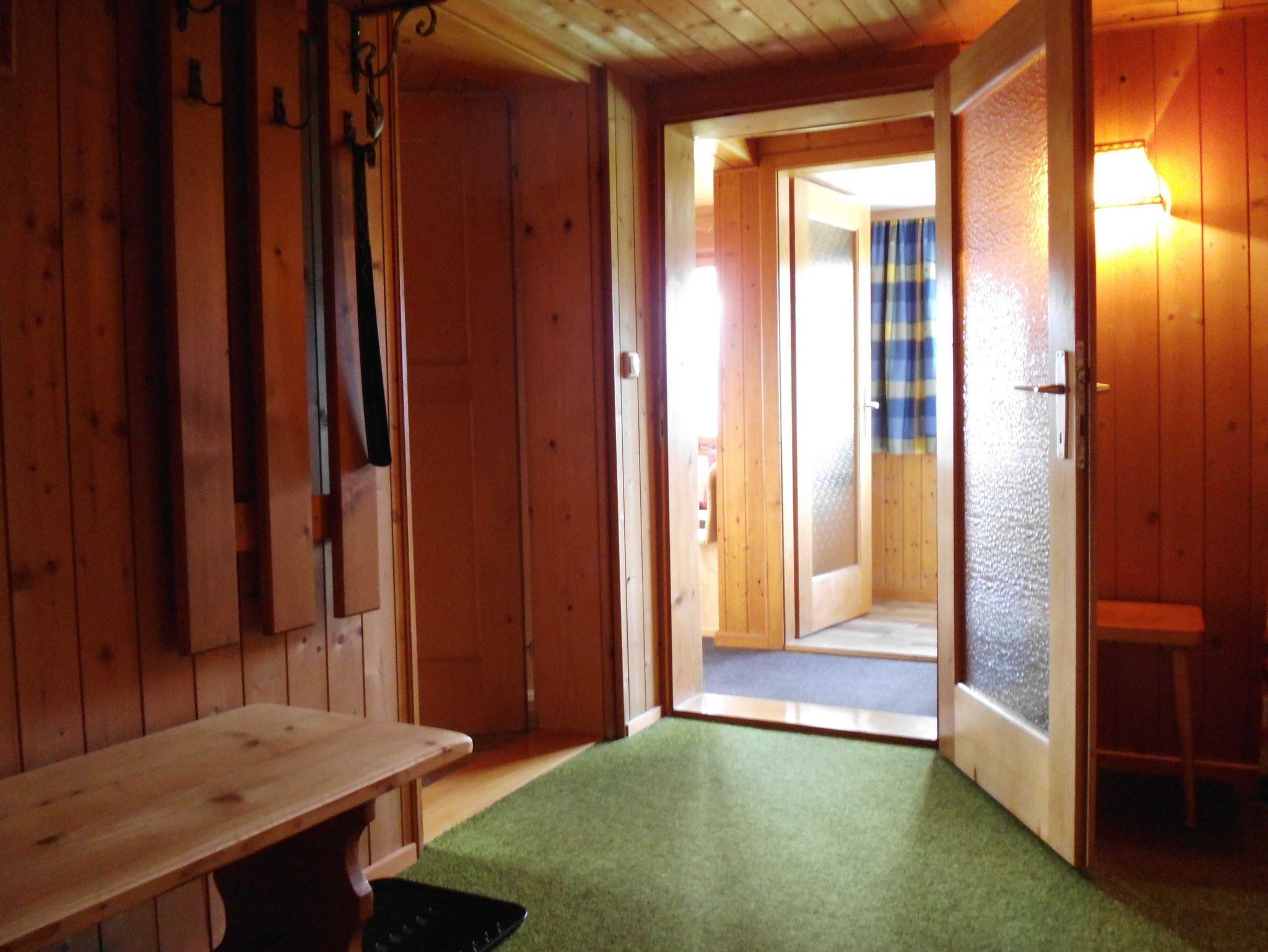 Im Eingangsbereich befindet sich eine Garderobe und eine kleine Sitzbank. Von da gelangen Sie ins Bad, in die Schlafzimmer und in den Küchenbereich.