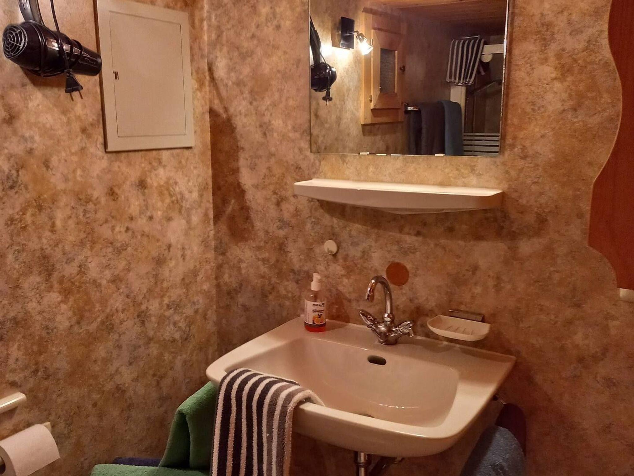 Das Bad verfügt über eine Dusche, ein Waschbecken und ein WC.