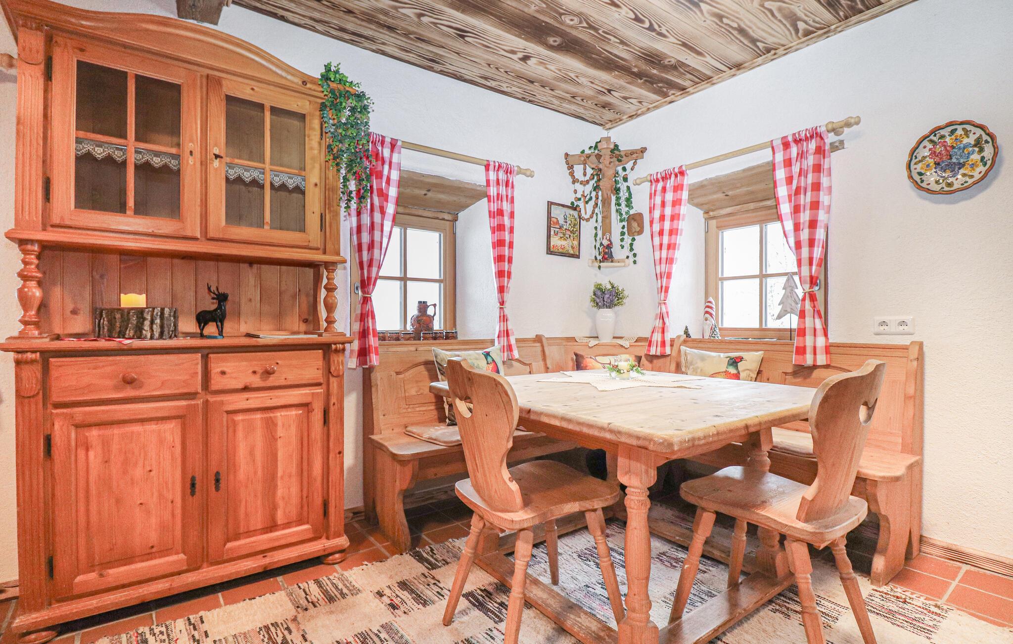 Bli ønsket velkommen av den varme atmosfæren i interiøret. Opphold deg i det rustikke spisekjøkkenet med solide tremøbler og tradisjonelle detaljer. Slå deg ned på benken ved det store spisebordet og nyt måltidene sammen i en koselig atmosfære. Føl den spesielle bokvaliteten som skapes av naturlige materialer, varme farger og den autentiske tyrolske stilen.