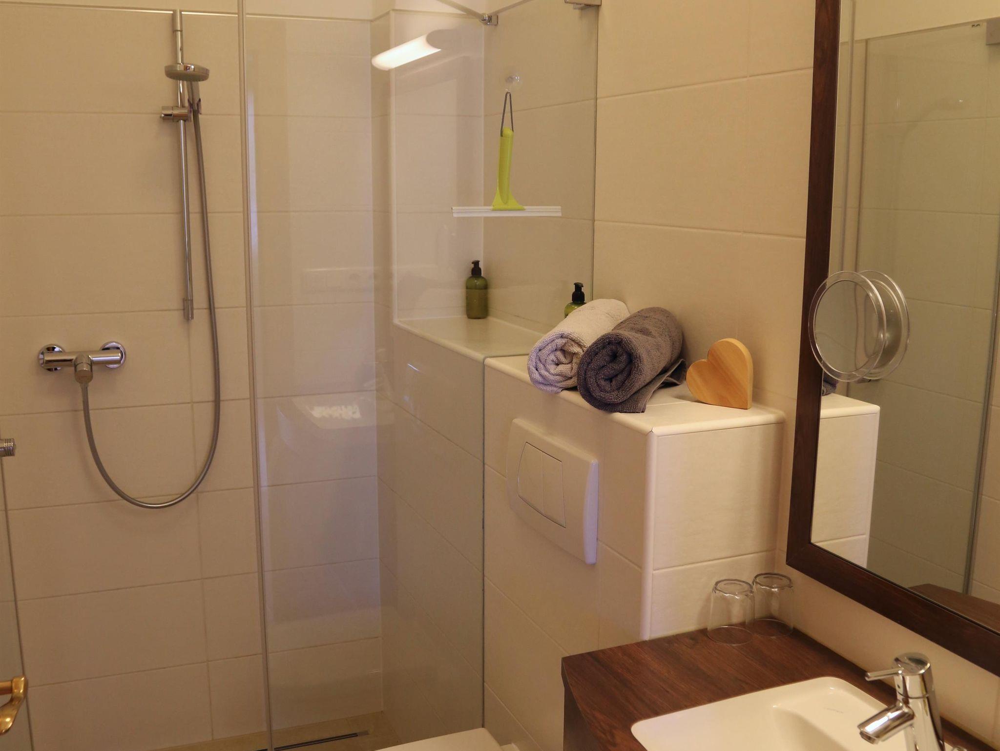 neues Bad mit Dusche, Waschbecken, WC und Föhn.