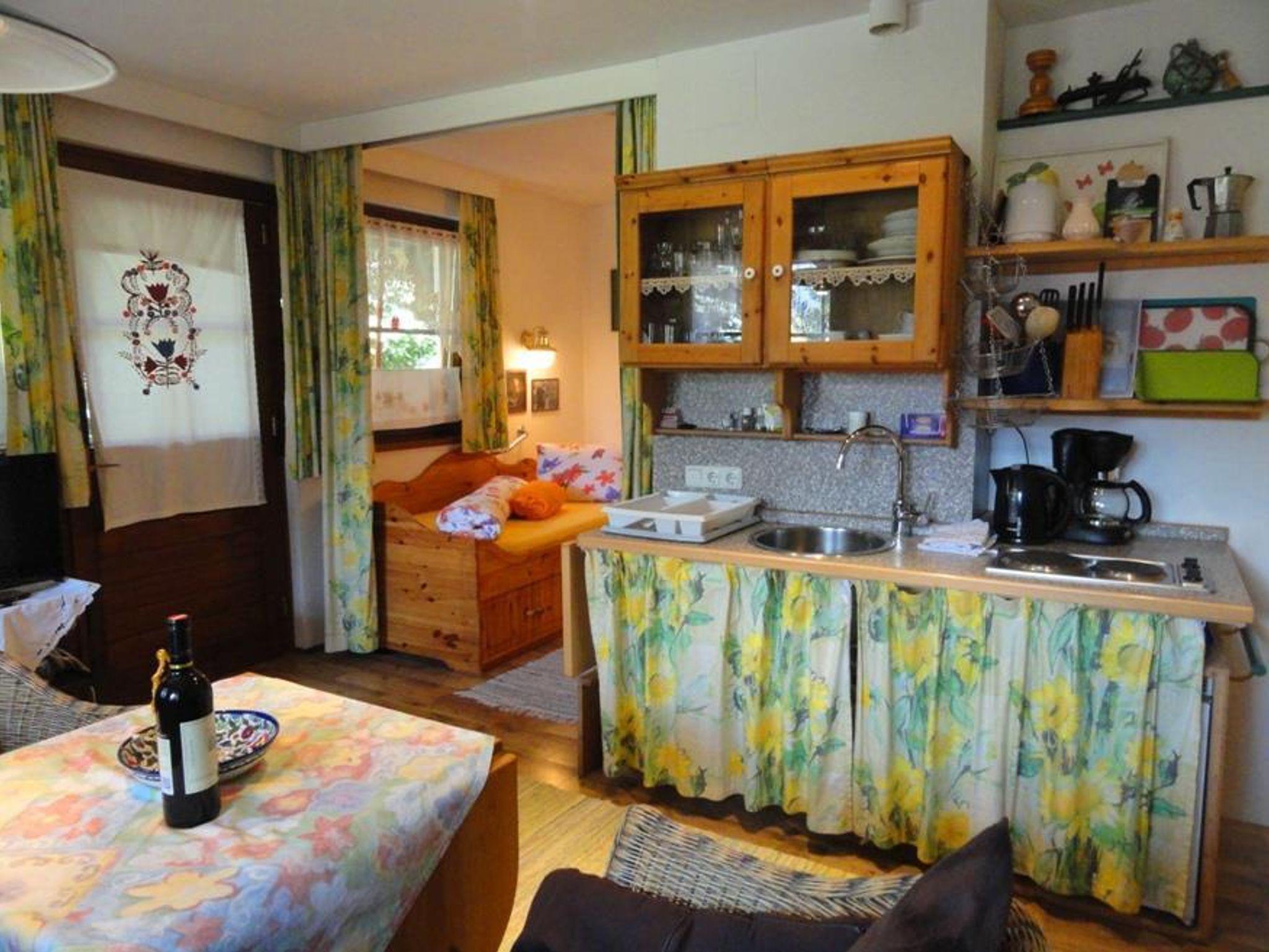 Wohnschlafraum mit Küchenblock, SAT-TV, Flachbild, Kachelofen.