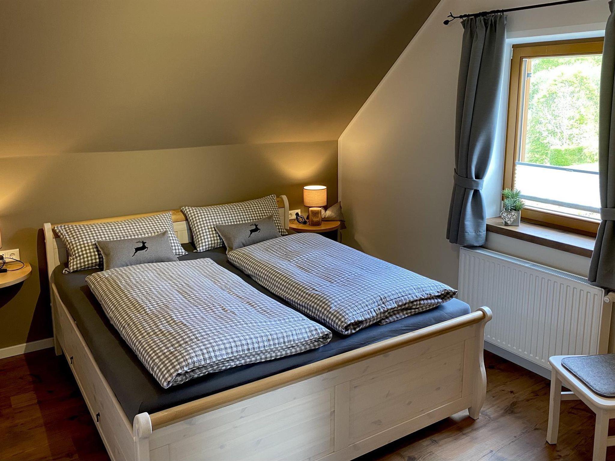 drei Schlafzimmer im Landhausstil mit Holzbodenoptik, Vollholzmöbeln und Doppelbett, liebevollen Details und Mansarde – zwei davon mit Balkon; allesamt mit Fensterläden zum Verdunkeln, zusätzliches Duschbad / WC mit Waschbecken;